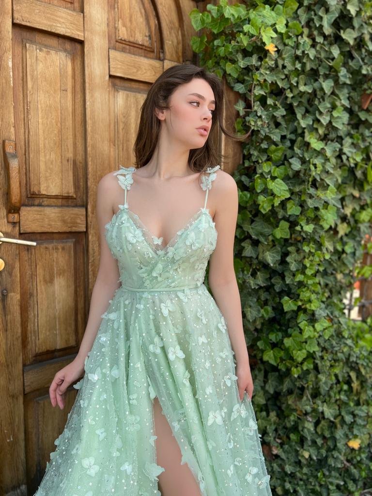 Introducing our elegant masterpiece, adorned with the enchanting Ivy butterfly lace and delicately embroidered straps that gracefully trace the shoulders. Dive into the sensuous V-neck bodice, complemented by a fully boned corset, merging seamlessly into a stylish wrap top that accentuates a cinched waist. The A-Line skirt gracefully flows, offering a figure-flattering silhouette that embodies sophistication. Discover the allure of a daring leg slit and the convenience of inseam pockets, all leading to a floor-sweeping finale. To add an irresistible touch, the lace-up backless design ensures you leave an unforgettable impression every time you turn.