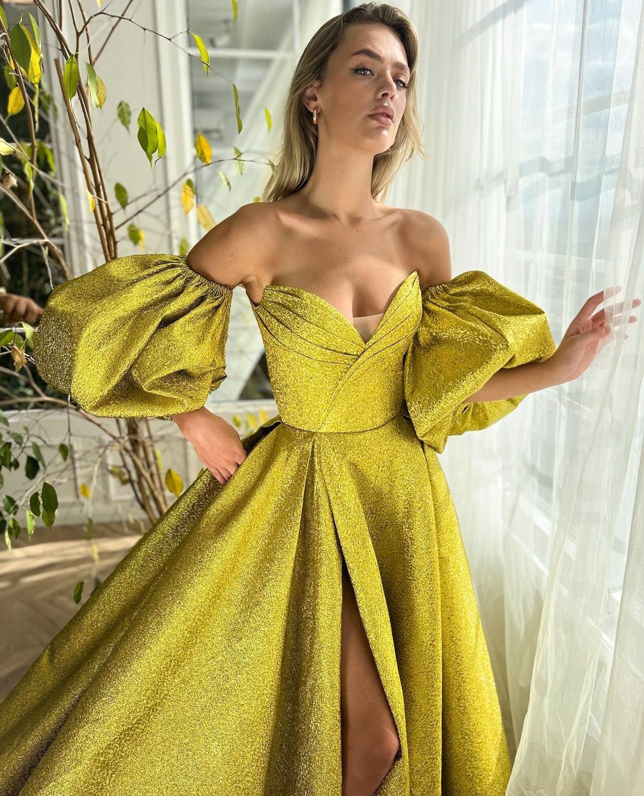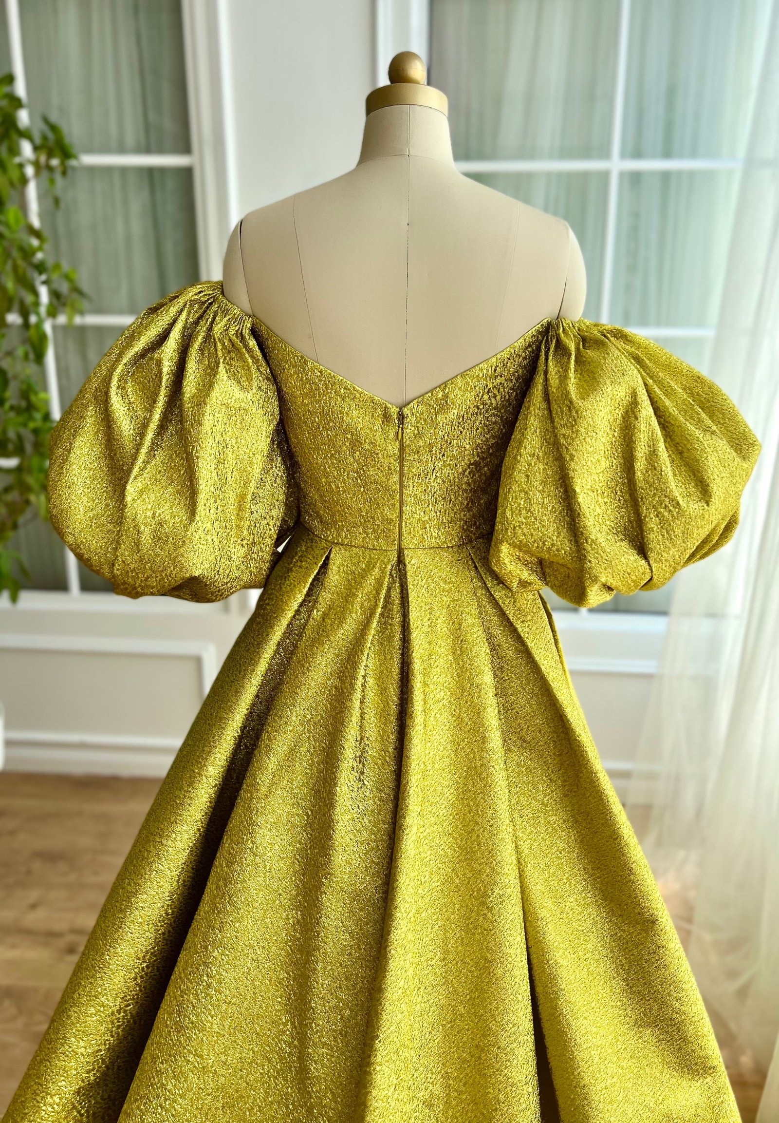 Elevate your elegance in our stunning gold taffeta gown, crafted with a luxurious sheen that radiates pure sophistication. The sweetheart neckline, combined with a delicately draped bodice, introduces a touch of romanticism, while a transparent v-opening front adds a hint of allure. An exquisite waist definition effortlessly transitions to off-shoulder gathered puffy sleeves, evoking a sense of regal charm. The dress's A-line silhouette cascades down into a floor-sweeping, pleated skirt, punctuated by a daring leg slit. And for a blend of style and functionality, discreet inseam pockets are seamlessly integrated. Perfect for those special occasions when you aim to leave an unforgettable impression.