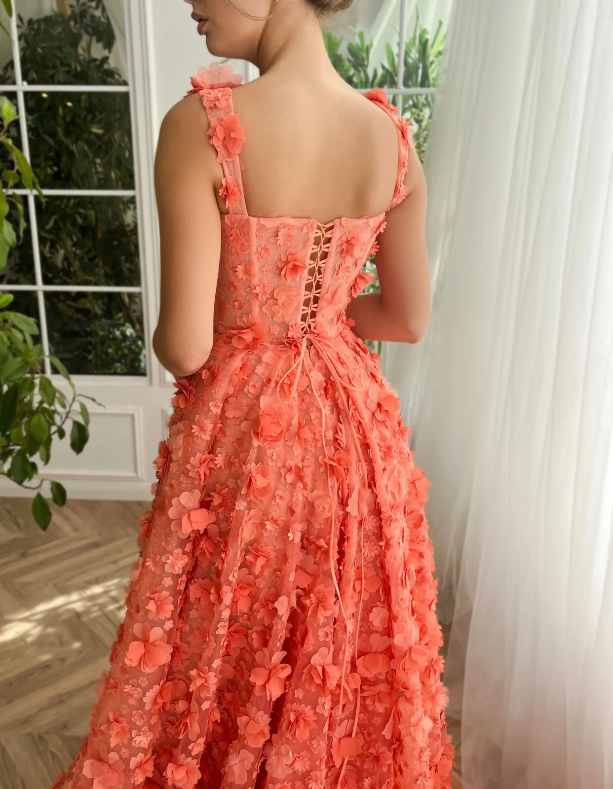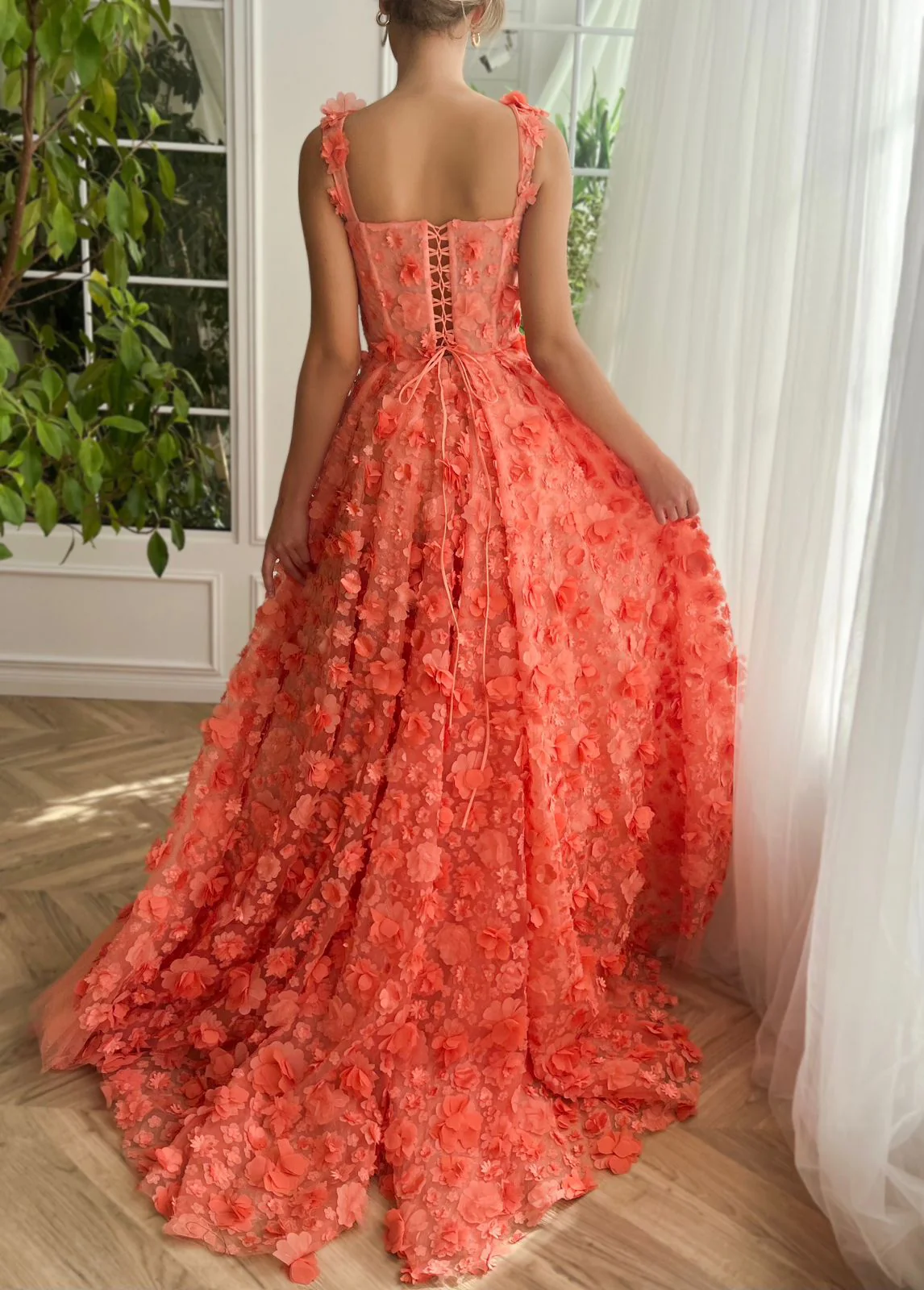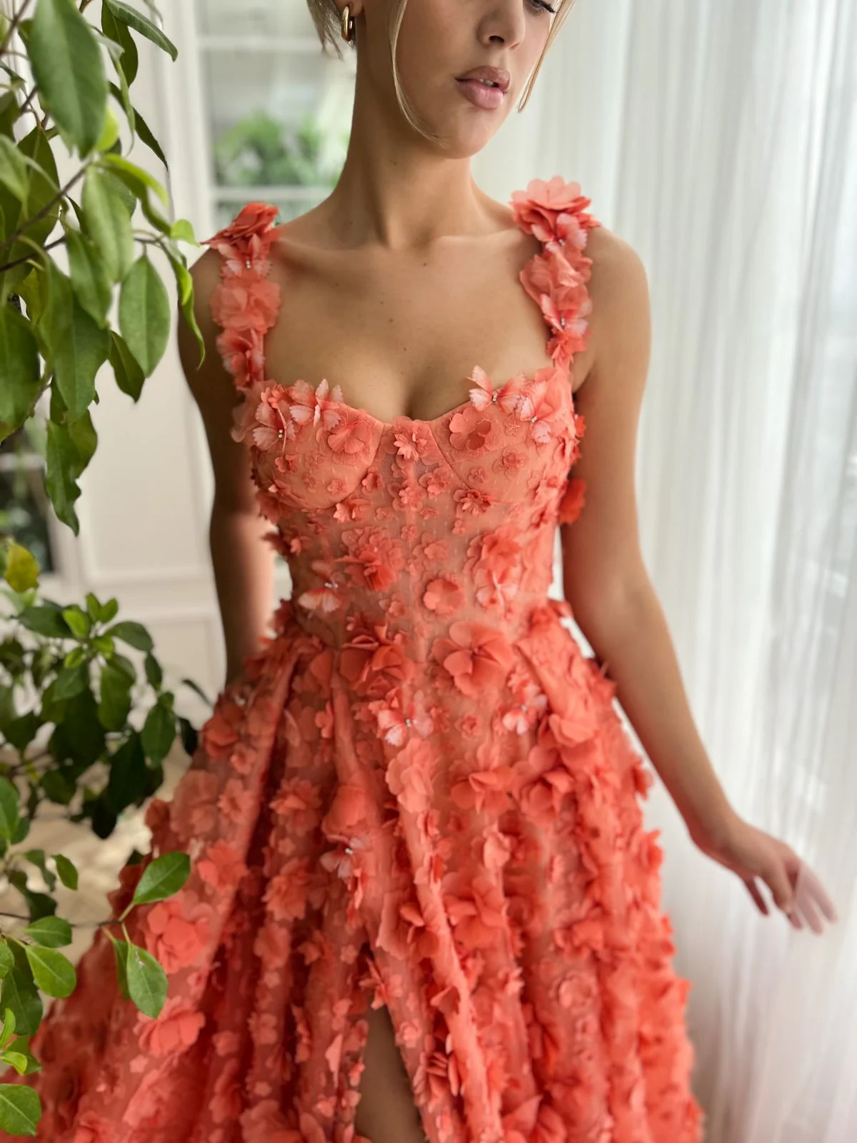 Indulge in the epitome of elegance with this exquisite Coral Peach Gown. The artistry on display is palpable, from the intricately flowered detailed lace to the dotted tulle underlayer, each element comes together to create a romantic whimsy. The hearty neckline shape beautifully complements the structured bustier corset, equipped with built-in pads and boning to provide a flattering fit. An A-line silhouette gracefully cascades down, leading to a surprising touch of modernity with a leg slit, allowing for movement and a hint of allure. Impeccable inseam pockets add a touch of practicality to this whimsical ensemble. The lace-up back ensures a customized fit, creating a dreamy, cinched silhouette. But, the real allure lies in the details – the gown is thoughtfully embellished with embroidered flowers and delicate powder butterflies, adding an ethereal touch to this enchanting attire. This gown is not just a piece of clothing, it’s a statement of sophistication and elegance, perfect for making your grand entrance unforgettable.