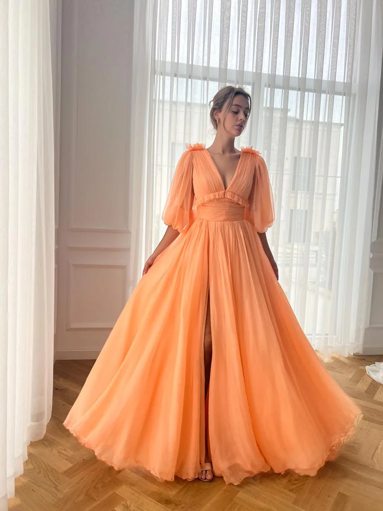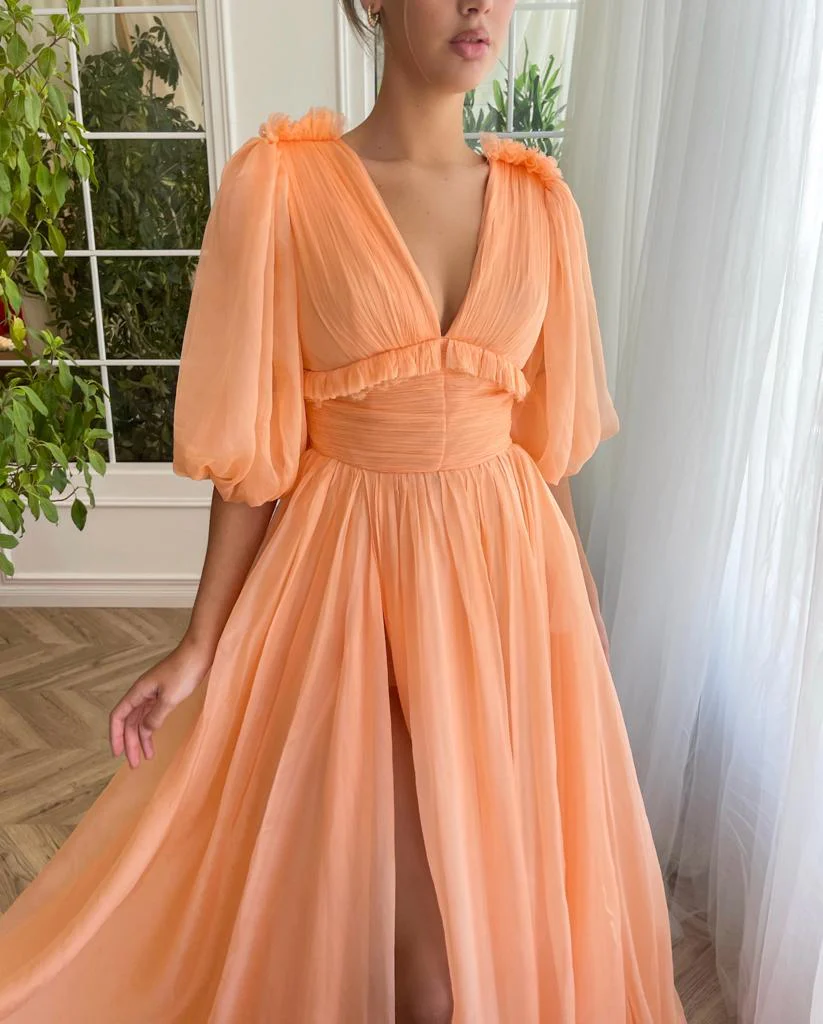 Indulge in opulence with our ethereal ensemble crafted from luxurious pure soft silk fabric that swathes your form in a caressing embrace. Painted in a poetic Savannah Sun hue, this attire exudes a genteel charm, a perfect ode to the golden hours of tranquil afternoons. The elegant narrow V-shaped neckline beautifully descends into a draped bodice that seamlessly melds into a cinched waist, sculpting a feminine silhouette. The journey of finesse continues to unfold as the fabric graciously cascades into an A-line silhouette, eventually resting in a floor-sweeping skirt with a daring leg slit, inviting gazes yet leaving them yearning. Complimented by medium puffy sleeves, the dress adds a soft, romantic puff to your aura. The whimsical detailing in this attire beckons the graceful poise of a modern-day enchantress ready to seize the day with elegance and comfort entwined in silken whispers.