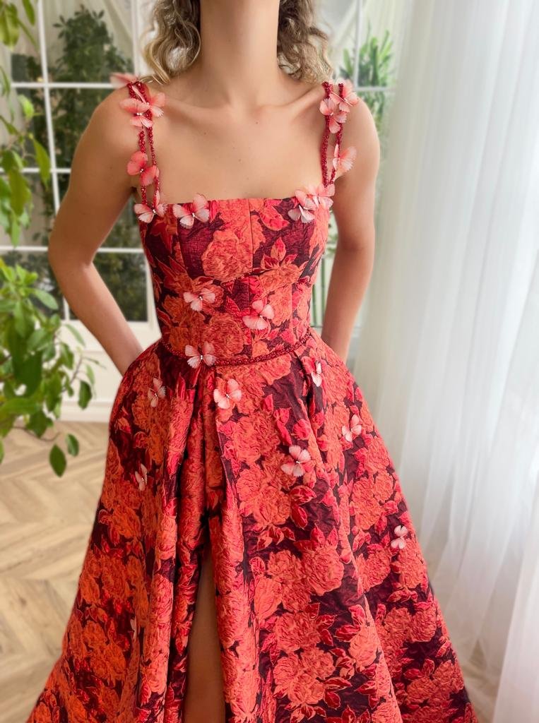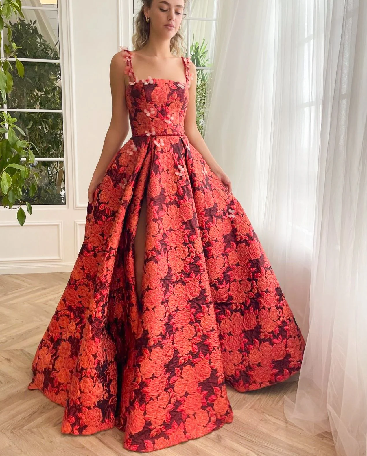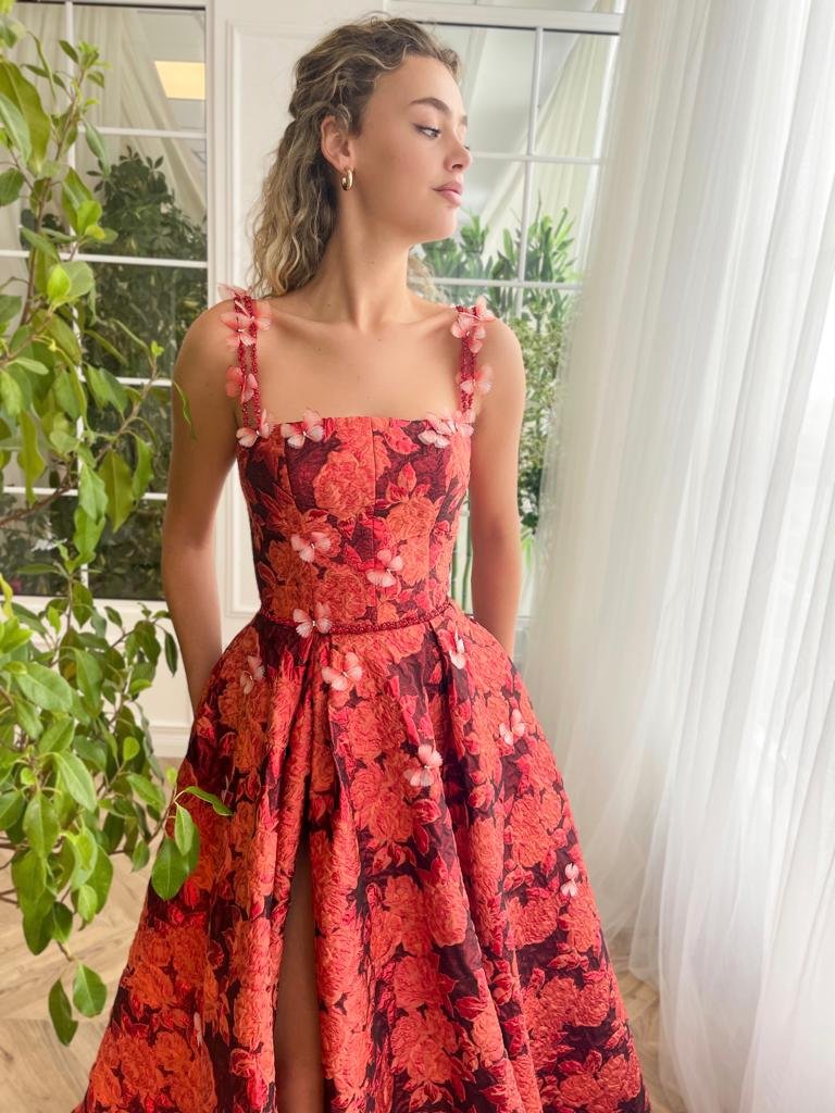 Immerse in a cascade of autumnal elegance with this meticulously designed brocade fabric gown. The square neckline eloquently transitions into a classic A-line silhouette, reflecting a harmonious blend of tradition and contemporary grace. The gown’s complexion is a vivid narrative of fall, with colors seamlessly intertwining around the wide pleated skirt, flowing gently down to a tasteful leg slit. Practical yet refined, the inseam pockets add a touch of modernity, effortlessly merging with the floor-length finish that trails into a soft train. Every movement is a poetic dance, with embroidered crystal straps shimmering softly against the fabric, leading the eye to whimsical powder butterflies, which seem to have alighted momentarily, adding a final touch of enchantment. This gown isn't just a dress, but an ode to the romantic essence of autumn, awaiting the elegant stride of those ready to embrace its charm.