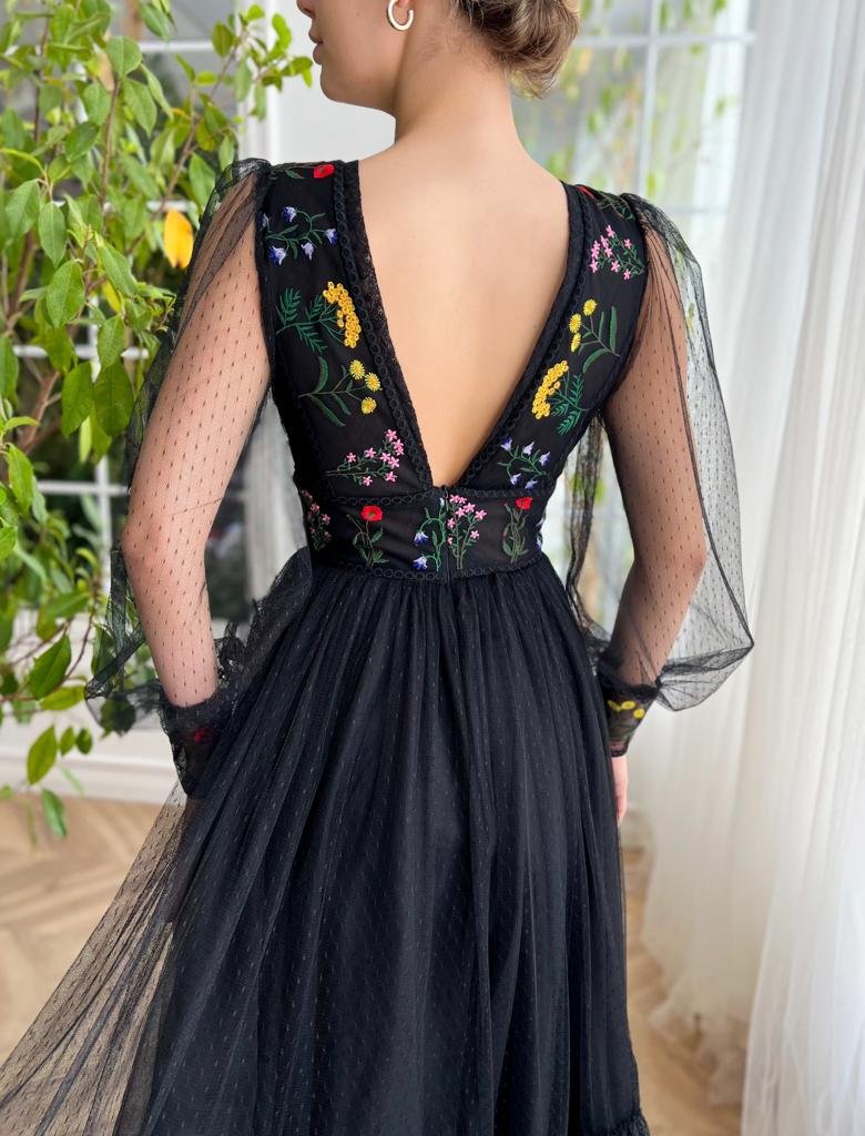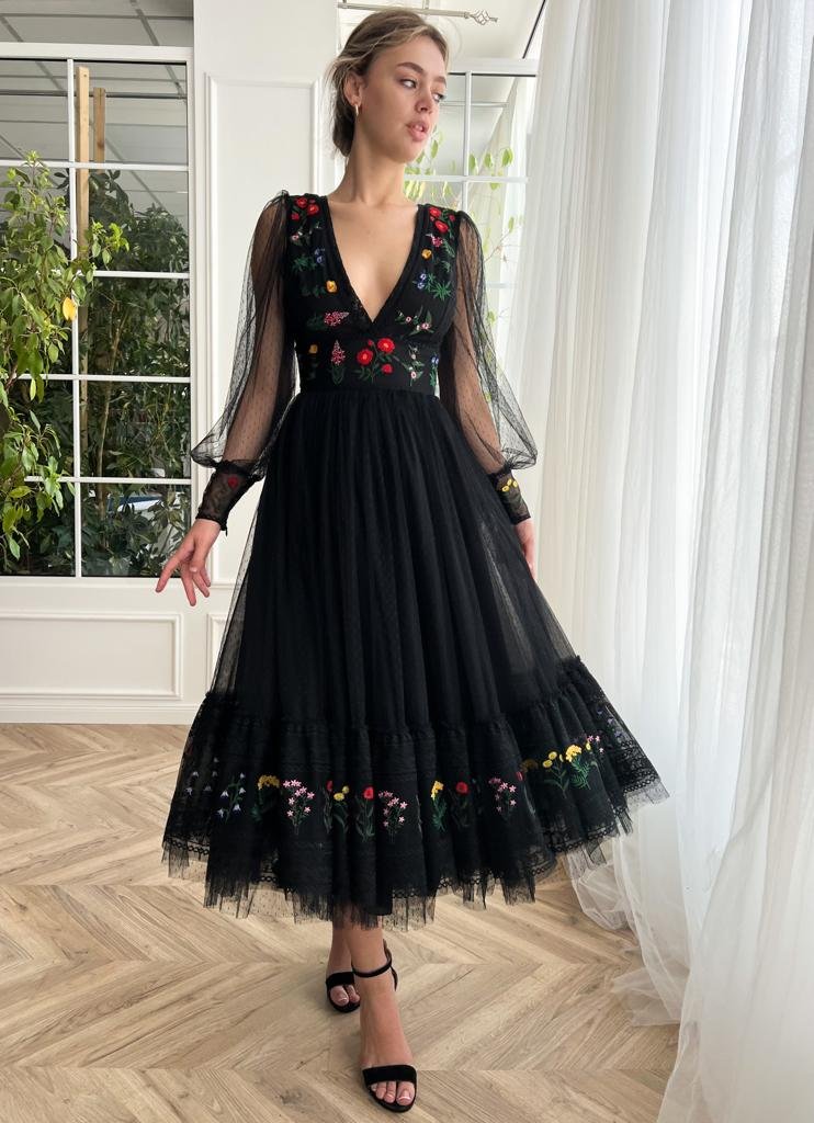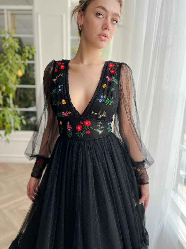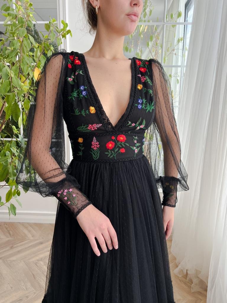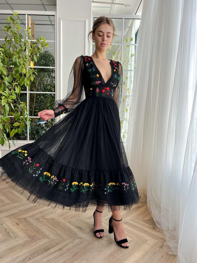 Step into the essence of refined elegance with this meticulously crafted dress. Made from a soft dotted black tulle fabric, every inch whispers understated beauty with its embroidered whimsical flower details. Its flattering V-neckline is complemented by a fully sculpted bustier top that fits closely to your figure. The cinched waist effortlessly transitions into a tiered gathered hem, culminating in a graceful midi-length skirt. But this dress isn’t just about visual appeal; with long puffy sleeves adding a touch of romance and the practicality of inseam pockets, it perfectly marries form and function. Let every moment be a statement of style and sophistication.