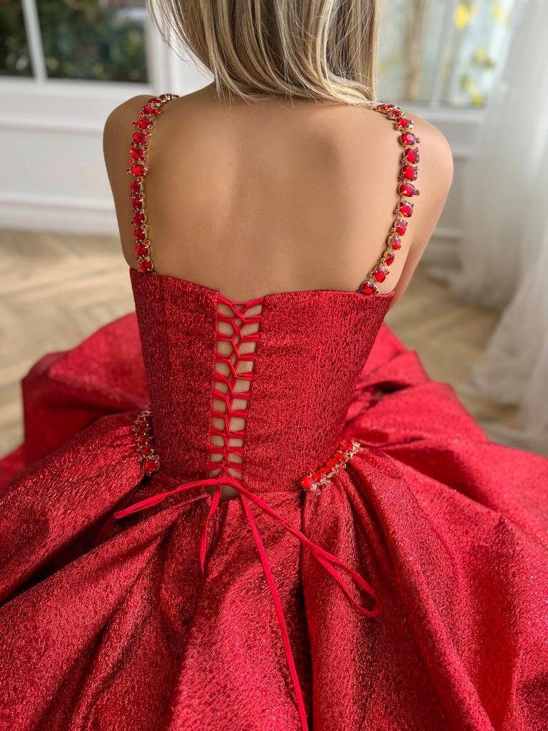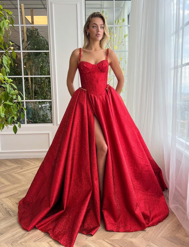 Introducing a true statement piece that embodies both allure and opulence. Crafted from shimmering taffeta in a radiant scarlet-ruby hue, this gown exudes sophistication. Its fully boned corset is designed to accentuate and flatter, while the draped bust provides a touch of romantic elegance. The distinctive basque drop waistline seamlessly transitions into a graceful A-line silhouette, complemented by a floor-sweeping pleated skirt. Subtle hints of sensuality come through with the leg slit and the enticing lace-up back. Every detail is meticulously considered, from the stone-embroidered straps and side waist detailing to the option for a strapless neckline. Step out in splendor and be the envy of every event.