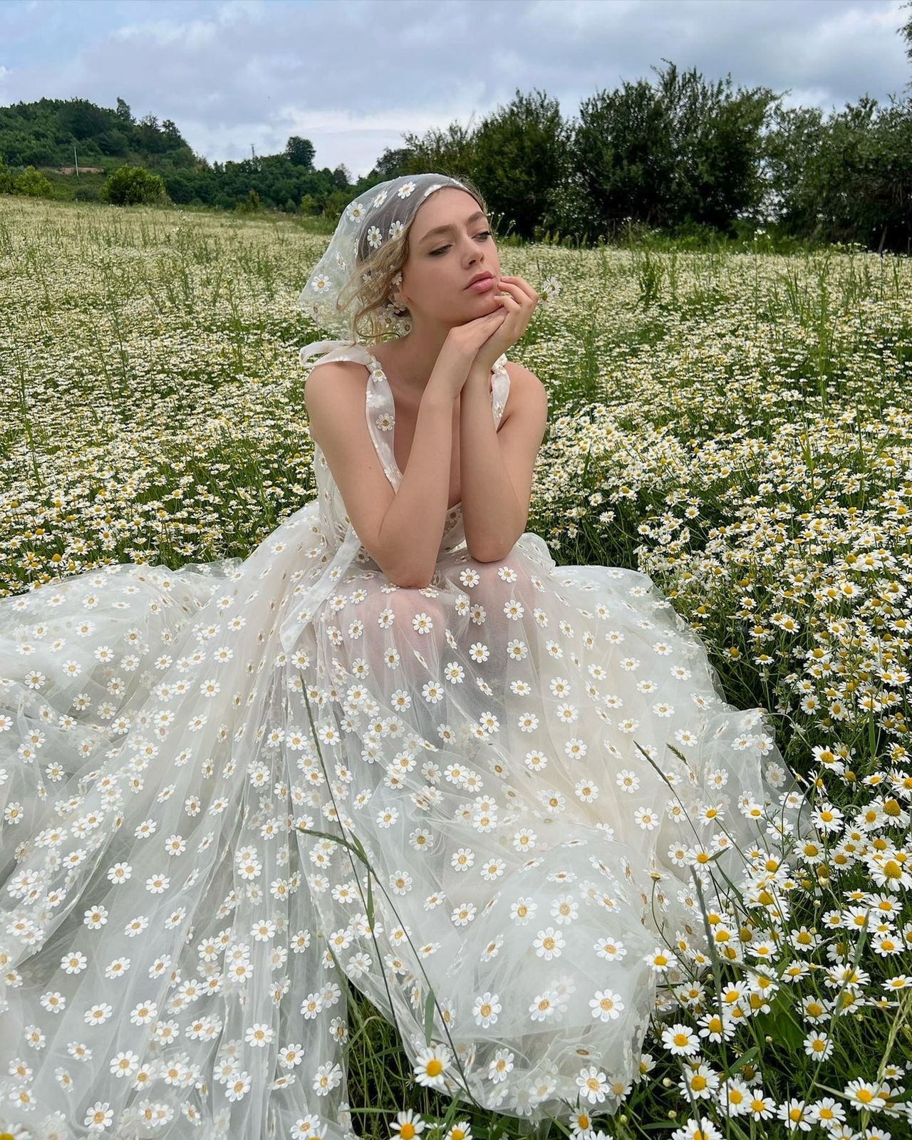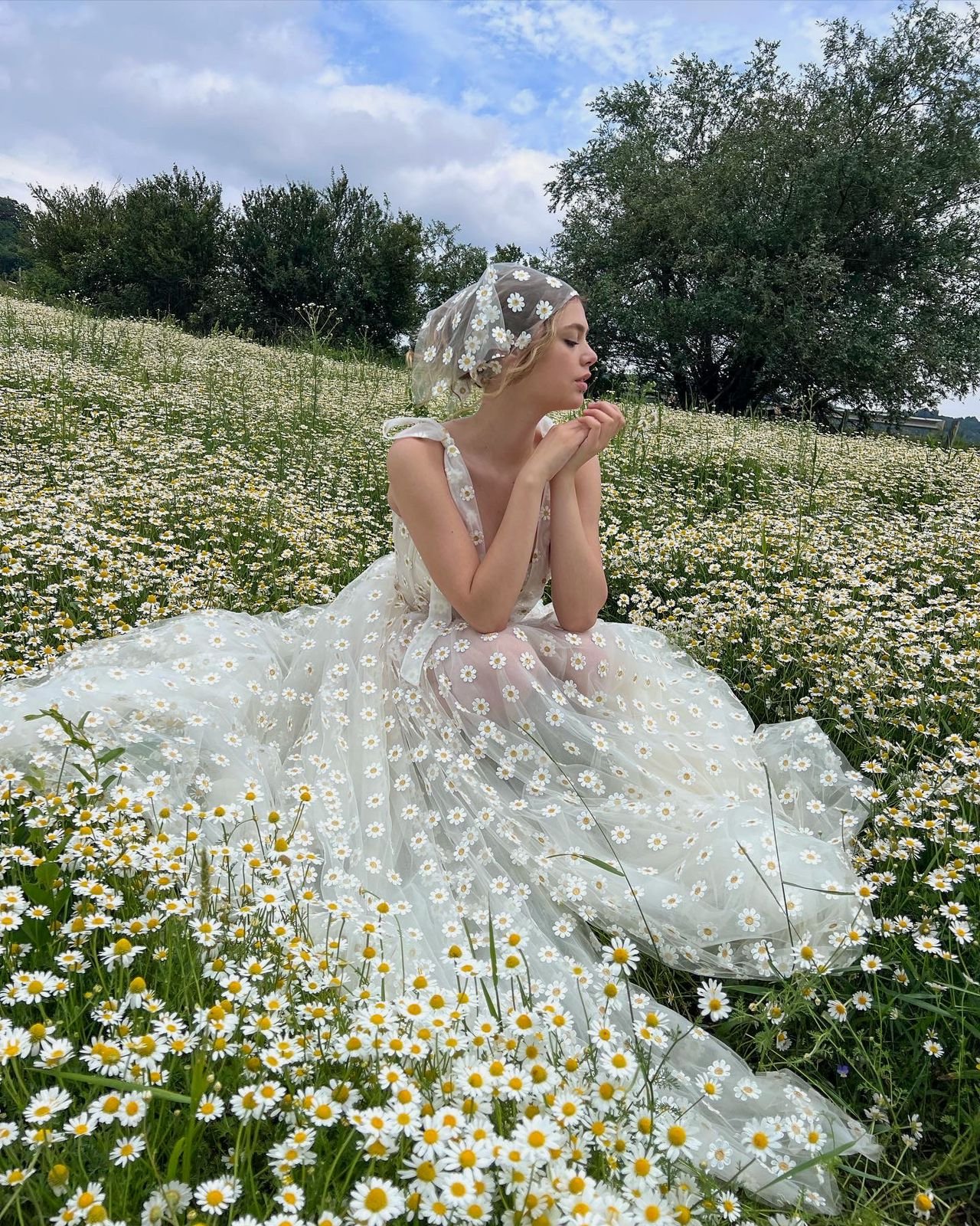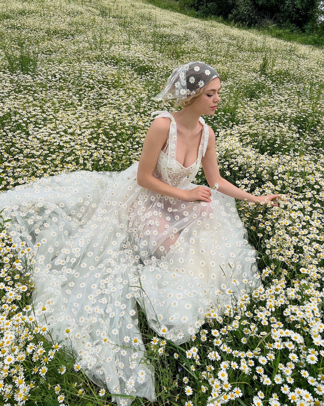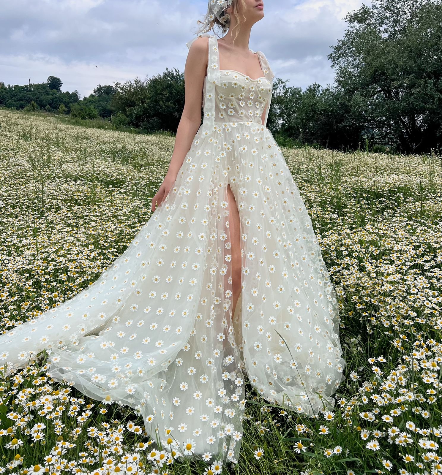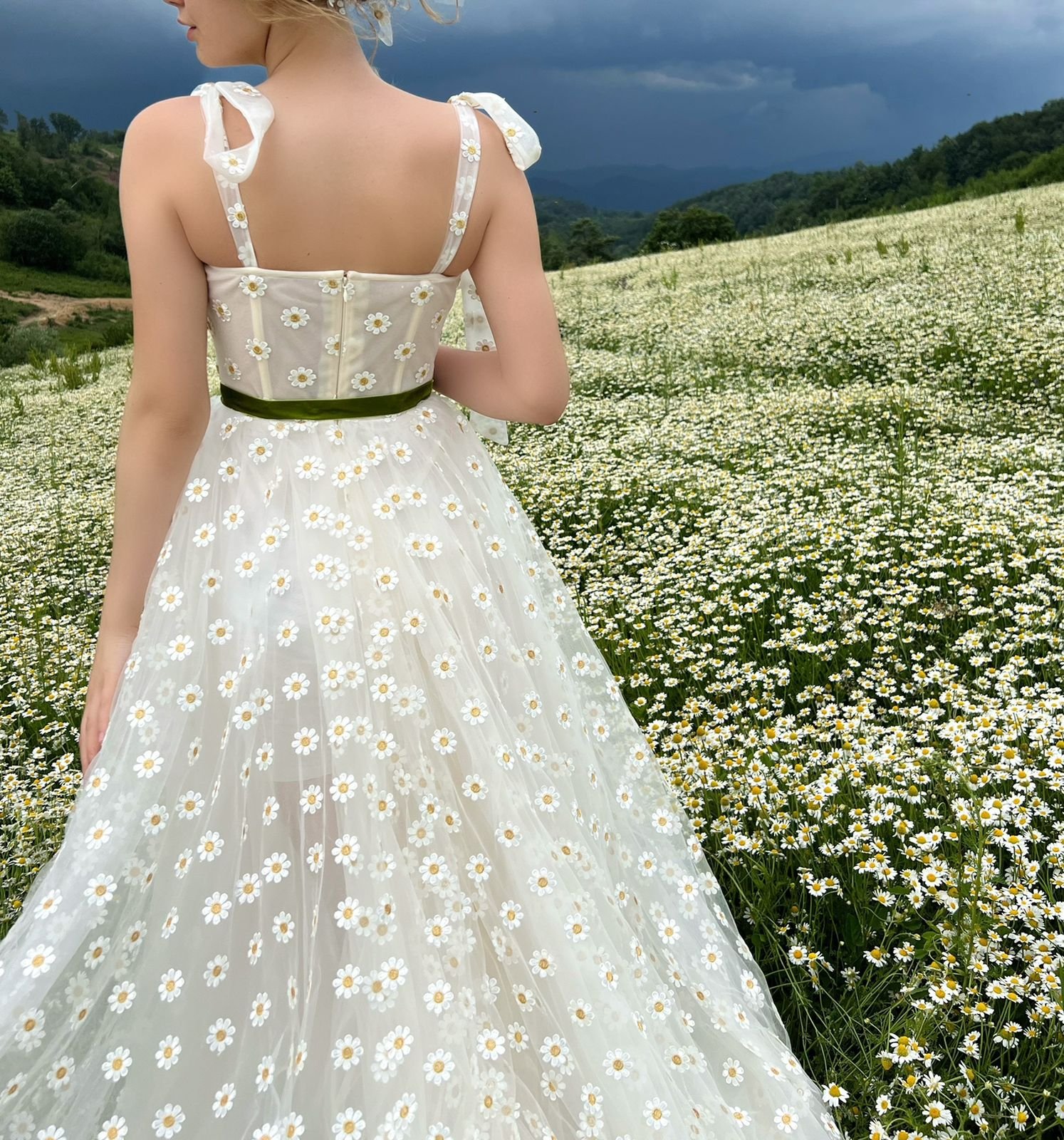 Meadow Daisy Gown Daisy bow straps and velvet belt