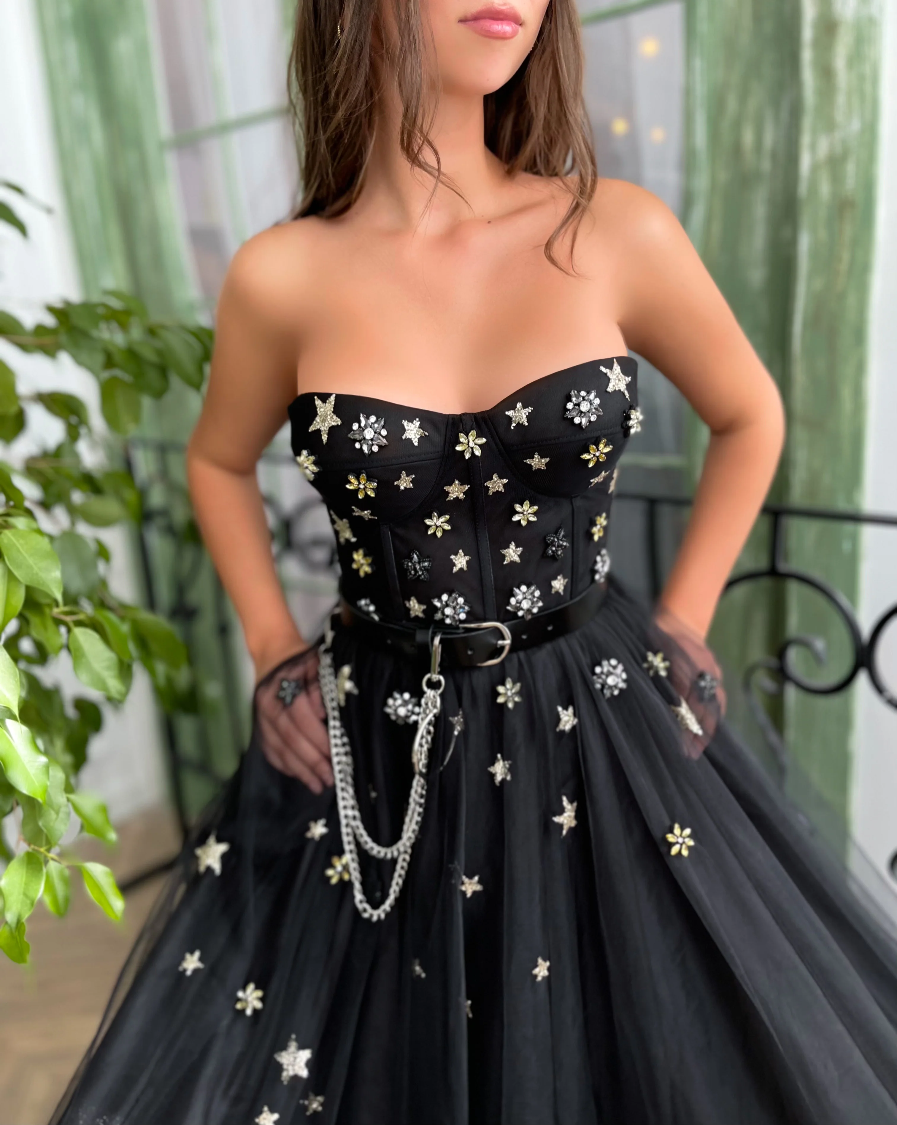 Embody boldness with this stellar mini dress made of black tulle, embellished with golden and silver stars thoroughly. Pair it with optional delicate matching gloves or a black leather belt with a draped row of metallic chains for an extra touch of glamour.
