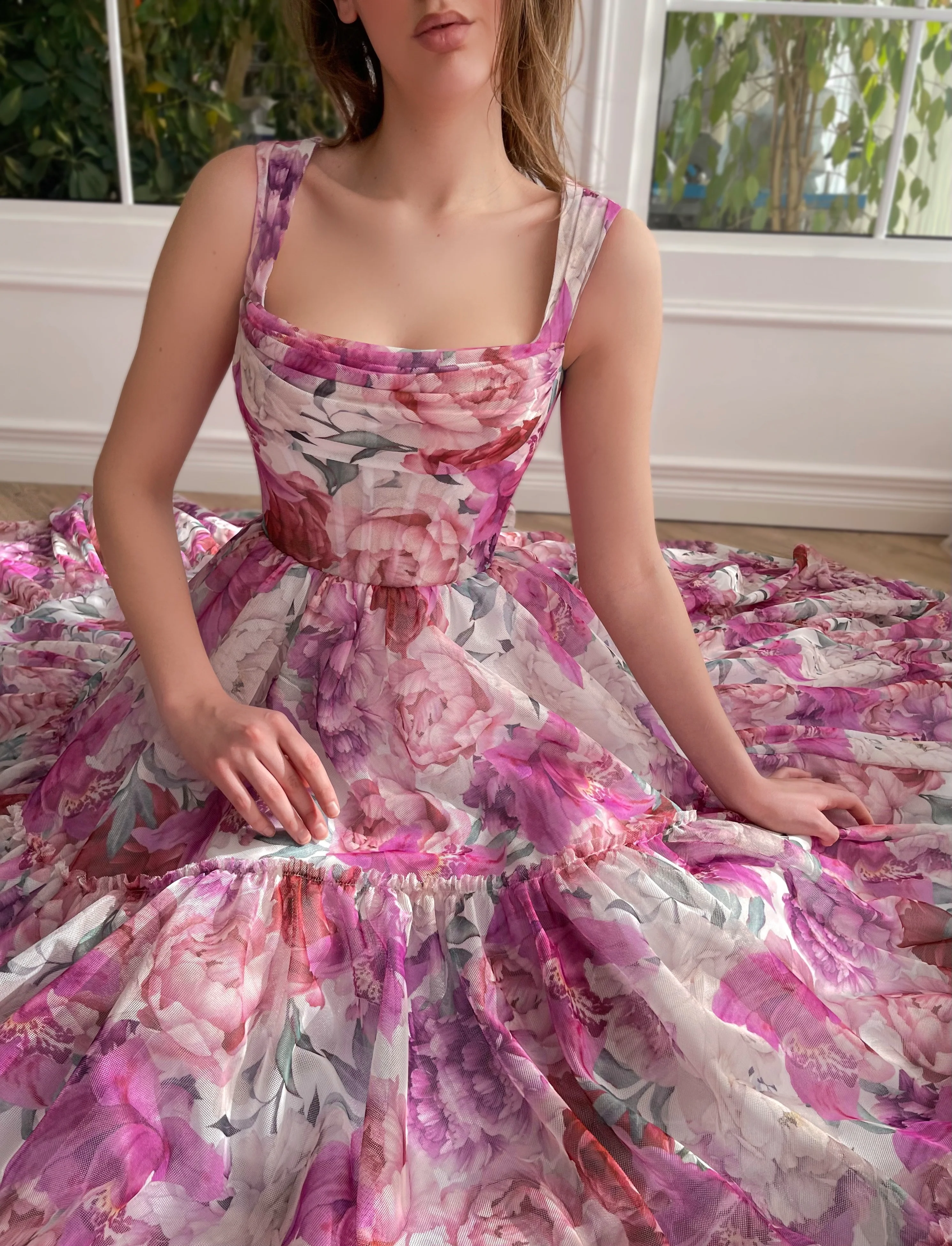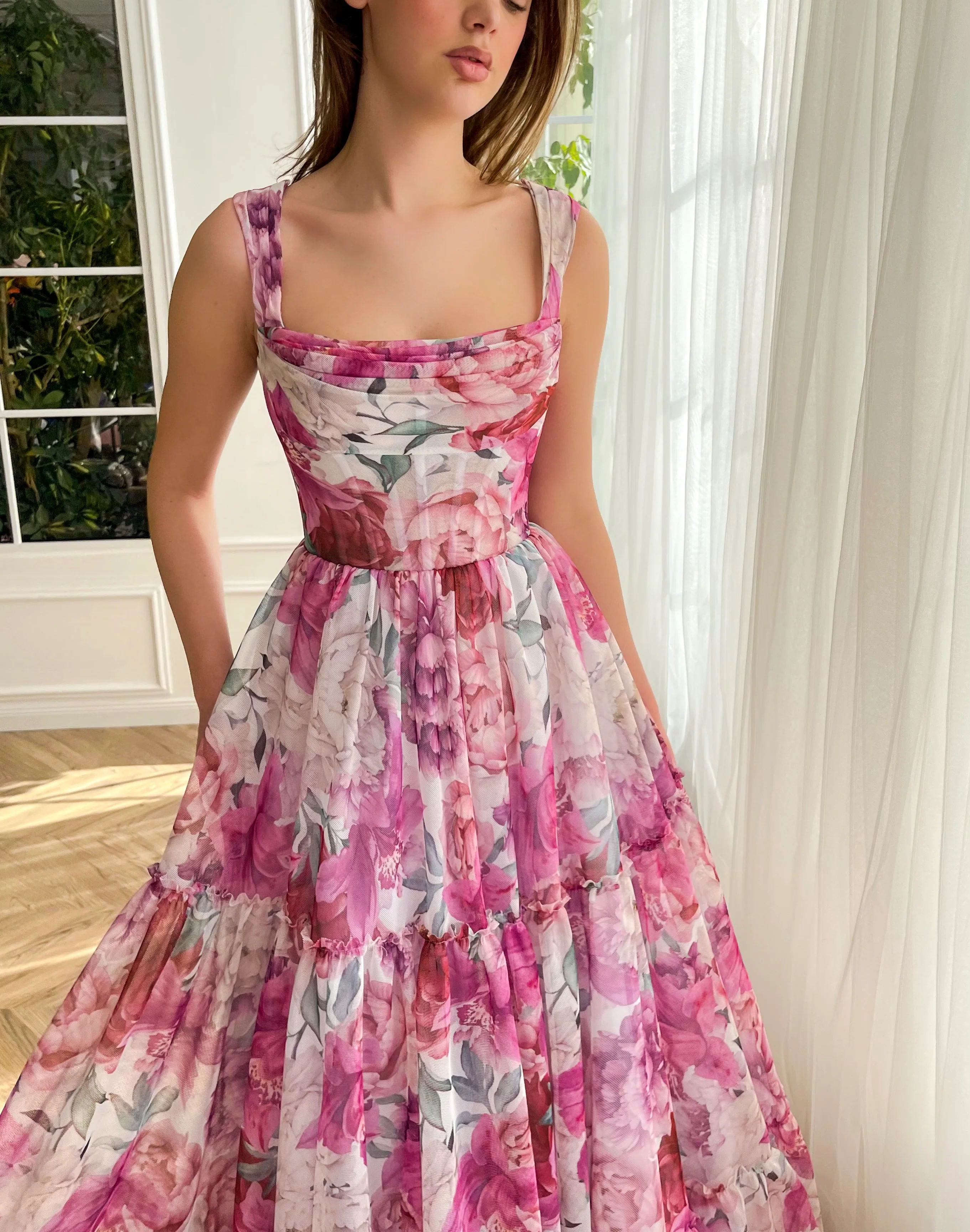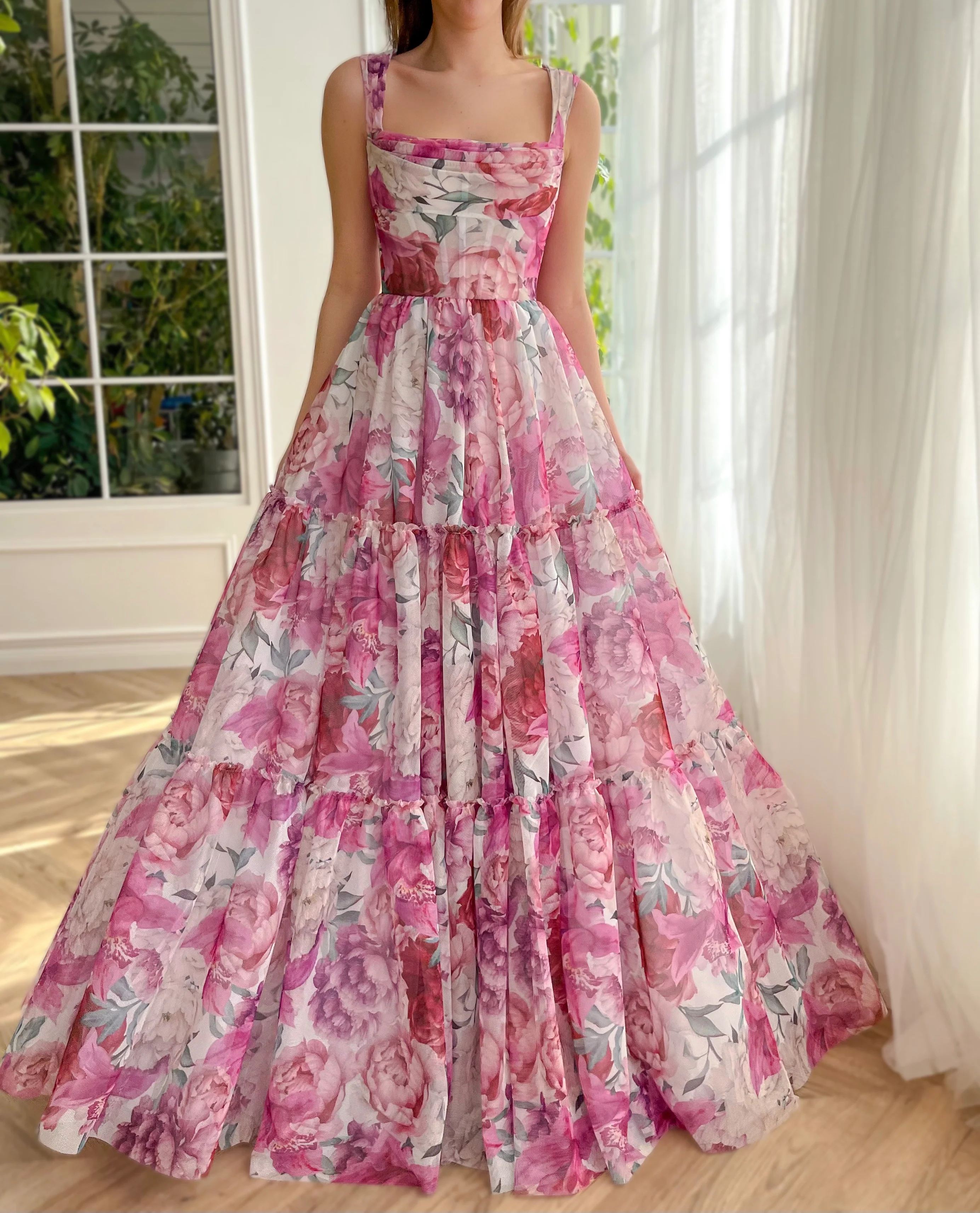 Experience a night of pure romance in this breathtakingly beautiful rose-printed gown. Lose yourself in the intricate details of the blooming roses that adorn the high-quality fabric, transporting you to a world of enchantment and passion. The corset square neckline adds a touch of elegance to the dress, while the draped bust and boning waist create a flattering silhouette that accentuates your curves. The A-line silhouette is perfect for creating a flowy and graceful movement as you walk, and the tiered gathered hem adds a playful and whimsical touch that's perfect for a night of dancing and celebration. This gown is ideal for a formal event, a wedding, or any special occasion that requires a touch of elegance and sophistication. Its timeless design and intricate details make it a piece that will remain a cherished part of your wardrobe for years to come, reminding you of the magic of that special night. Get ready to turn heads and capture hearts with this exquisite dress that will make you feel like the most beautiful and enchanting person in the room.