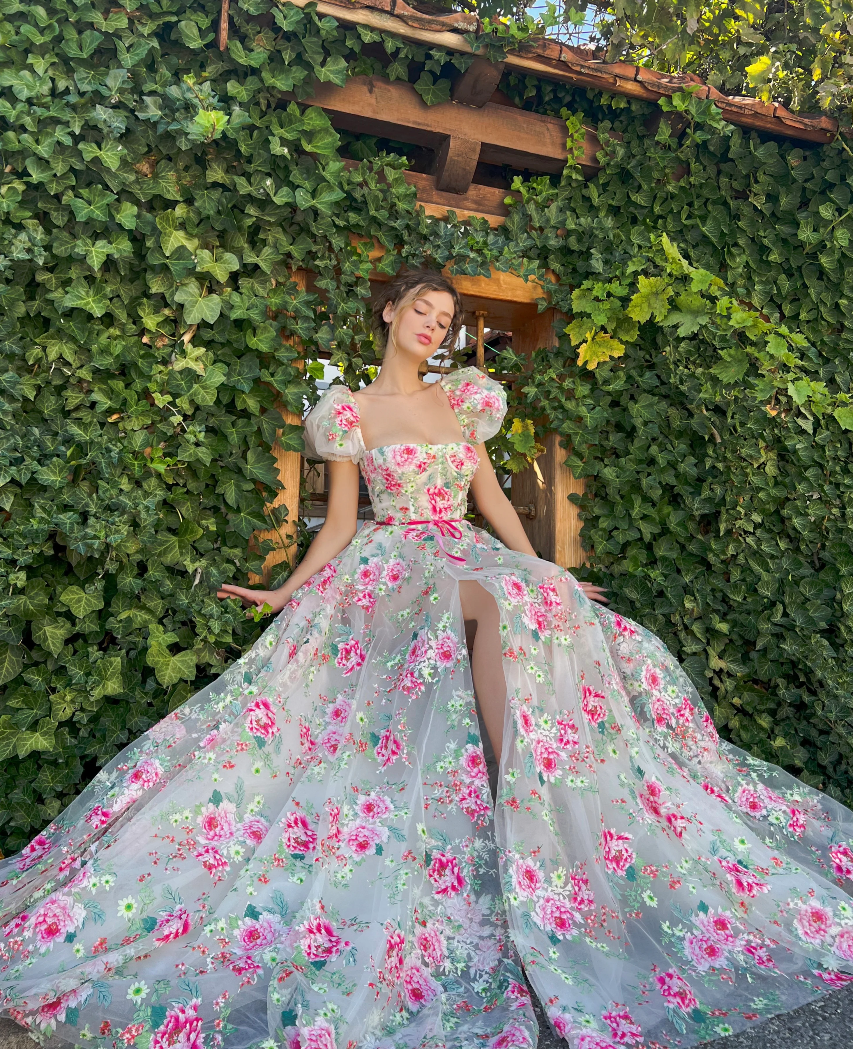 Step into a world of pure elegance and grace, adorned in a dress that's a radiant symphony of design and comfort. This masterpiece is a beautiful blend of intricate ivory lace, delicately embroidered roses, and meticulous detailing, all harmonizing to deliver an ethereal aesthetic that's truly breathtaking. The heart-shaped neckline adds a touch of romantic sophistication, making this dress an exceptional choice for any event or party, where you're guaranteed to make a memorable impression. The silhouette is impeccably shaped with a cinched waist that flows into a flattering A-line, offering a silhouette that's as comfortable as it is chic. Adding an element of unexpected delight are the hidden inseam pockets that merge convenience with style. For those who dare to make a daring yet elegant statement, a leg slit adds a subtle allure, ensuring that every step you take is filled with confidence. The design gracefully cascades into a floor-length dress and concludes with a sweep train, adding a final note of regal elegance. The short puffy sleeves lend a whimsical charm while a decorative ribbon belt serves as a stylish accent, completing the ensemble with a flourish. This dress is not just a garment, but a captivating story of beauty and elegance, tailored for those who appreciate the finer things in life.