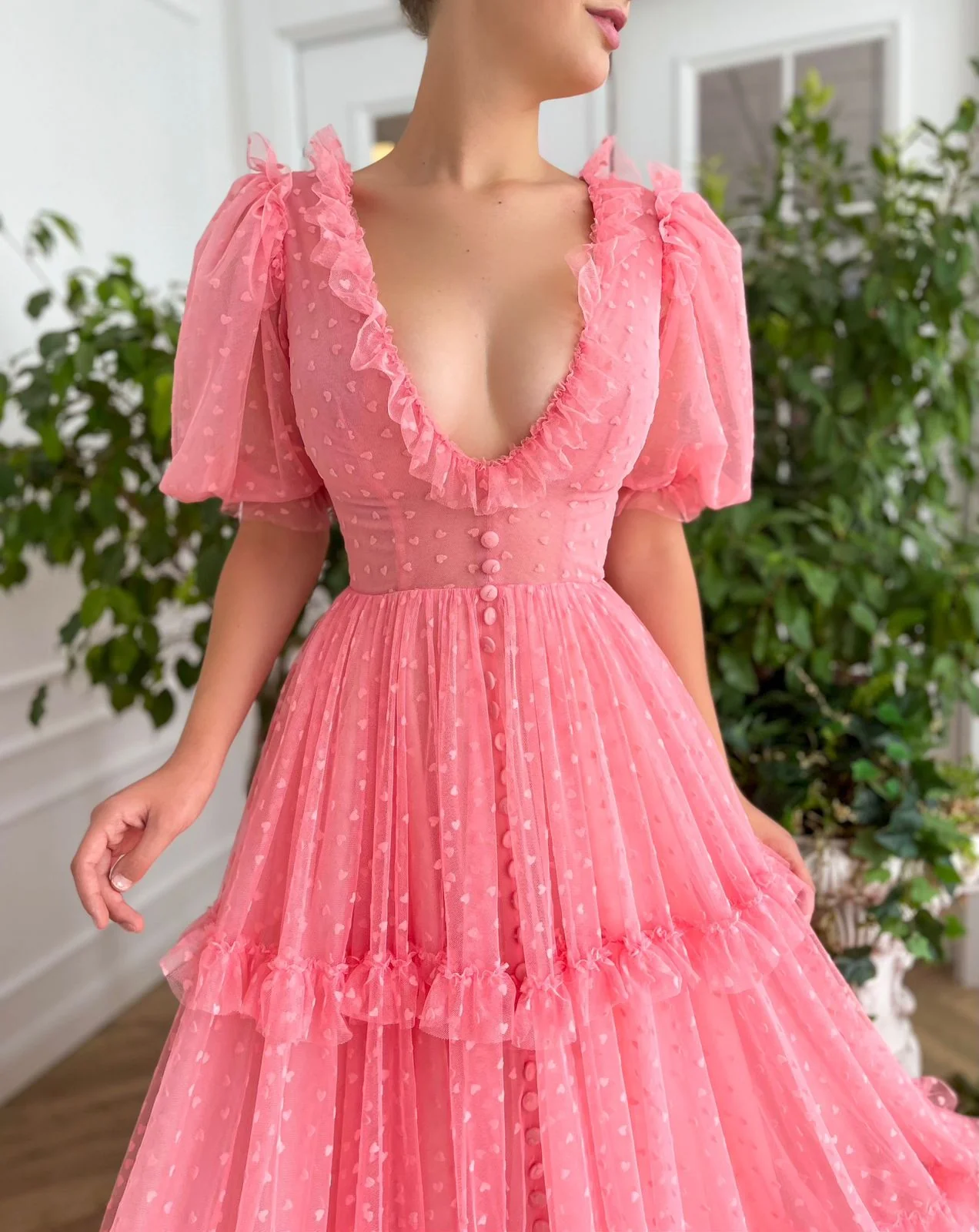 Immerse yourself in the enchanting allure of romance with our captivating soft rose tulle gown, embellished with a delightful print of tiny hearts that exude an ethereal charm. The design intricately weaves classic elegance with a contemporary twist, manifesting a creation that is truly one of a kind. The torso portion of this masterpiece is meticulously crafted in the style of a ruffled collar blouse, a harmonious blend of sophistication and grace. With its complementing V-neck bustier top, accompanied by the dreamy puffy sleeves, the design truly emanates a sense of vintage elegance. The gown gracefully transitions into a cinched waist, masterfully introducing an A-line silhouette that effortlessly highlights your natural curves, offering a perfect fusion of style and comfort. The tiered gathered hem adds an additional layer of panache to the gown, creating a playful rhythm in the overall aesthetic. The decorative button placket is the final stroke in this art piece, adding a whimsical touch that does not fail to catch the eye. Clothe yourself in this exquisite creation and prepare to etch your presence in everyone's hearts, leaving a lasting impression that is as unforgettable as the gown itself.