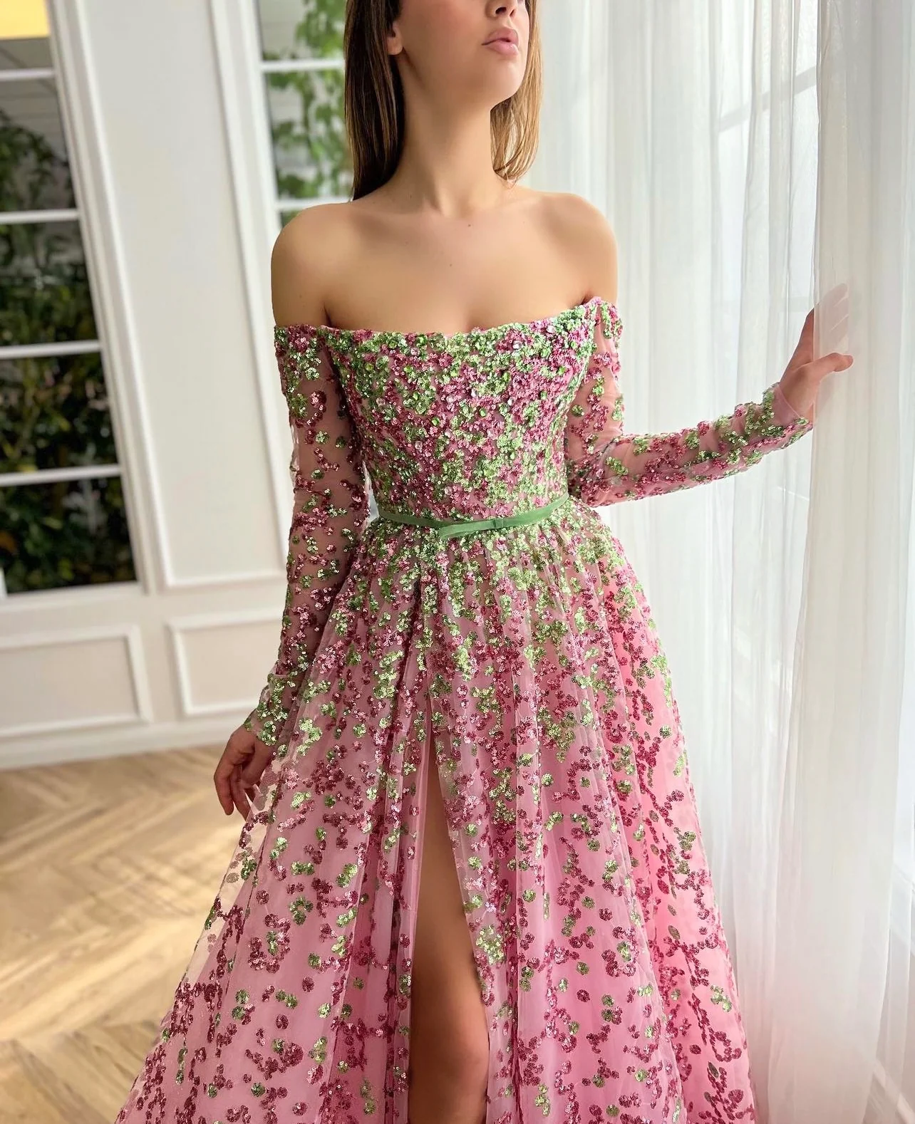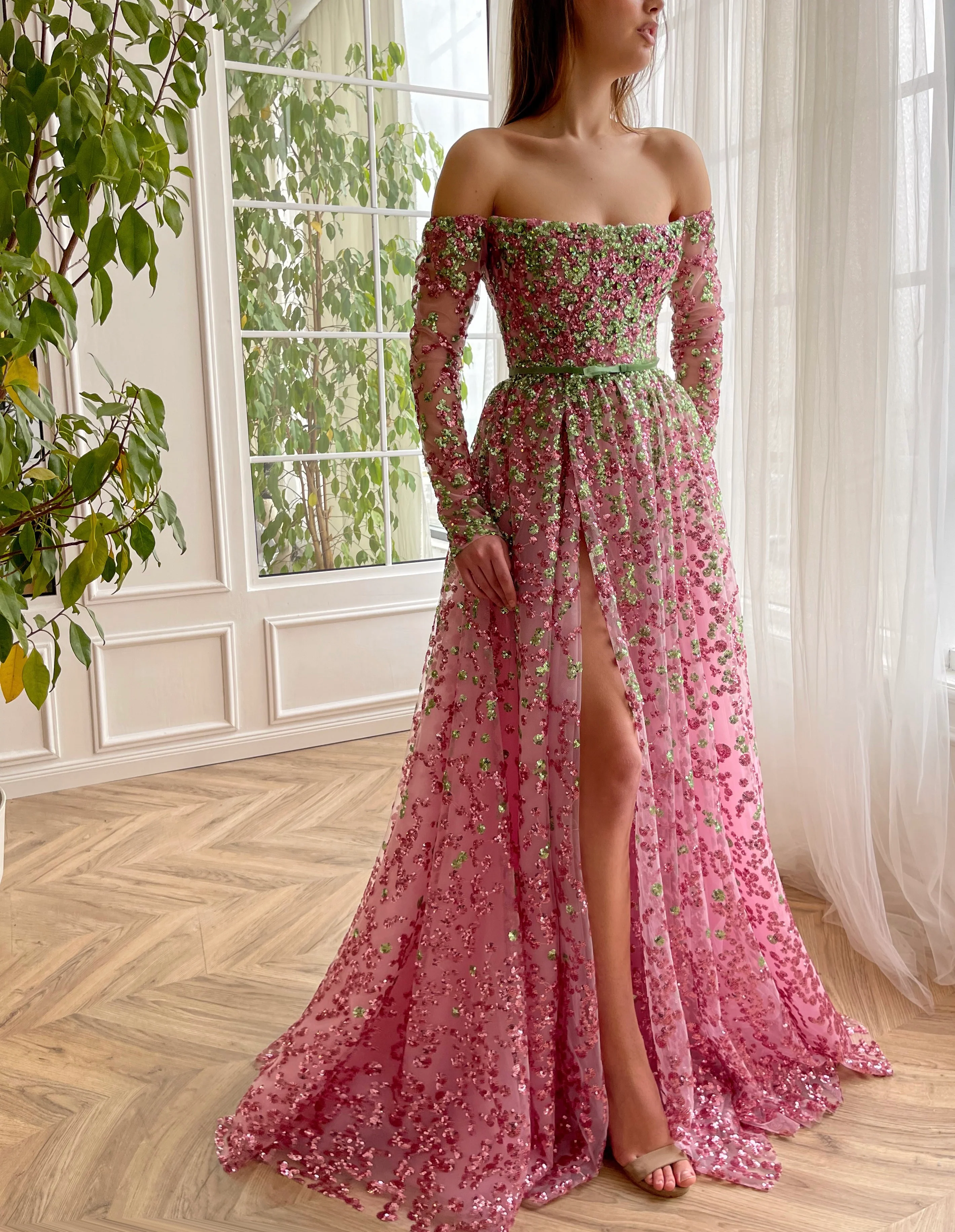 Immerse yourself in the lavish allure of our exquisite dress, carefully crafted from a luxuriously glossy fabric that gracefully contours your figure, tracing the lines of your body in a splendid A-line silhouette. The dress is a testament to artistic detailing, adorned with an embellished pink lace that holds the fascination of beautifully contrasting green details, weaving a striking tapestry of color and texture. The fitting bodice, elegantly fortified with boning, lends a structured yet comfortable fit, enhancing your natural form while ensuring freedom of movement. The off-shoulder neckline introduces a delicate balance of allure and sophistication, adding a touch of timeless elegance to the design. Further enhancing the dress's functionality are the ingeniously placed inseam pockets that seamlessly blend into the garment's design, offering a practical solution without compromising on style. The tight-fit long sleeves lend a chic, modern appeal, harmoniously complementing the overall aesthetic. An intriguing feature is the subtly provocative leg slit, a delicate expression of daring and grace that adds a hint of intrigue to the ensemble. The back of the dress is skillfully designed with adjustable crisscross straps, providing an element of customization to ensure a flawless fit. A final touch of whimsy is seen in the form of a decorative bow belt, a charming addition that heightens the femininity of the dress while adding a hint of playful elegance, encapsulating the perfect balance of comfort, style, and luxury.