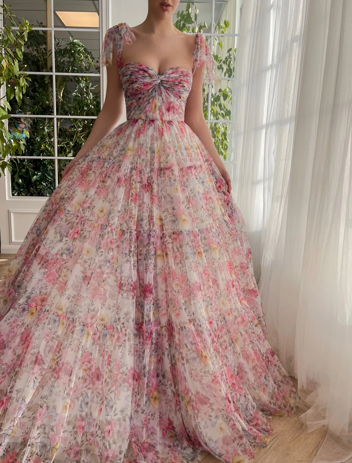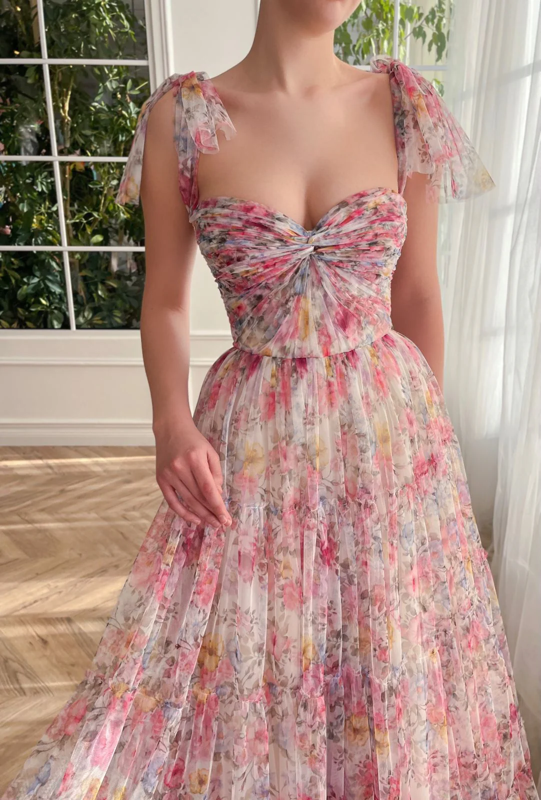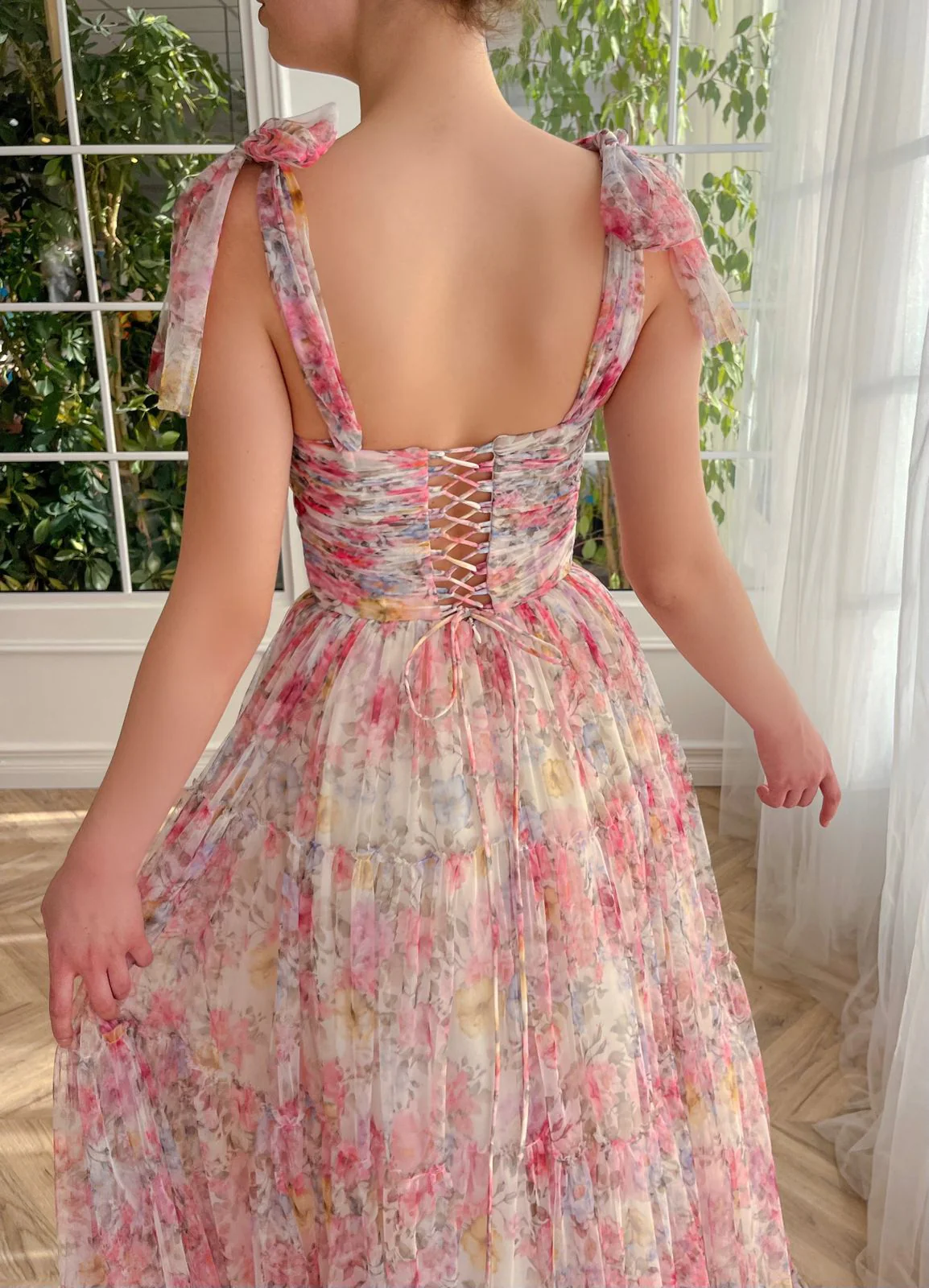 Delight in the enchanting allure of this adorable gown, adorned with a charming rose floral print and a beautifully draped bust detail, ingeniously twisted for an improved fit. The gown boasts a structured bodice, equipped with cups and boning for refined shape and support. It cascades down to an elegant A-line silhouette punctuated by a tiered gathered hem, adding a dynamic flow to your movements. Decorative bow straps introduce a playful element, while the lace-up back brings a sensual twist to the ensemble. Every detail of this dress converges to craft an extraordinary style statement.