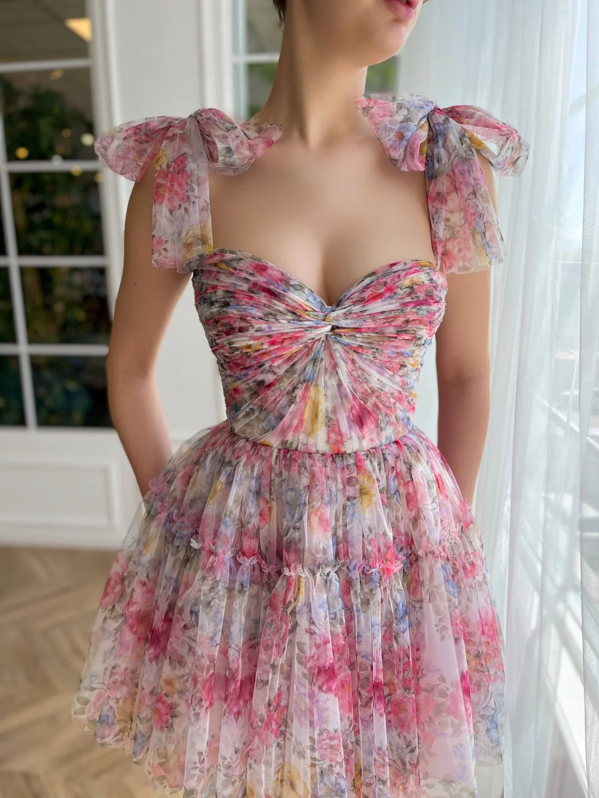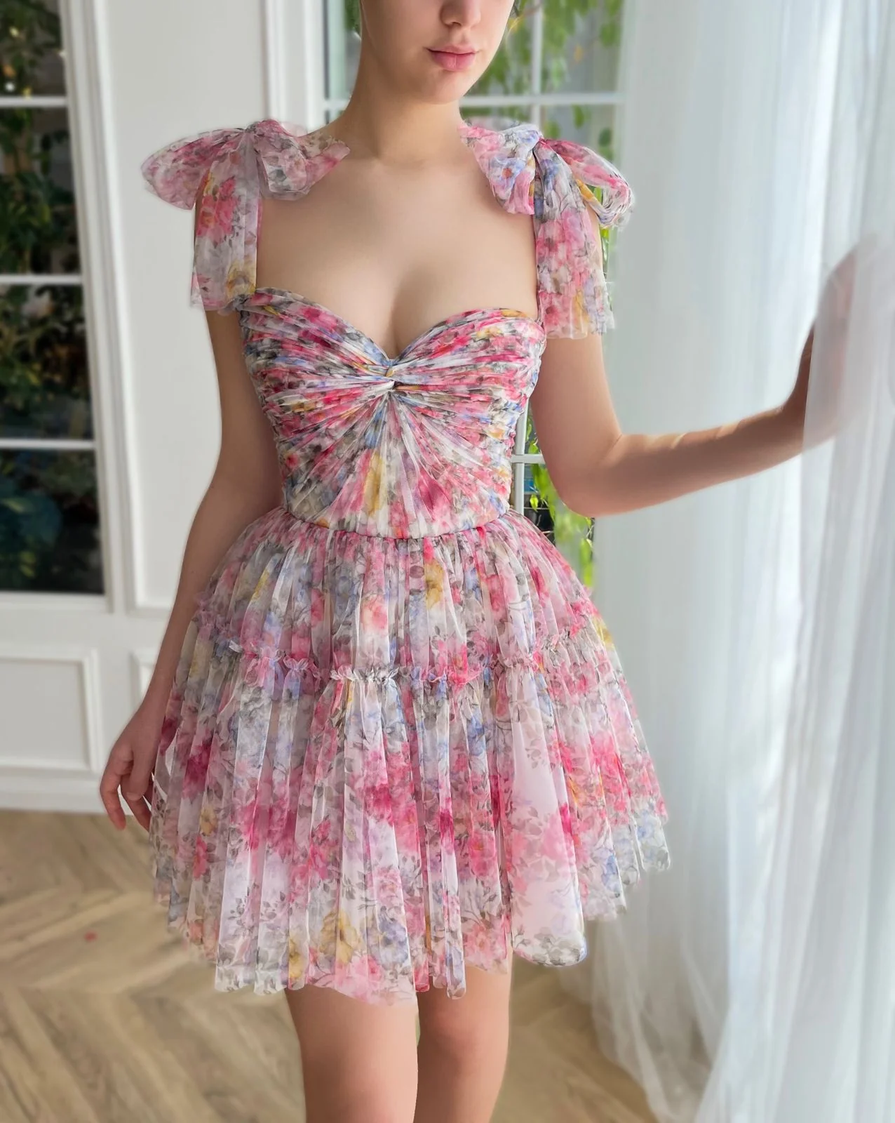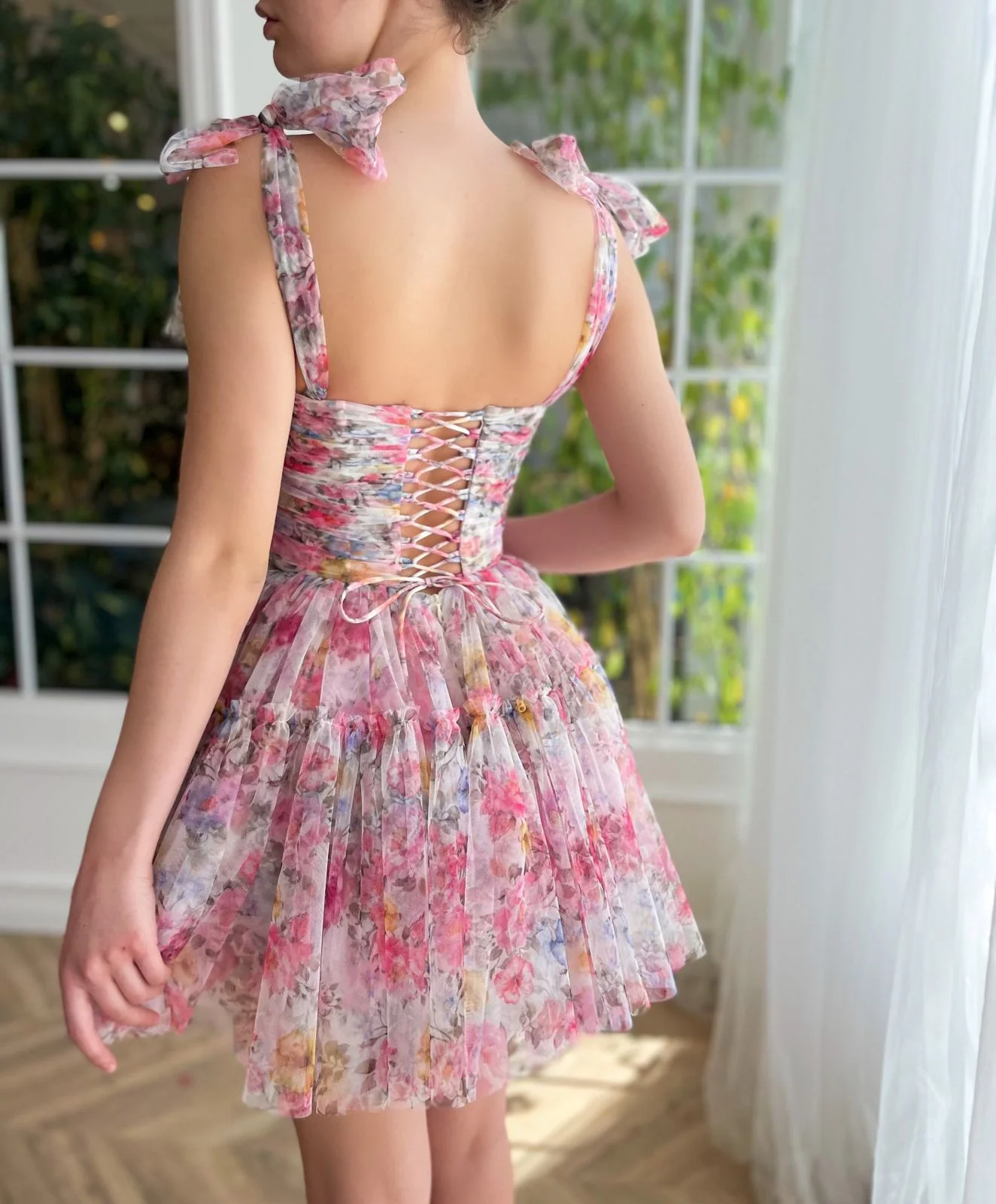 Step into spring radiating elegance in our mini dress, a must-have seasonal staple. Meticulously crafted from a sumptuous rose floral print fabric, this dress brings a delicate balance of charm and sophistication. A creatively draped bust, twisted for an exquisite touch, pairs effortlessly with a supportive bodice, thoughtfully designed with cups and boning. It features a tiered gathered hem that dances with each step, punctuated by the playful intrigue of decorative bow straps. The look is finished with a stunning lace-up back, making this dress a captivating blend of style and comfort.