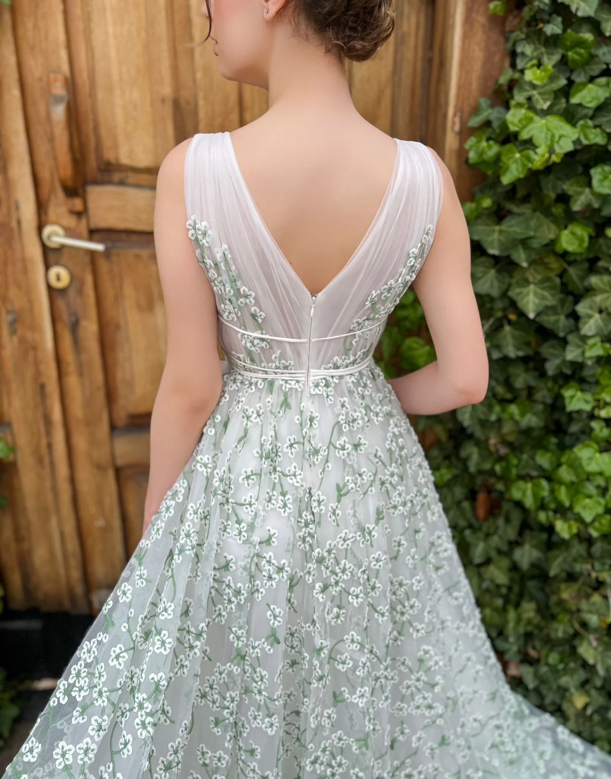 Crafted with intricate design considerations, our dress embodies elegance, seamlessly merging soft tulle and meticulously designed lace for an ethereal appeal. The figure-flattering waist, artfully snatched, contours your form, while the alluring V-neckline exudes an air of sophistication. The garment effortlessly flows in an A-line silhouette, boasting of the whimsical fluidity associated with this timeless style. This floor-length beauty is more than just a visual delight; we've thoughtfully added inseam pockets to combine practicality with high-fashion. The bottom of the dress cascades into a beautifully gathered hem that further amplifies the dress's charm. The outfit is cinched at the waist with a decorative bow belt, adding a subtle, feminine touch. As the pièce de résistance, the dress is adorned with embroidered mint camellias flowers, adding a vibrant yet understated layer of embellishment. This thoughtfully designed, elegant masterpiece stands as a testament to our commitment to style, comfort, and quality.