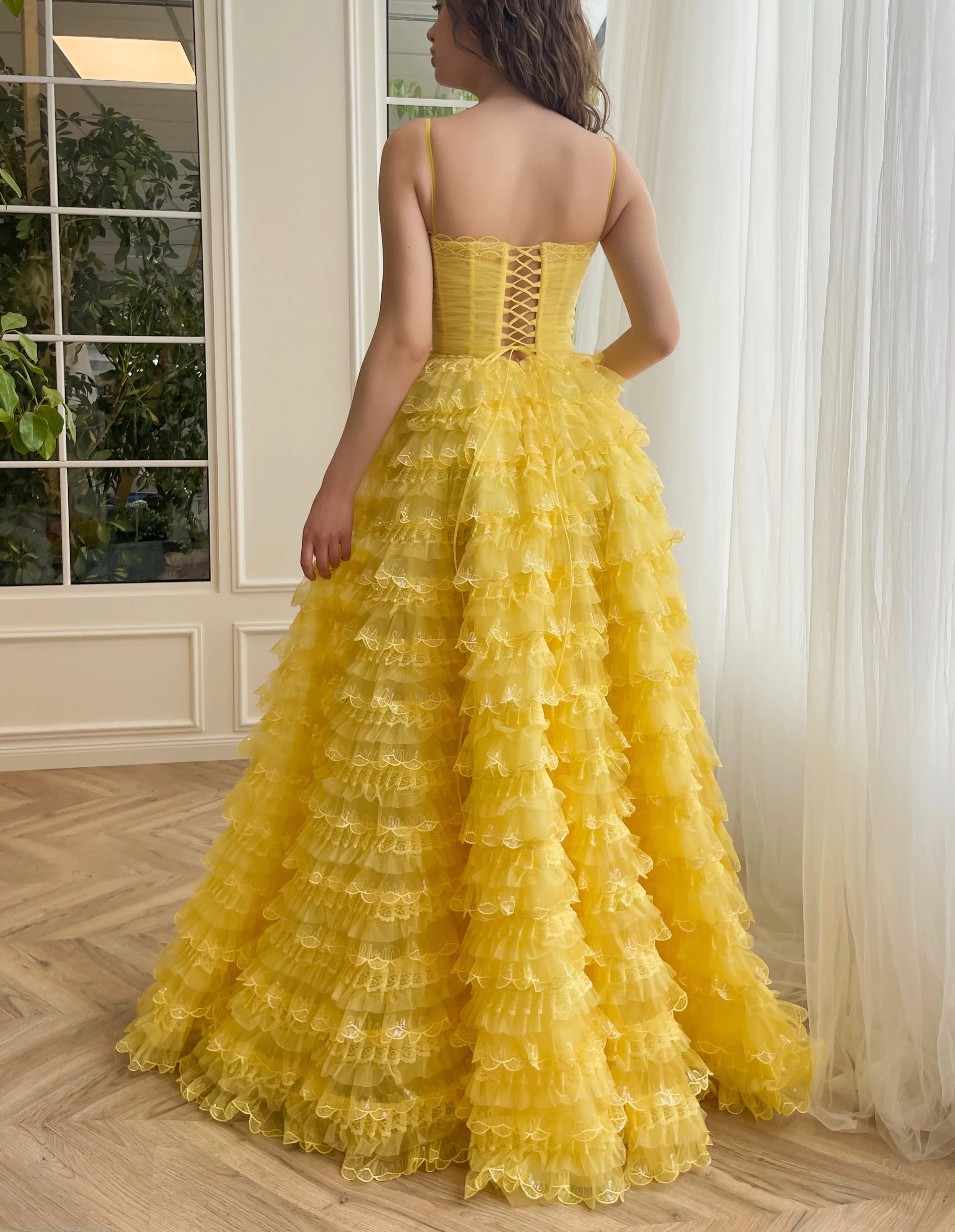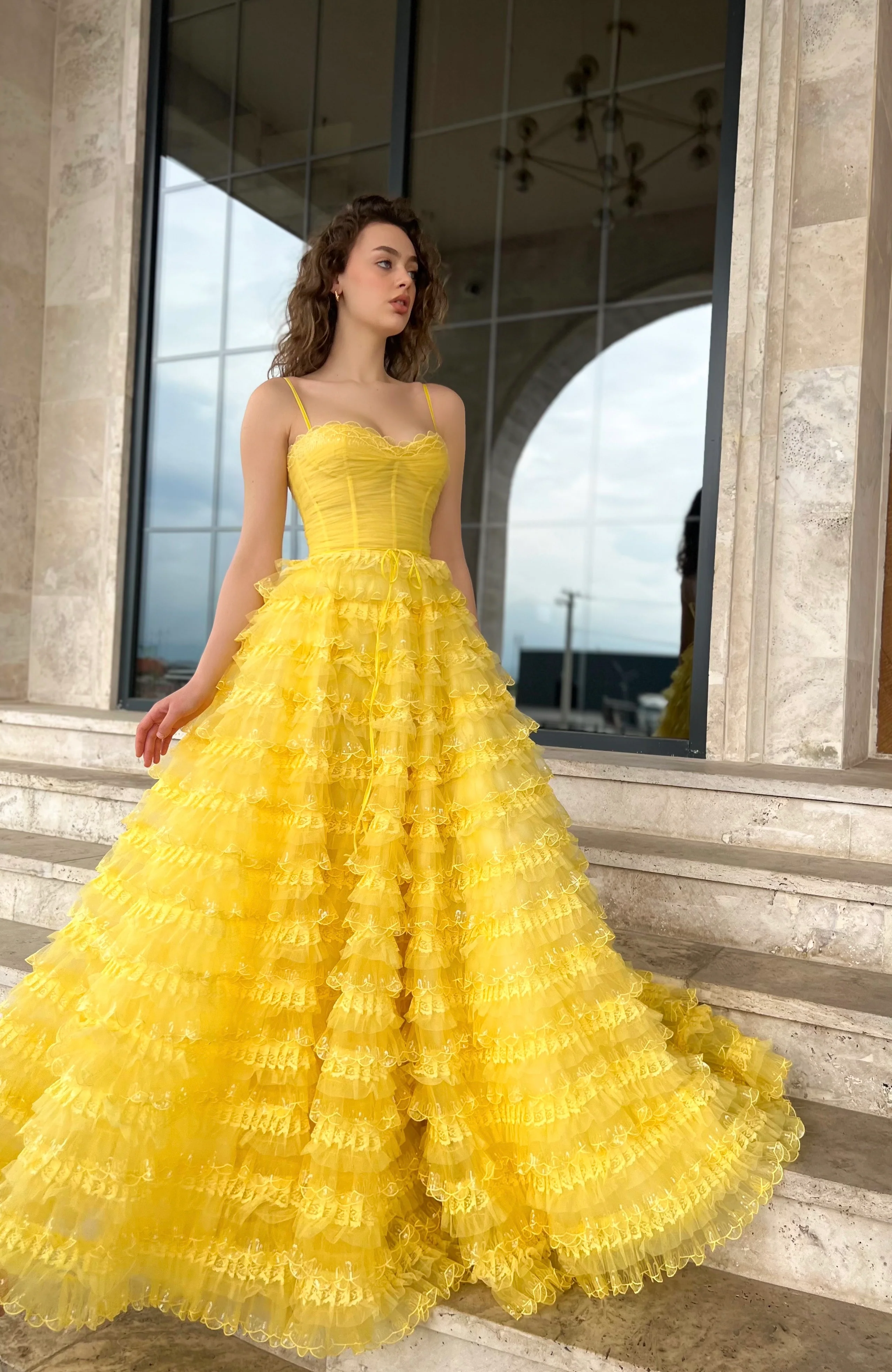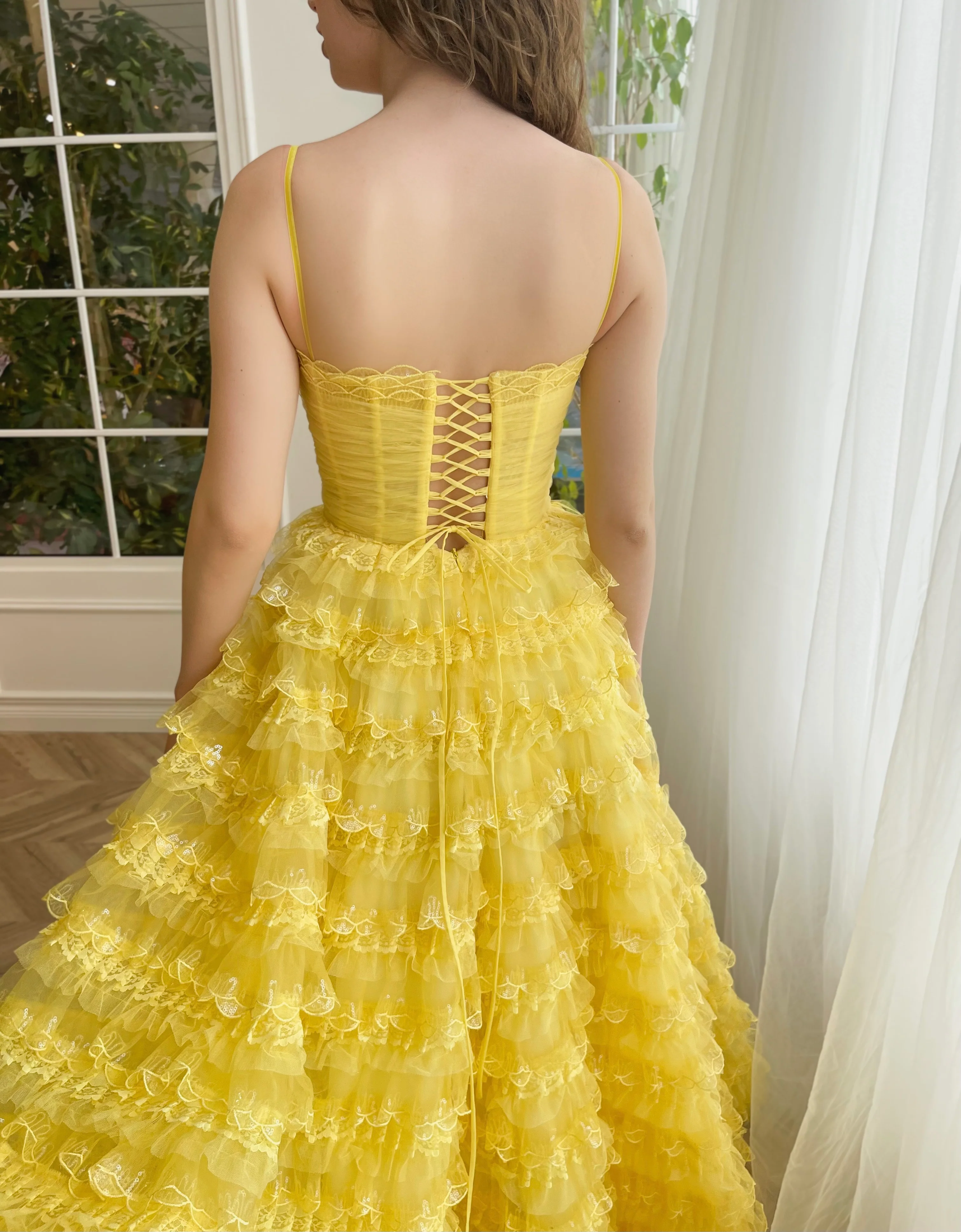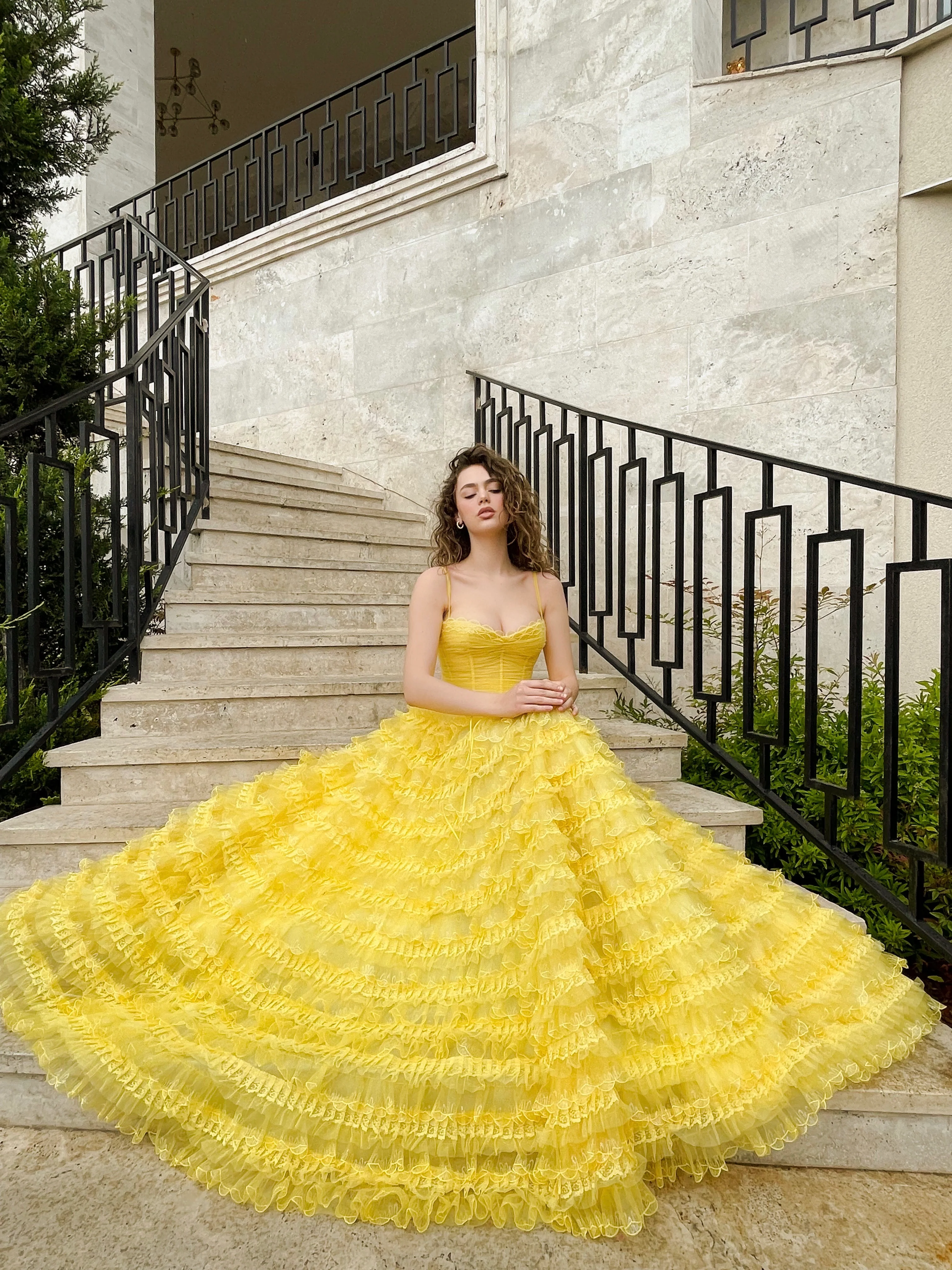 Immerse yourself in the vibrancy of our enchanting gown, radiating an exuberant sun-yellow hue and intricately designed with a mesmerizing swirling pattern. This eye-catching piece starts with a hearty neckline, tastefully paired with delicate spaghetti straps that impart a sense of lightness and elegance. A beautifully draped bodice accentuates your figure, leading to a cinched waist that shapes the ideal silhouette, catering to both comfort and style. The dress blossoms into a majestic ball-gown silhouette, topped with a floor-length skirt that dances with every step you take. A lace-up back enhances the gown's fit, creating a harmonious fusion of comfort and beauty. For added convenience and a modern twist, the design incorporates discreet inseam pockets. A decorative bow ribbon belt adds a whimsical touch, and the ensemble is completed with an exquisite bust cup detail. This gown is a testament to lively elegance and sophisticated design, promising to make you the center of attention at any event.