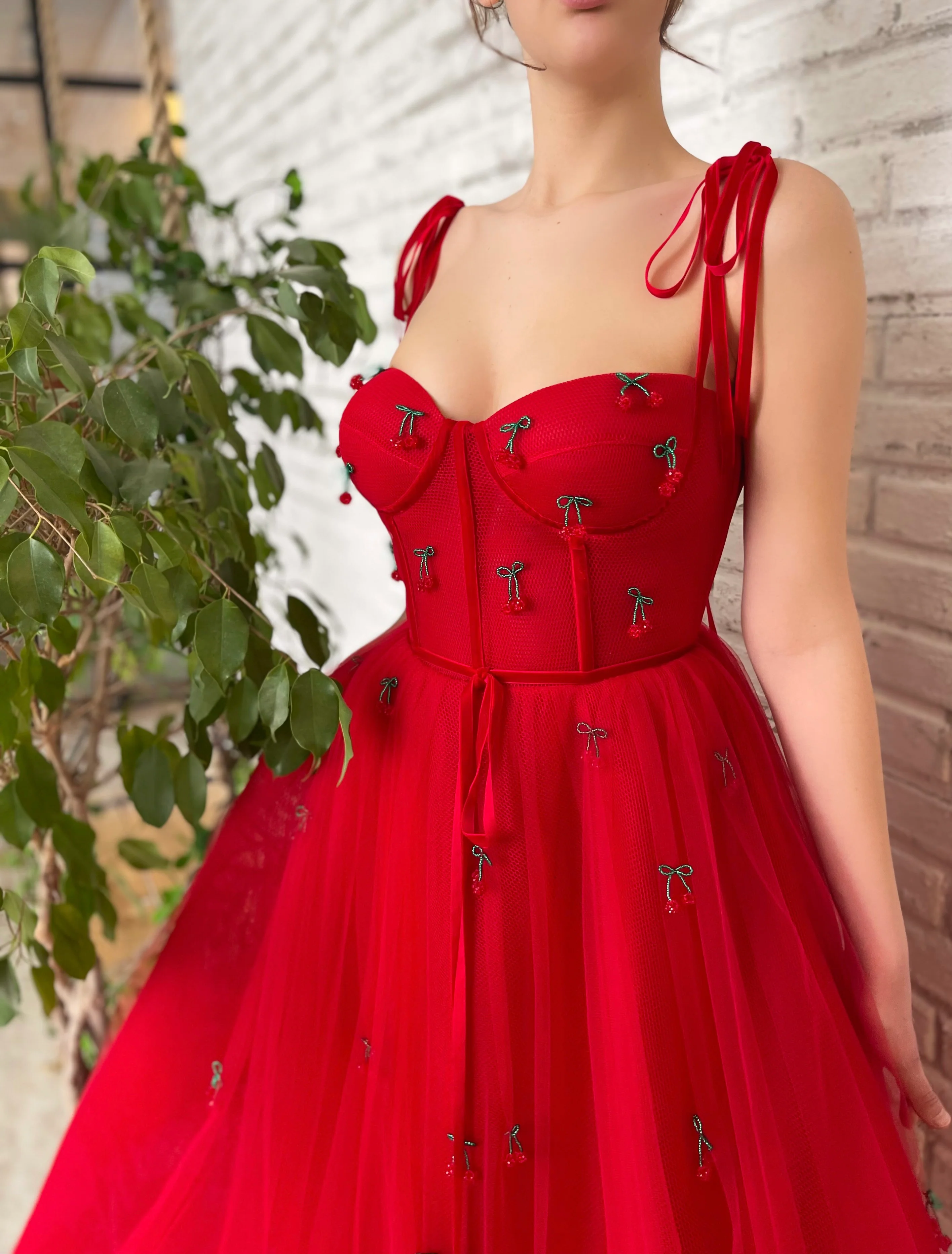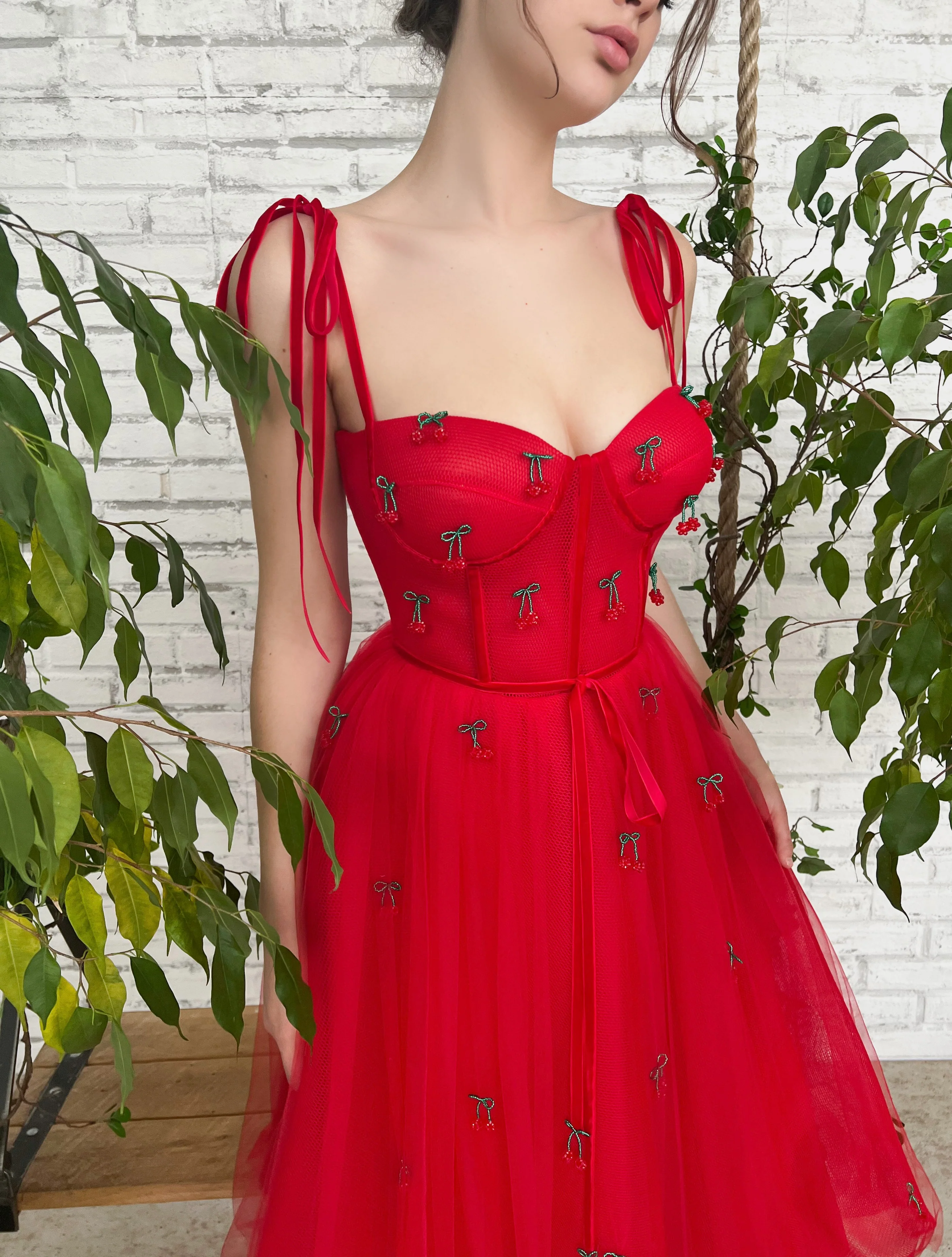 Exuding an intoxicating blend of drama and femininity, this stunning dress captivates in a vibrant red hue, designed to make a bold style statement. Its structure is meticulously crafted from 3D mesh net and tulle fabric, providing a textural depth that only amplifies its allure. Constructed with expert precision, the boning at the bodice and built-in pads ensure a flattering silhouette, while enhancing comfort and support. The cinched waist further refines the figure, transitioning effortlessly into a midi-length style that gracefully skirts the line between playful and refined. The unexpected addition of pockets introduces a functional element without detracting from the overall aesthetic. In a marriage of texture and style, velvet ribbon straps are added, transforming into a decorative belt at the waist for a touch of luxurious whimsy. The pièce de résistance is the beautiful cherry embroidery, creating an ultra-feminine look that seamlessly intertwines with the dress's romantic narrative, making it a truly enchanting piece.
