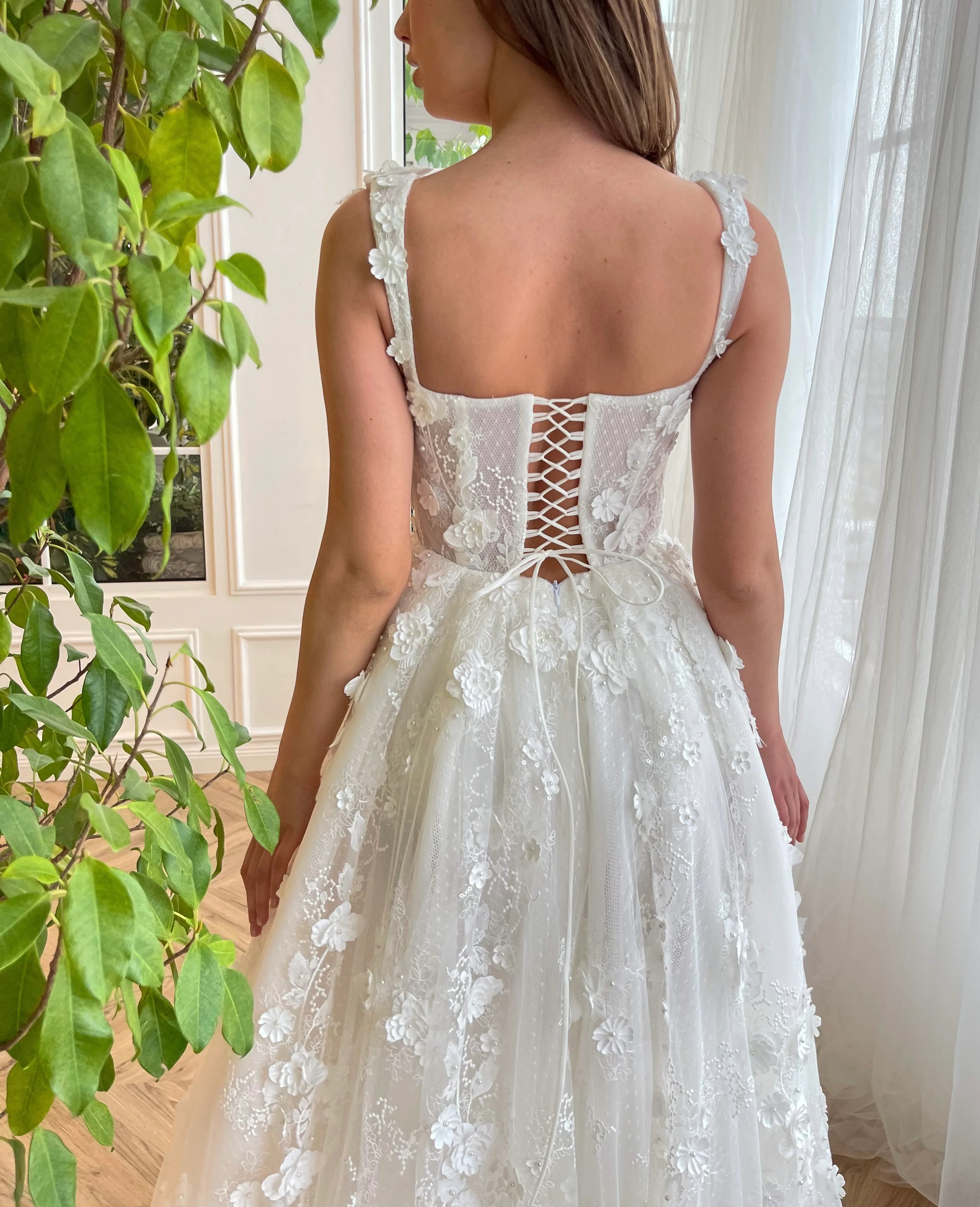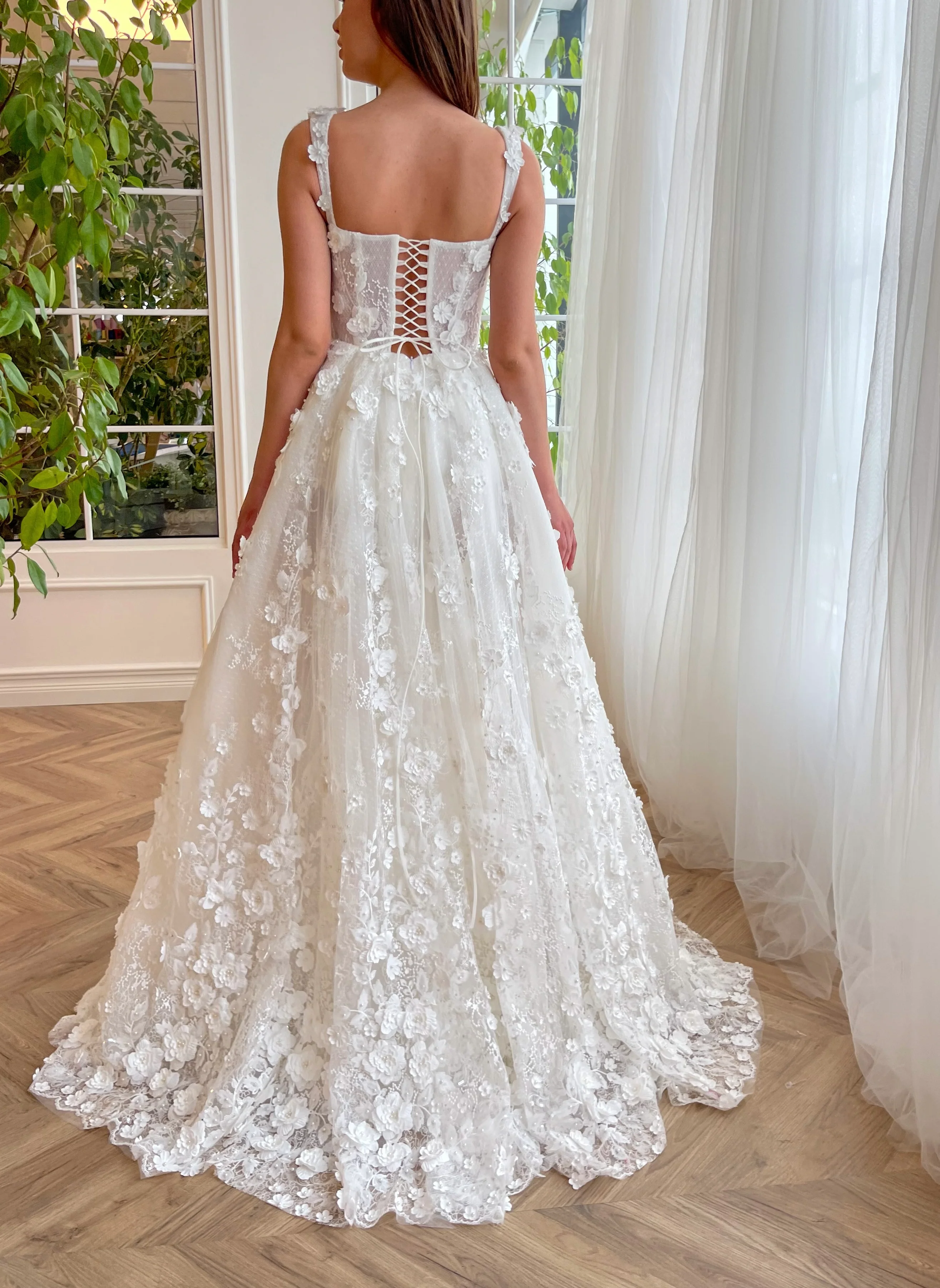 This elegant dress is a celebration of delicate design and refined detailing, crafted from white lace fabric that comes alive with 3D flowered embroidery. The sweetheart neckline introduces an irresistibly romantic charm, leading gracefully into a meticulously constructed bodice featuring integrated cups and boning, ensuring an optimal fit while enhancing the body's natural contours. An A-line silhouette provides a universally flattering fit, gracefully flowing to subtly highlight the wearer's shape without compromising on comfort. A daring leg slit balances the demure nature of the dress with an intriguing hint of allure, tastefully juxtaposing the striking floor-sweeping skirt. The lace-up back not only promises a tailor-made fit but also introduces an unexpected detail that adds a contemporary edge to the otherwise classic design. A decorative fitting ribbon detail and embroidered straps serve as the crowning touches to this exquisite dress, merging function and fashion in a final flourish of breathtaking artistry.