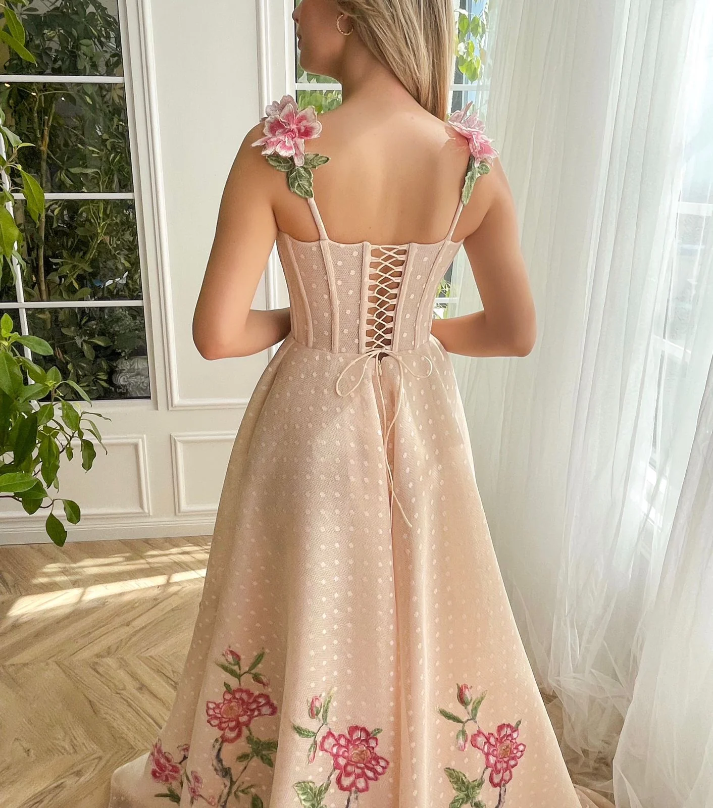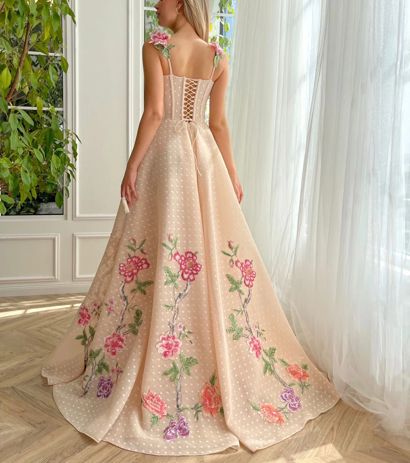 Immerse yourself in the elegance of our creamy-colored masterpiece, meticulously designed with an unrivaled attention to detail. This striking dress boasts a chic bustier corset, replete with built-in pads and supportive boning to accentuate your figure, while the cinched waist gives way to an effortlessly fluid A-line silhouette. A flirtatious leg slit adds a daring touch to the floor-sweeping skirt, which boasts a captivating embroidered design of beautiful floral motifs and lush leaves that adorn the bottom of the skirt. The dress is further enhanced by a 3D dotted mesh-net fabric that adds depth and texture to the overall design. Finishing touches of lace-up details at the back and blossom-designed straps lend an air of grace and sophistication to this magnificent ensemble, ensuring that you'll look and feel your absolute best.