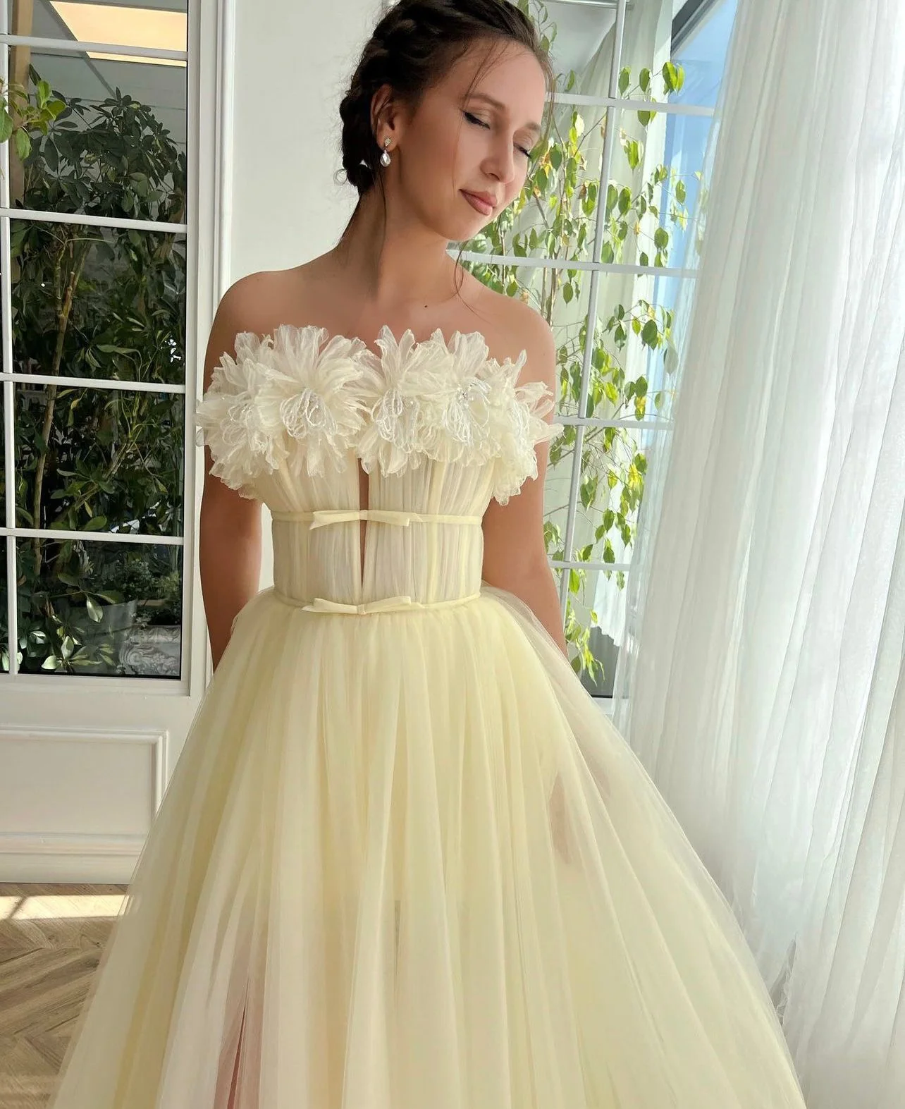 Elevate your fashion game with our buttercream-colored masterpiece, an epitome of exquisite design and delicate craftsmanship. The dress features a strapless draped bodice, lending a graceful and sophisticated air that captures the essence of timeless elegance. A pair of double bow details further enhance the charm, creating a captivating focal point. The cinched waist seamlessly transitions into an A-line silhouette that effortlessly accentuates your figure, culminating in a floor-sweeping skirt that sways with every step. A daring leg slit adds a contemporary edge to the classic design, while a lace-up back injects an alluring touch. A playful mini-skirt underlayer peeks through, adding a hint of intrigue and dimension to the dress. Above all, it's the love and attention to detail that truly sets this gown apart. Beautifully embellished with handmade embroidered flowers, this gown is not just a piece of clothing, but a labor of love, meticulously crafted to ensure you feel as stunning as you look.