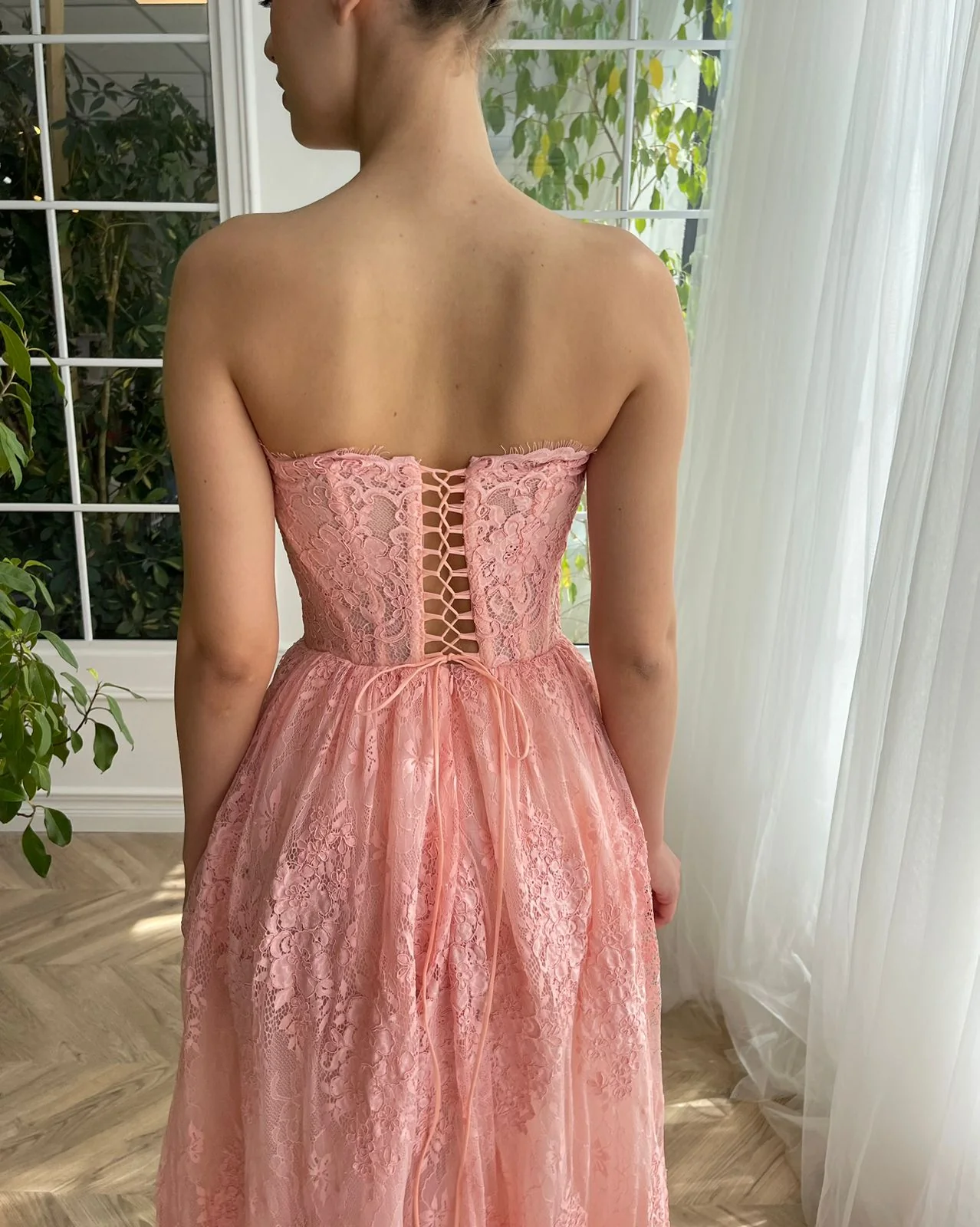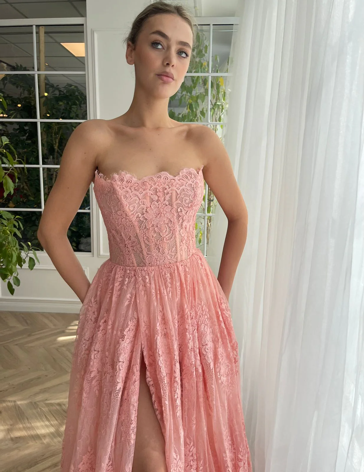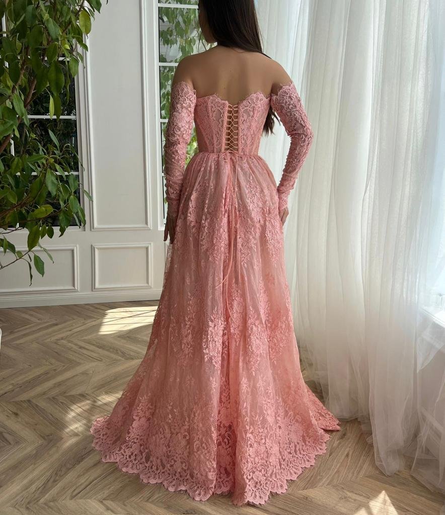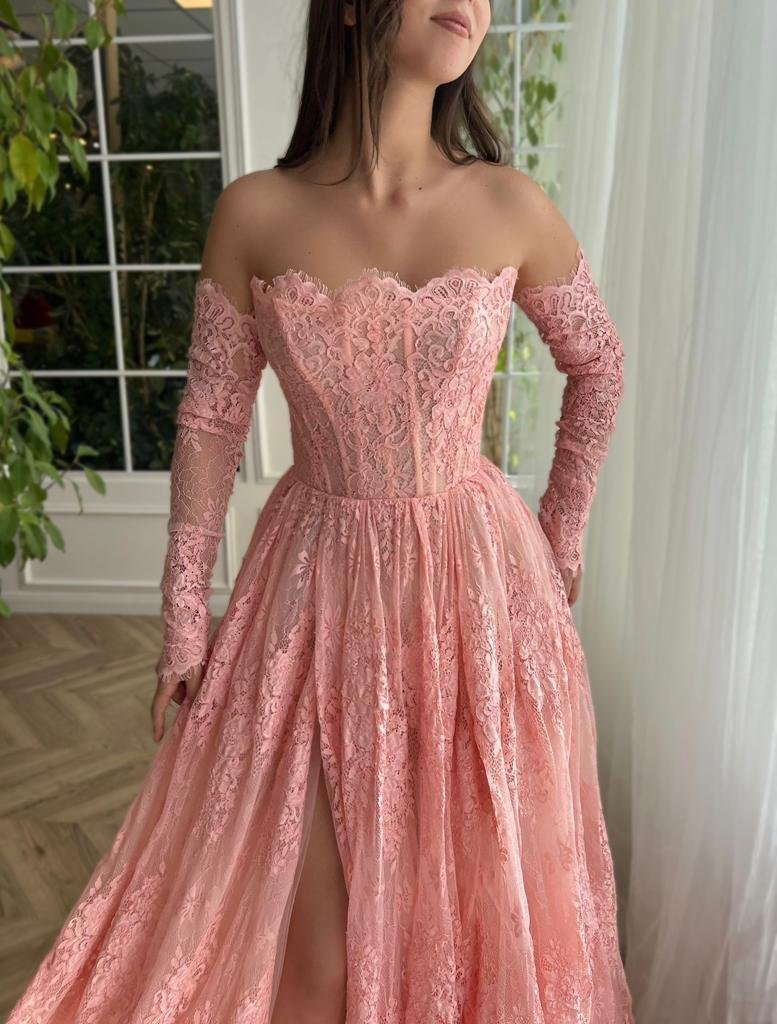 Introducing an enchanting masterpiece, carefully crafted from a delicate floral baby pink dentelle fabric that exudes elegance. This stunning gown features a romantic off-shoulder neckline and detached sleeves, offering a touch of whimsy to your look. Expertly designed with boning at the bodice and built-in pads, this dress offers an impeccable fit and graceful silhouette. The cinched waist flows into a floor-sweeping skirt, adorned with a sultry leg slit for a hint of allure. To further enhance its sophistication, the gown is equipped with inseam pockets for functionality and a lace-up back that adds a charming detail. Experience the perfect blend of romance and allure with this breathtaking piece.