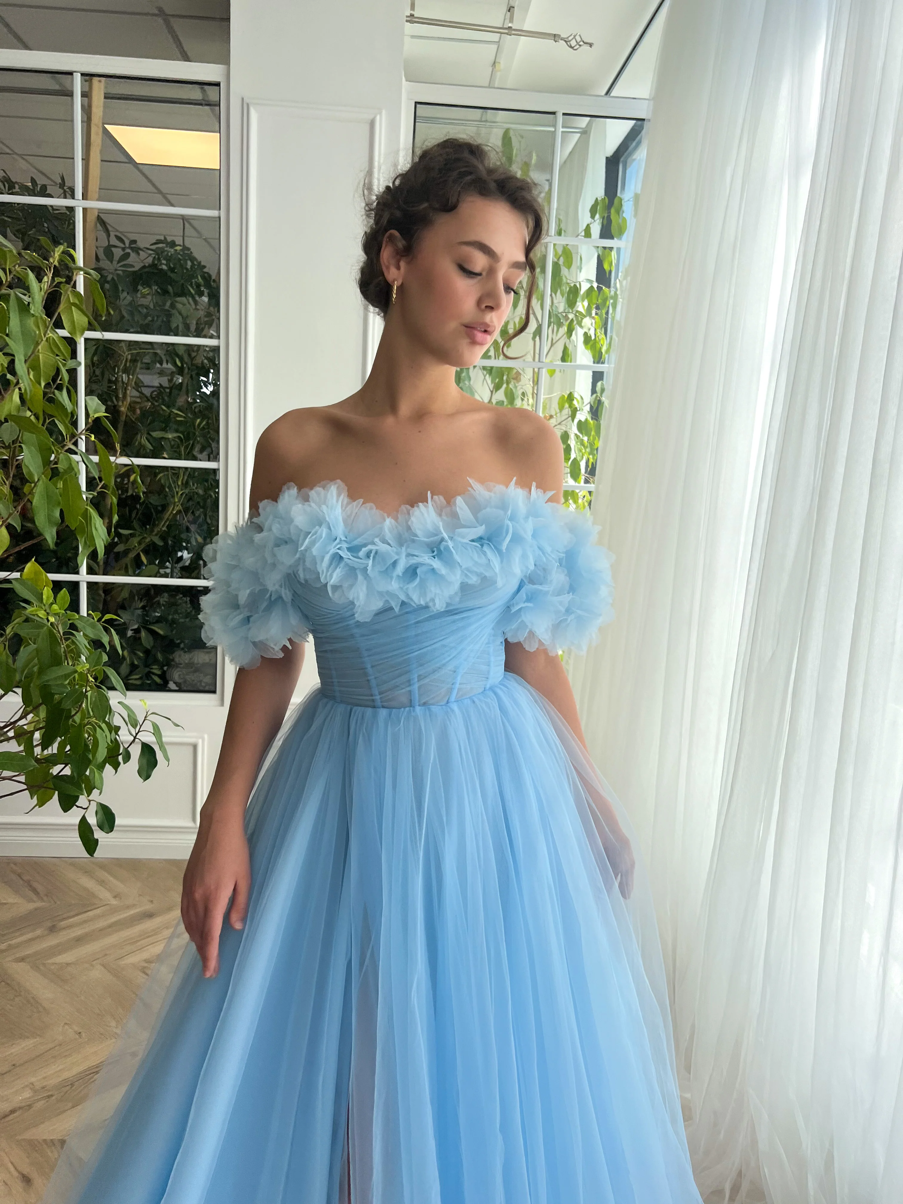 Introducing an exquisite off-shoulder gown that exudes timeless elegance, artfully crafted in a delicate baby blue hue. Embellished with intricate, handmade embroidered flowers on the shoulders, this gown captures attention with its eye-catching details. The fully-boned corset provides the perfect fit while the draped bodice adds a touch of sophistication. The cinched waist elegantly accentuates your figure, complemented by the A-line silhouette that flows gracefully into a floor-sweeping skirt. The leg slit adds a hint of allure to this enchanting ensemble, while the lace-up back ensures a customized and secure fit. Slip into this romantic gown and experience the essence of effortless beauty and timeless elegance.
