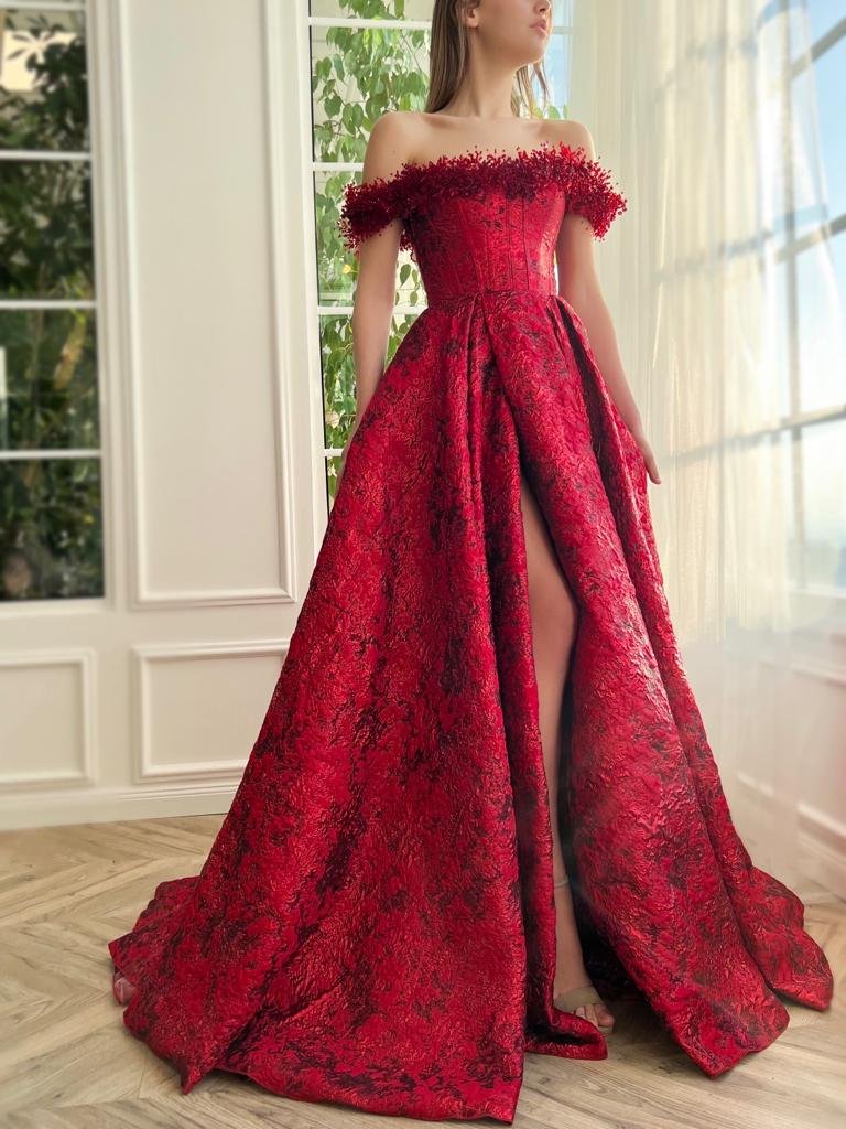 Luxurious brocade fabric shines in radiant scarlet red hues. Its bodice wraps around your body tightly for structure and shape, in contrast to the fairytale-like skirt that dances in harmony. As much as it is a breathtaking ensemble of a gown, the magic of it still lies in the details; delicate handmade embroideries, inseam pockets and a beautiful leg slit.