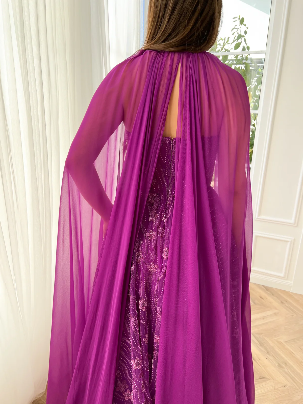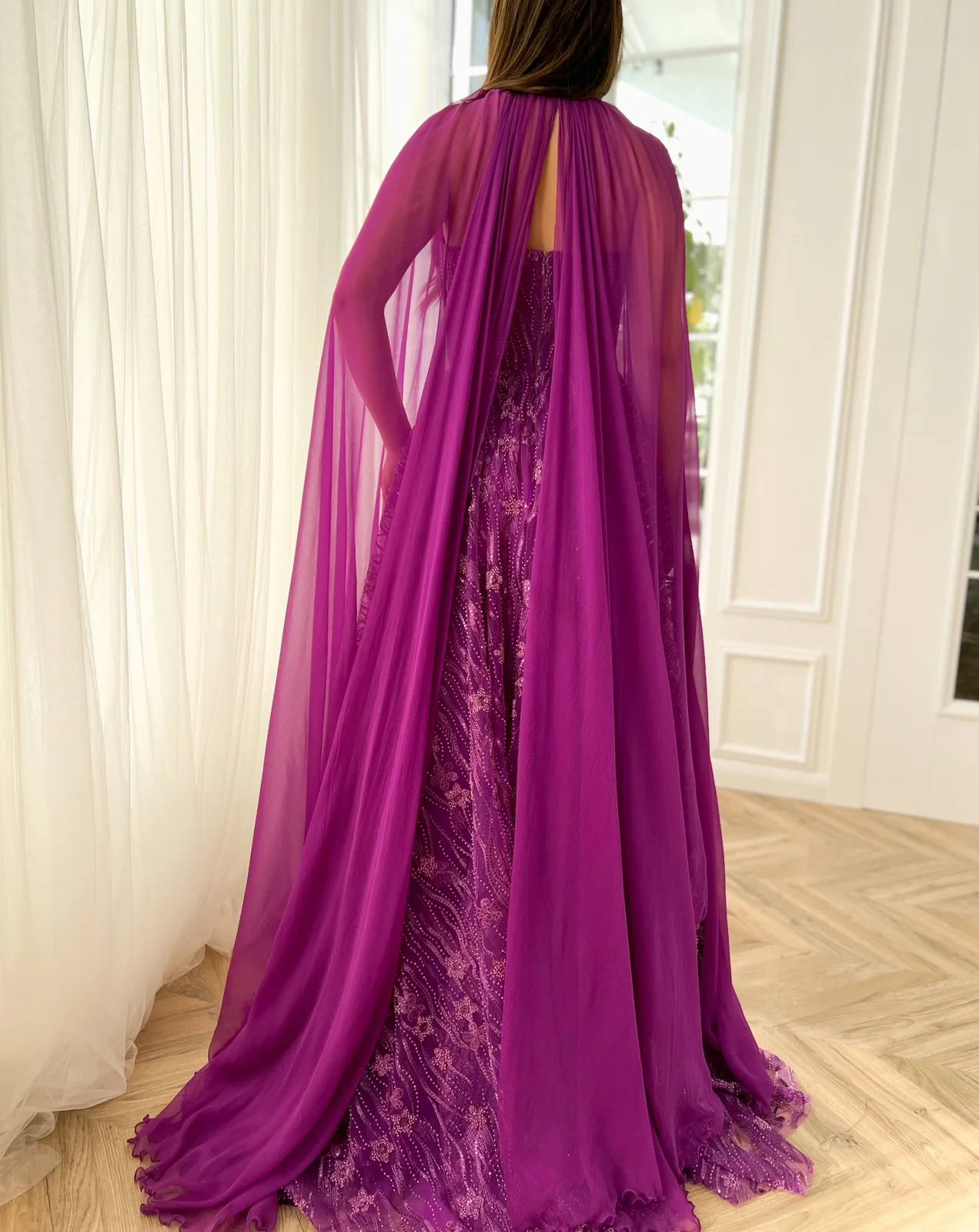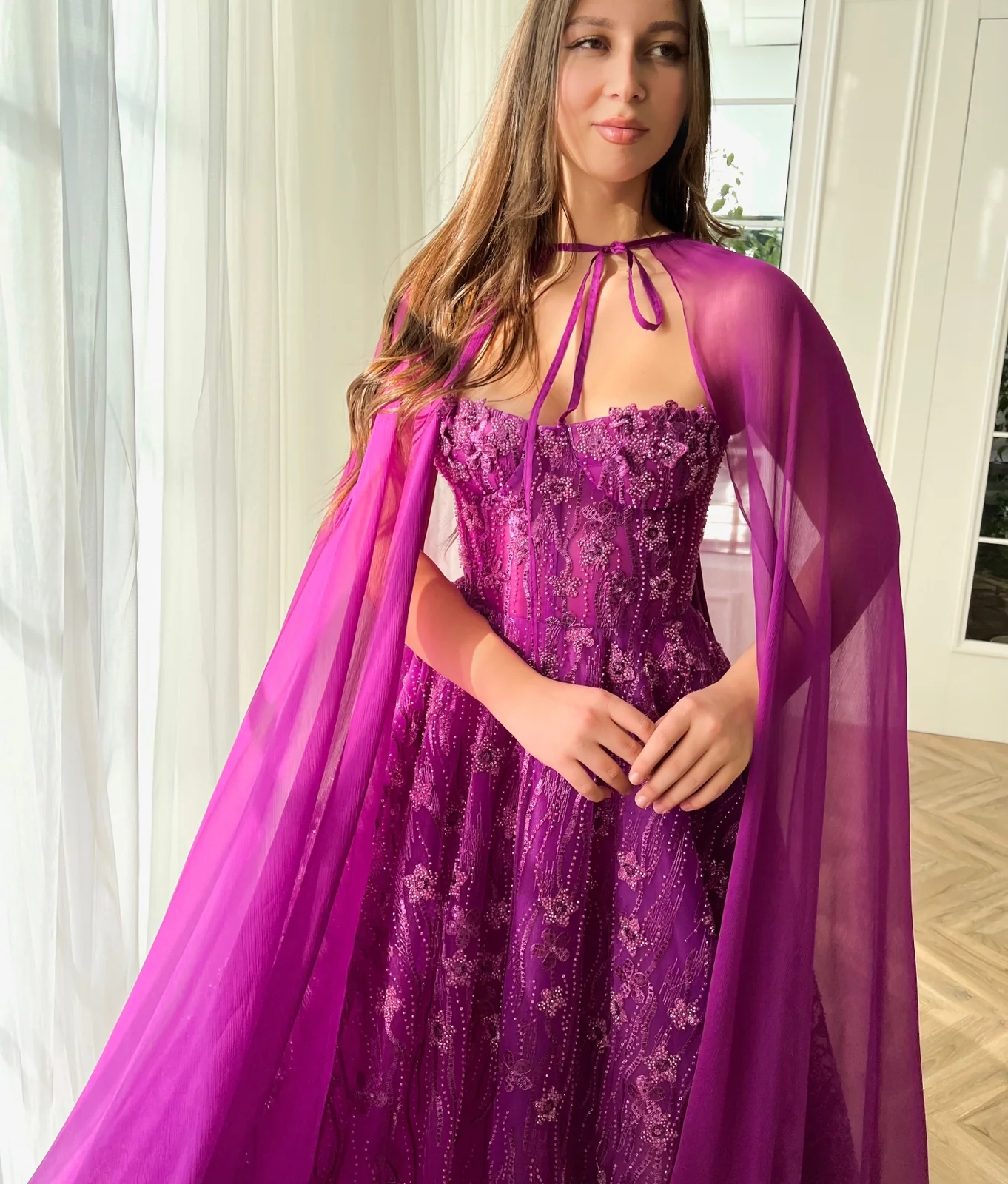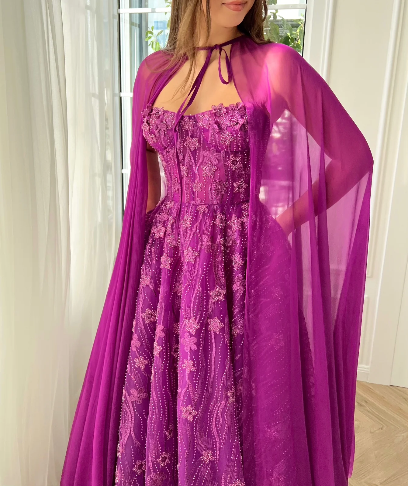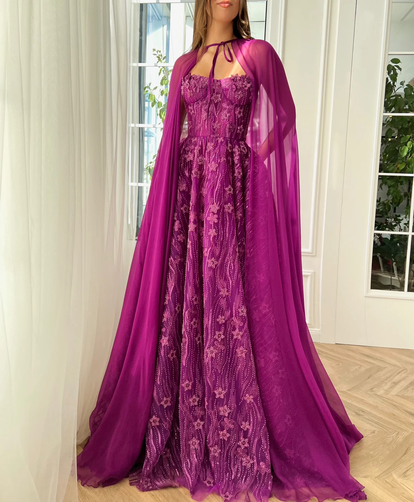 This breathtaking fuchsia gown is a true work of art. The delicate flowery lace fabric is the perfect choice for a romantic, feminine look. Its strapless-hearty neckline is both sweet and sultry. The A-line silhouette is figure-flattering while the floor-length skirt adds a touch of drama. And for the ultimate in whimsy and glamour, the gown is completed with an optional pure silk cape.
