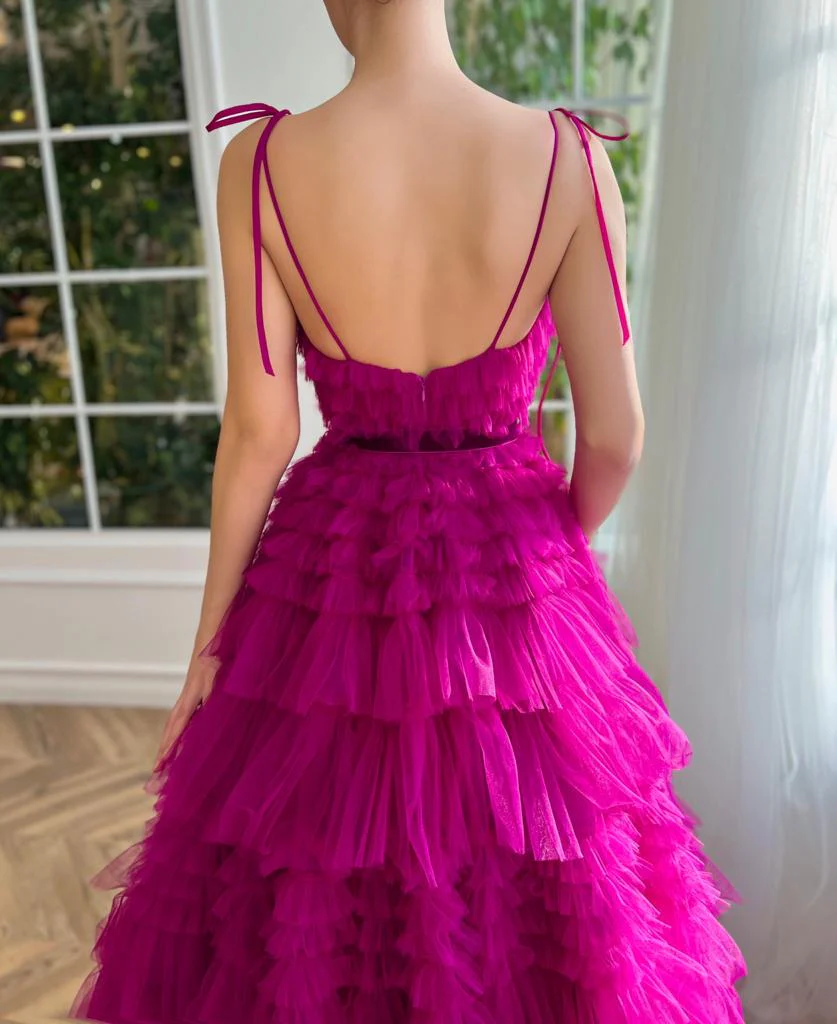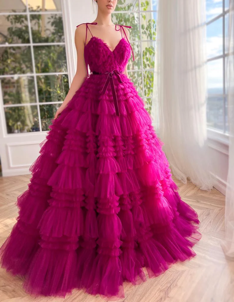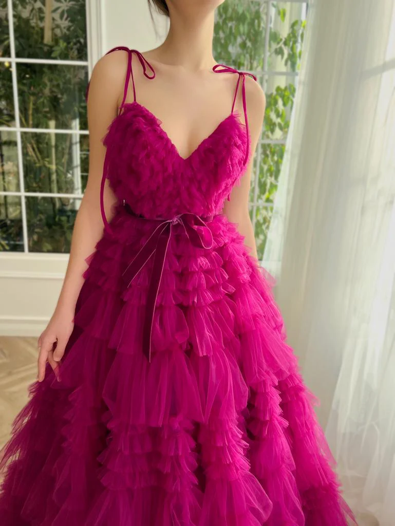 With delicate ruffles and a V-neckline accented by spaghetti straps, this gown is both alluring and graceful. The draped bodice provides a touch of drama, while the waist definition and decorative bow belt add a touch of whimsy. The A-line silhouette is both classic and flattering, flowing into a floor-length skirt that is simply divine.