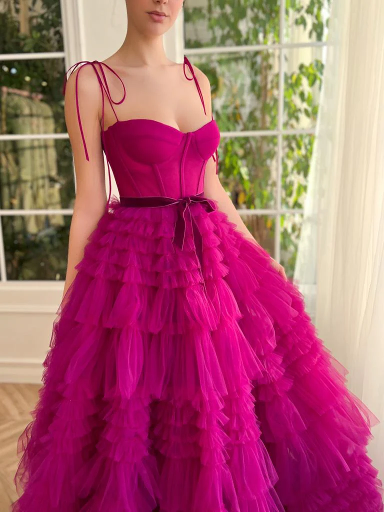 A bold fuchsia hue graces this stunning dress. Adorned with spaghetti straps for a delicate, summery look. Its waist is defined by a decorative bow belt, adding a touch of femininity to the garment. The A-line silhouette flatters the figure and the floor-length ruffled skirt adds a touch of drama and movement.