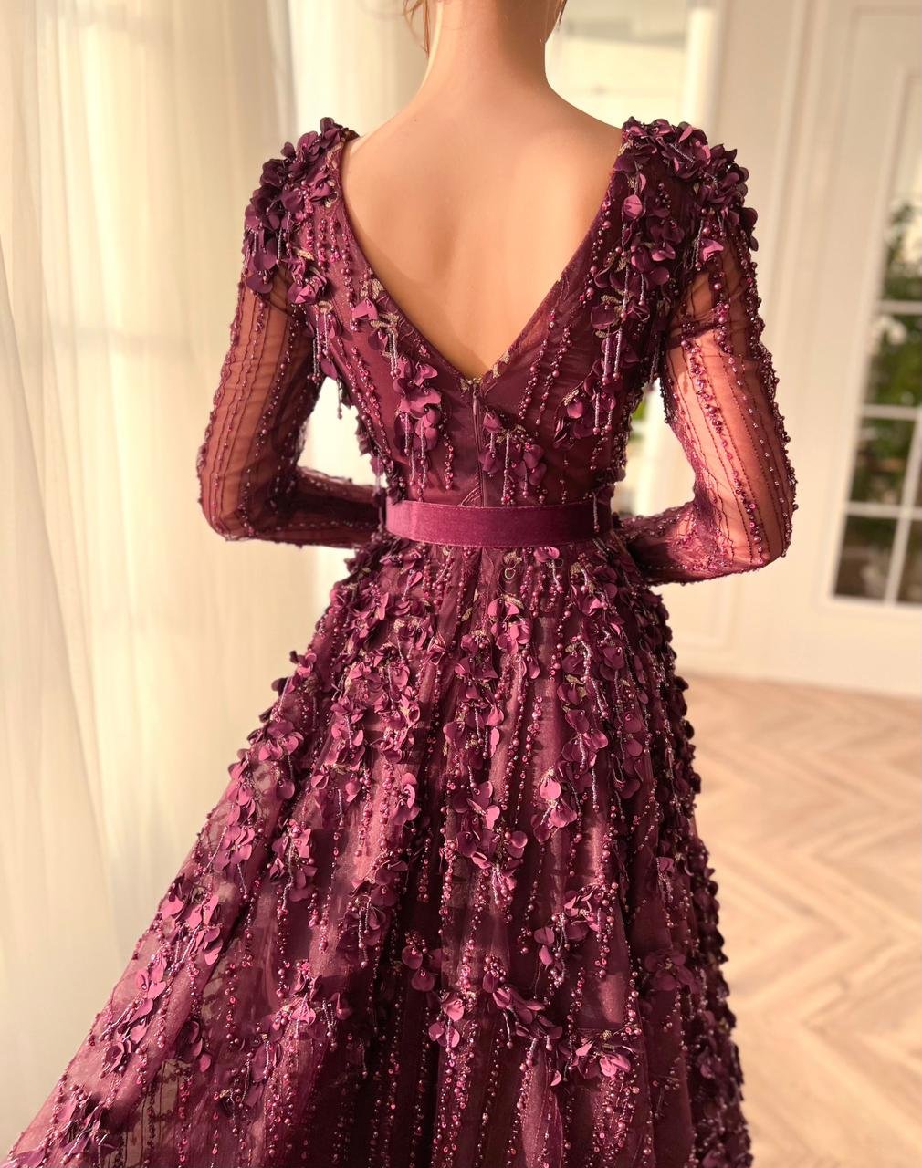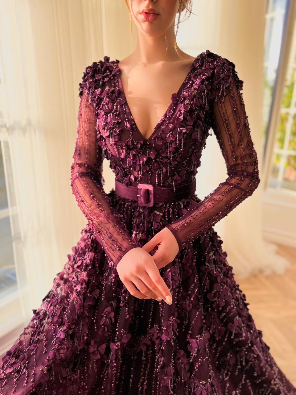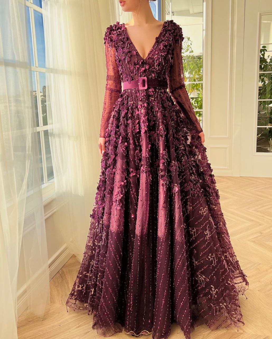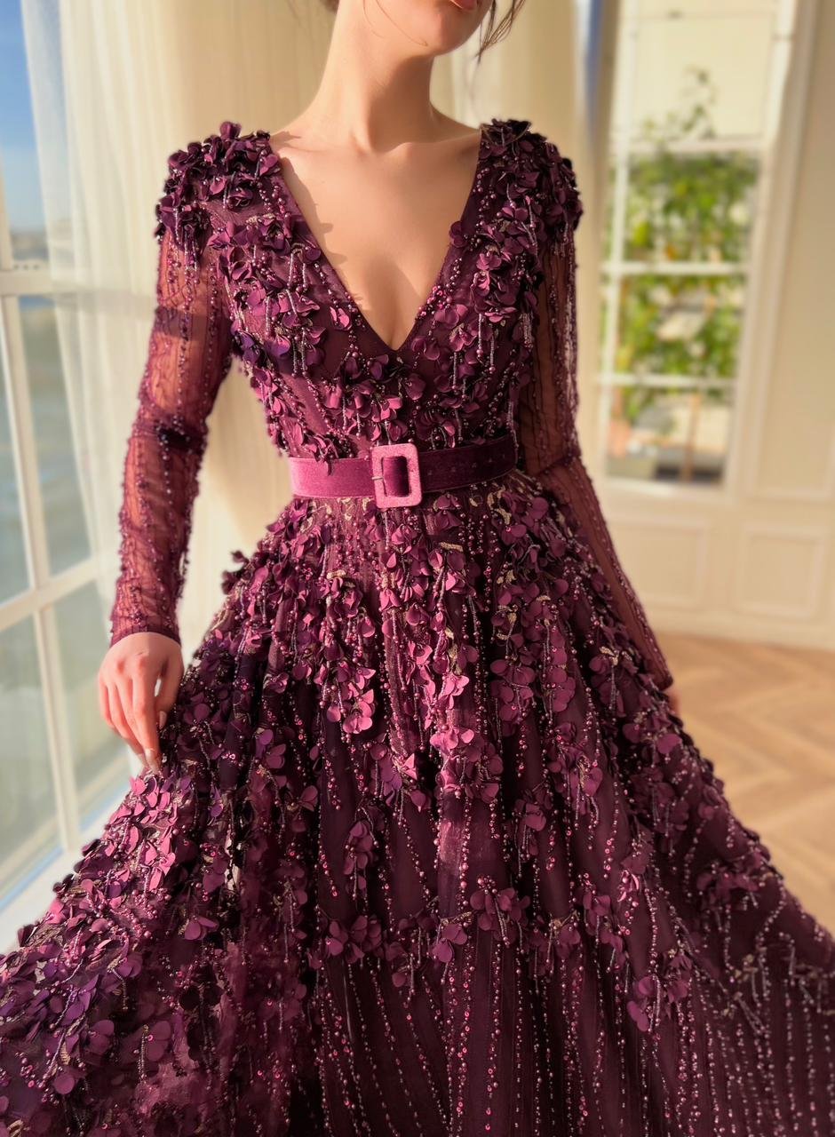Introducing the incredibly glamorous velvet gown created from luxurious flowery beaded fabrics. Its flattering V-neckline & an A-line silhouette are designed to shape and cinch the waist, with a beautiful velvet belt definition. A stunning magenta masterpiece, perfect for any special occasion.