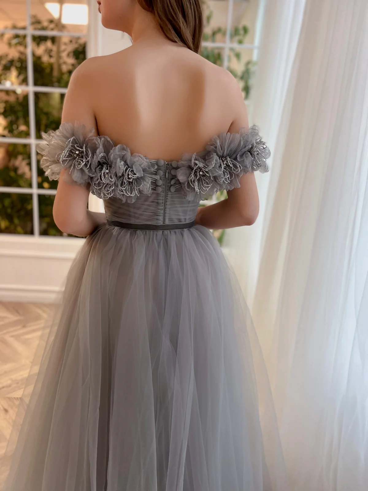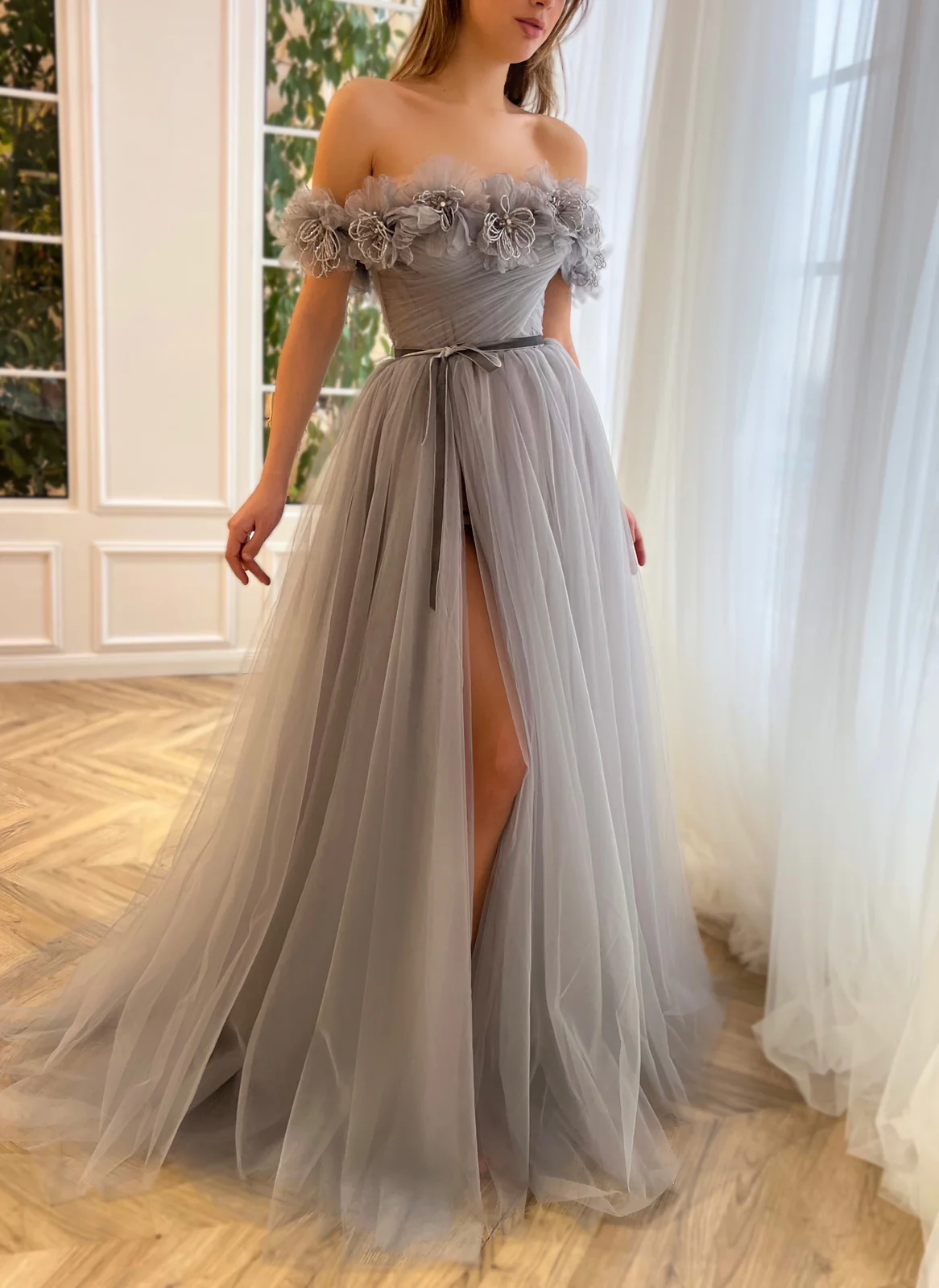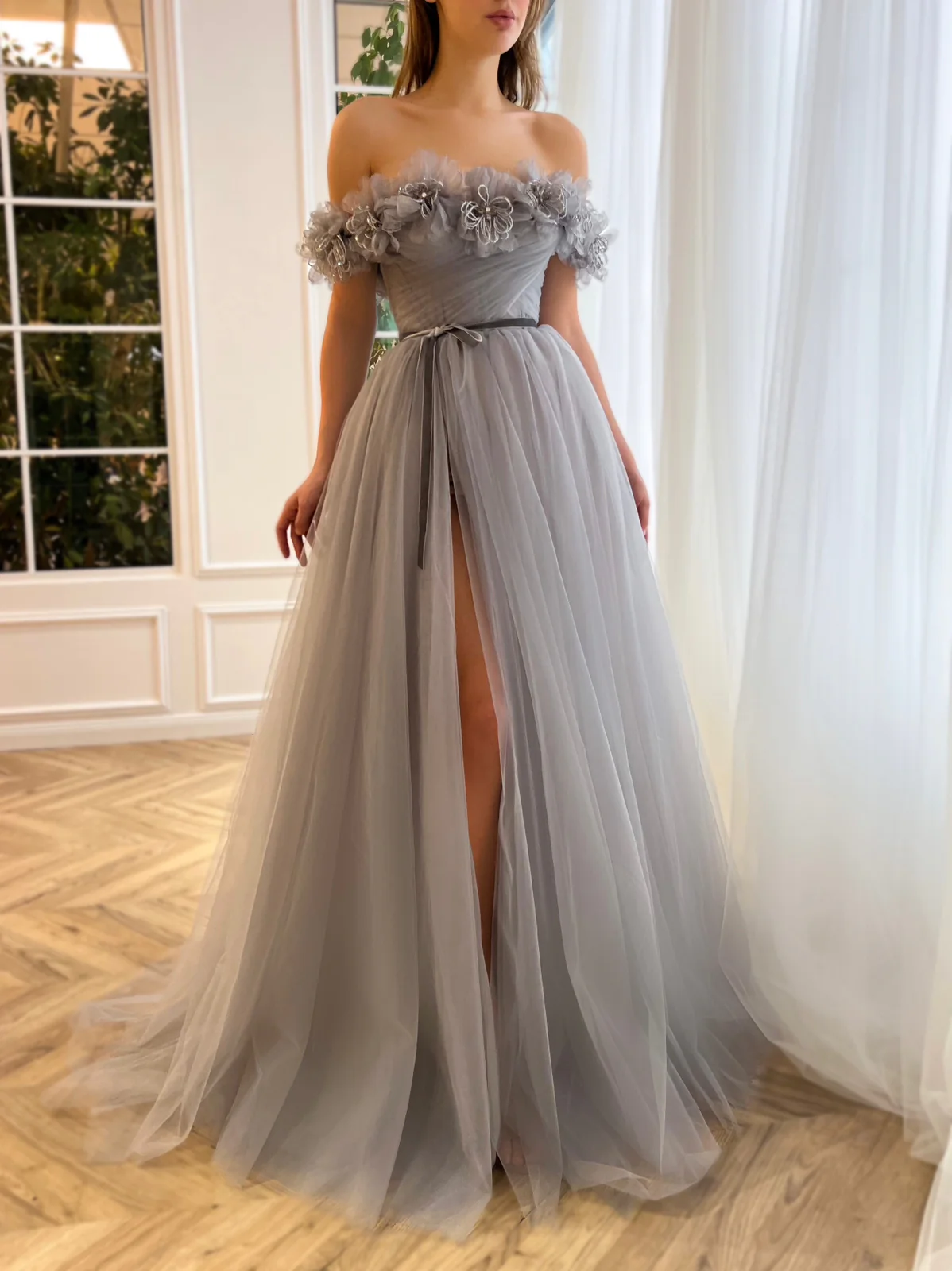 Step into beauty and elegance with this misty grey gown. Off-shoulder embroidered handmade flowers and a draping bodice add a timeless touch to the gown's A-line silhouette. The flattering floor-length skirt features a leg slit for extra glamour, while the decorative bow ribbon belt is the perfect finishing touch.
