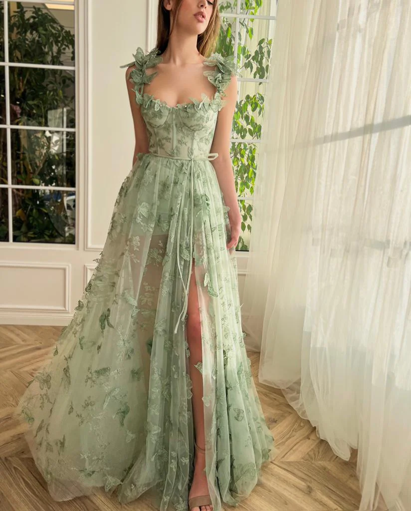 This dress boasts a stunning Ivy butterfly lace and green embroidered straps. It has a corset-style bodice that cinches at the waist and flares out into an A-line silhouette, with a leg slit and mini dress underlayer. Its floor-length skirt is paired with a decorative ribbon belt for a beautiful, feminine finish.