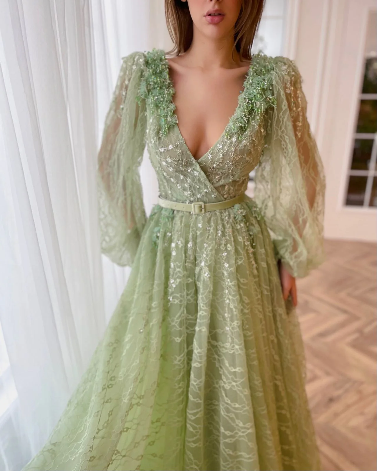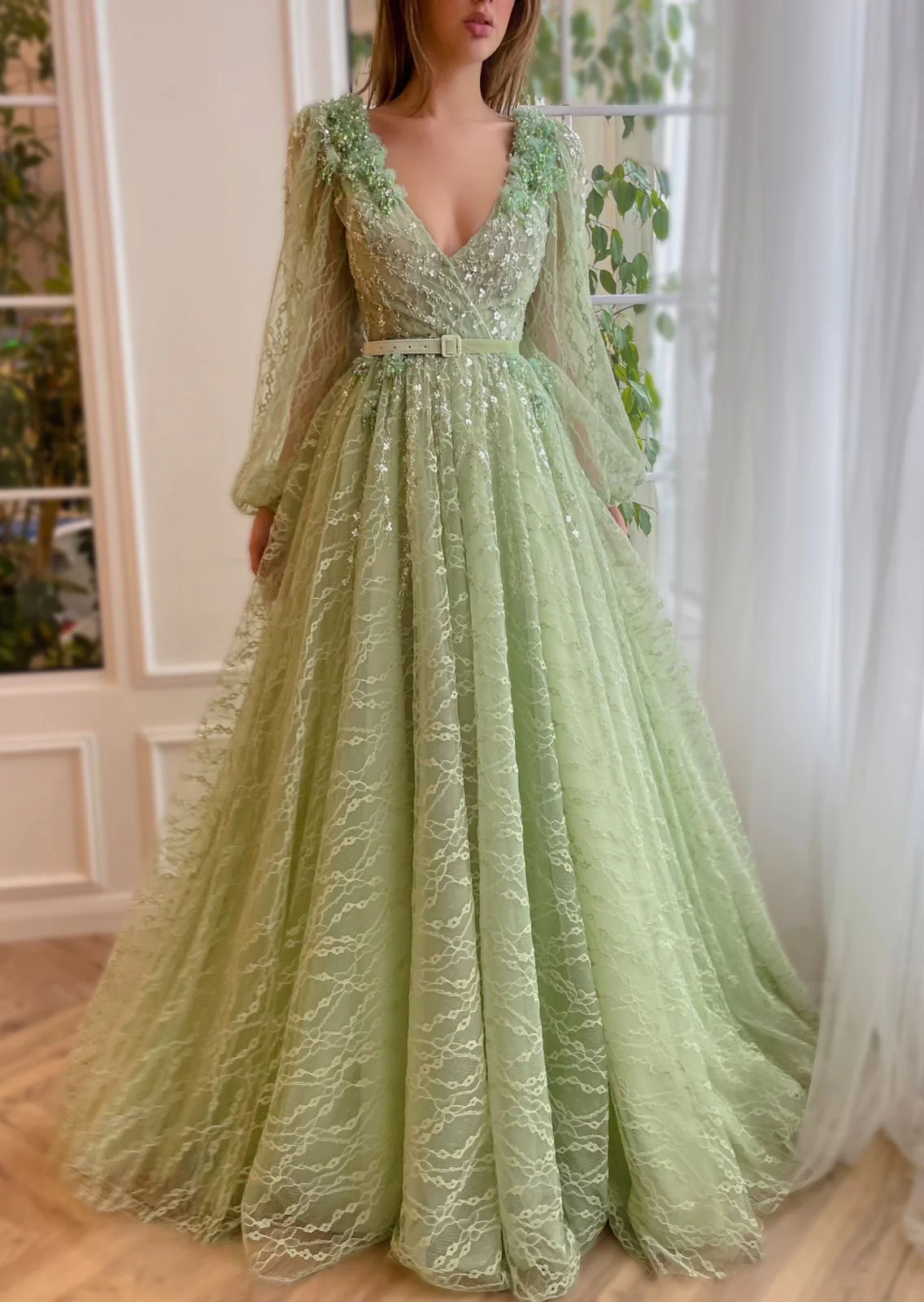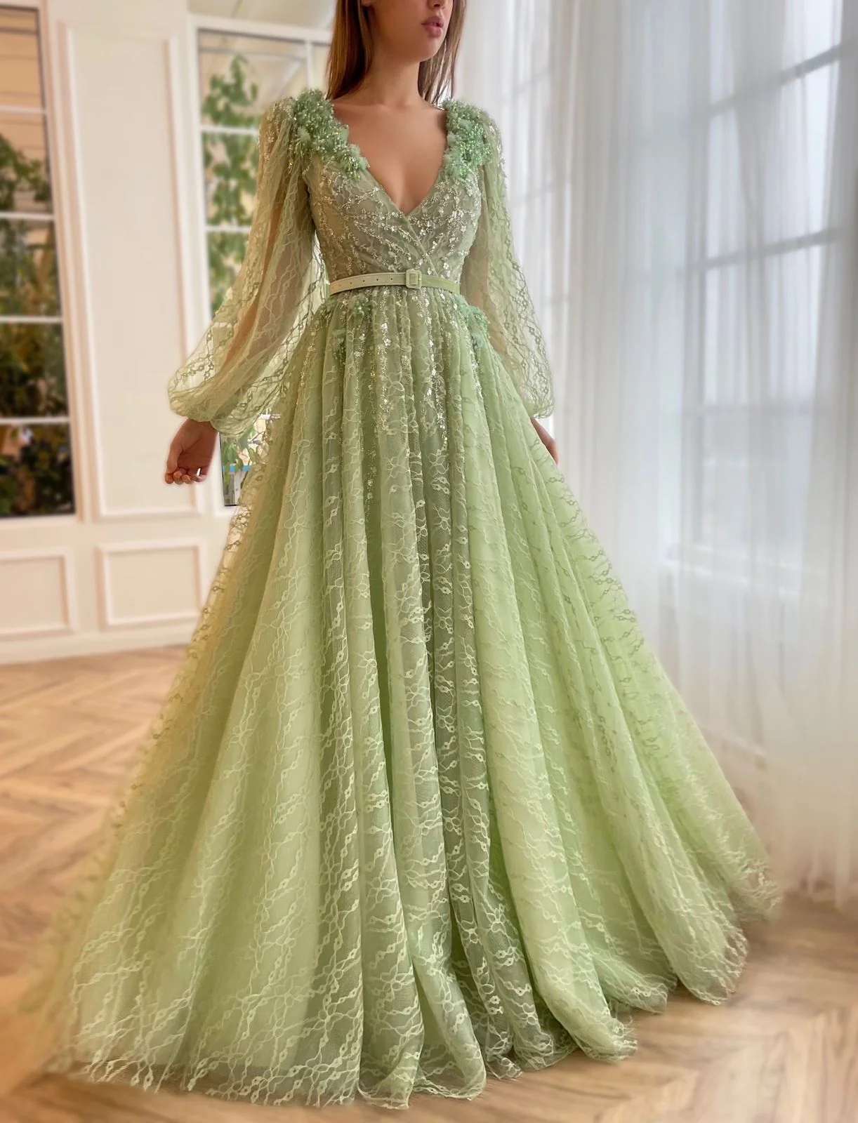 This luxurious gown features a deep V-shaped neckline, long puffy sleeves, and a dramatic open back. The A-line silhouette and floor-length skirt with a train ensure a regal presence. Adorned with embellished tiny beads and crystal flowers, the gown is completed by a decorative velvet belt. Make a statement at any formal event with this exquisite ensemble.