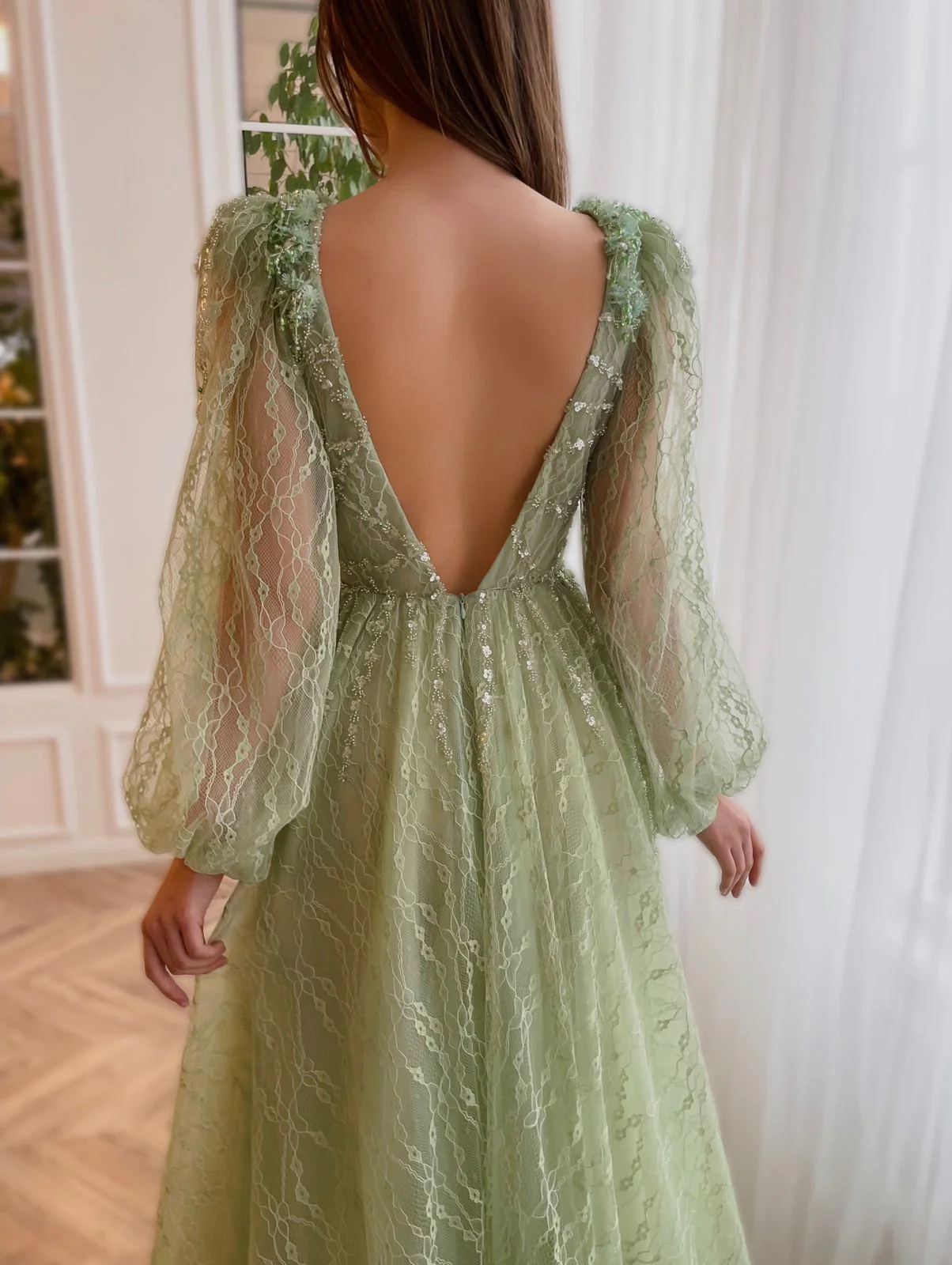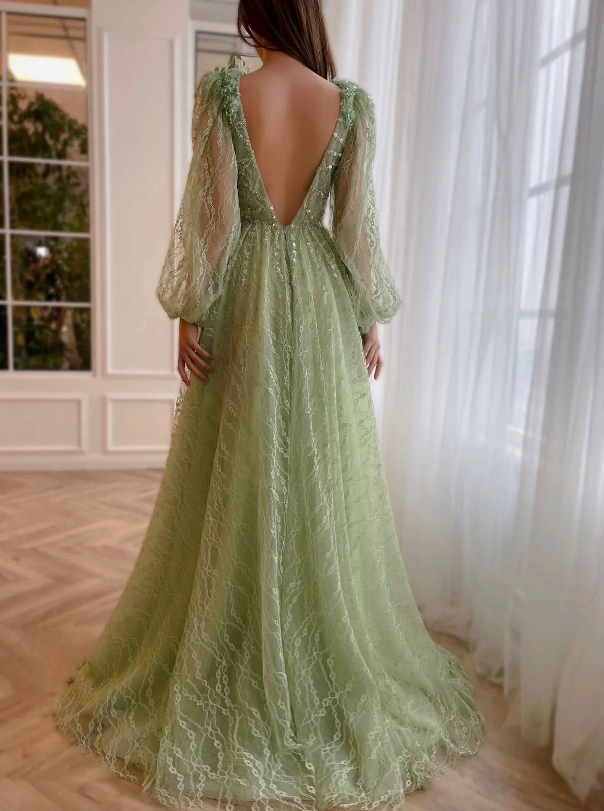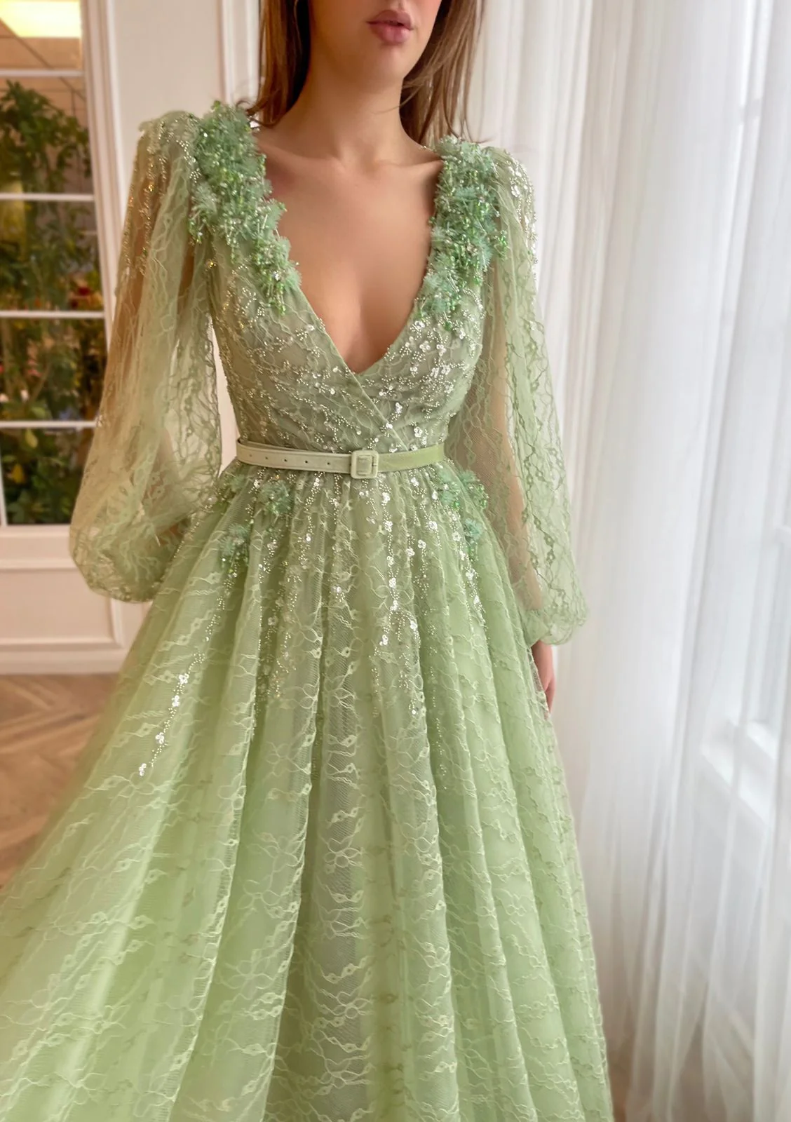 This luxurious gown features a deep V-shaped neckline, long puffy sleeves, and a dramatic open back. The A-line silhouette and floor-length skirt with a train ensure a regal presence. Adorned with embellished tiny beads and crystal flowers, the gown is completed by a decorative velvet belt. Make a statement at any formal event with this exquisite ensemble.