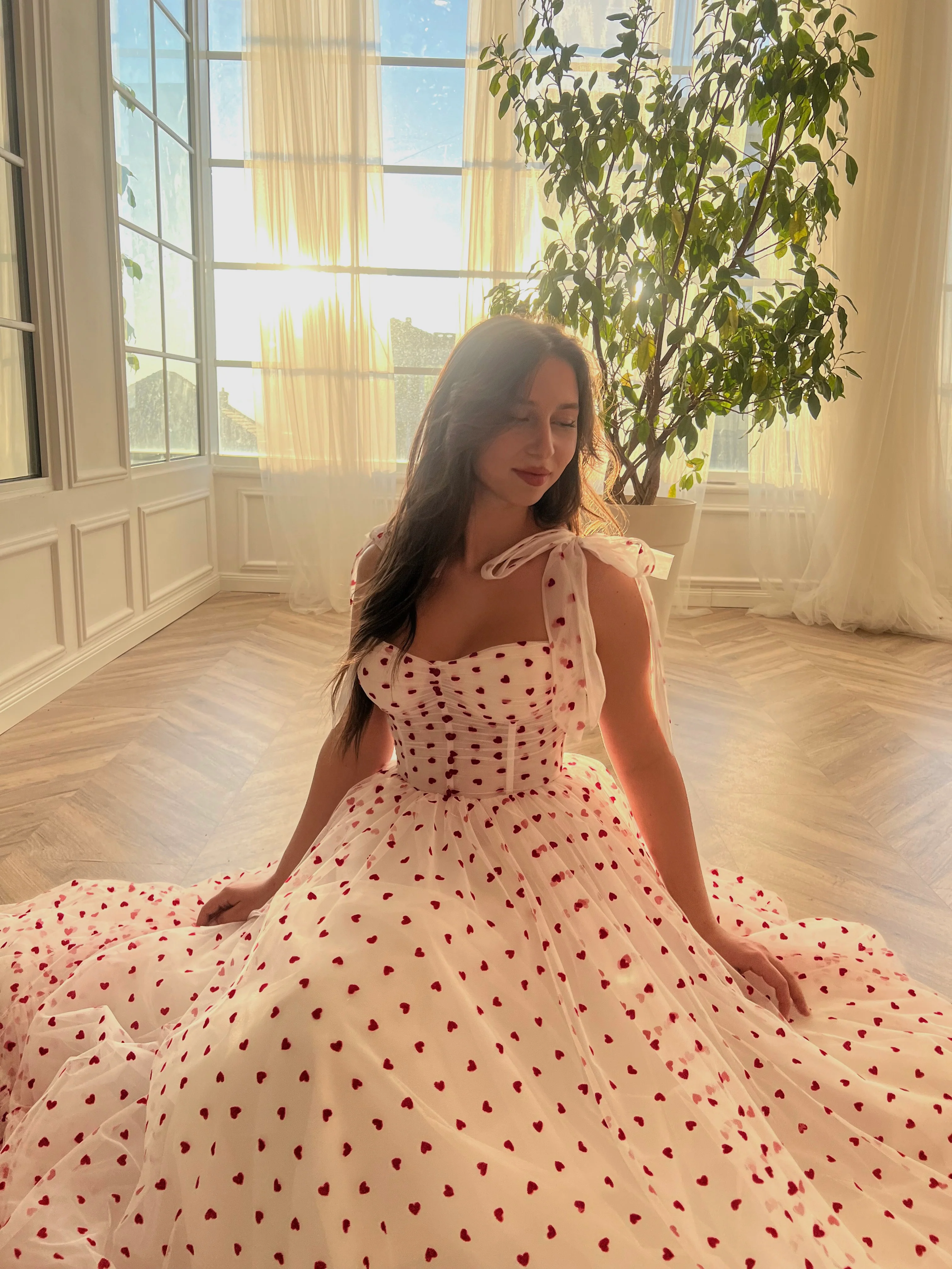 Introducing the "Bouquet of Hearts Gown" – a truly unique and enchanting piece perfect for romantic occasions. This stunning dress features eye-catching red velvet fluttering hearts on soft tulle fabric, a romantic sweetheart neckline, and a draped bodice. The A-line silhouette is complemented by a cinched waist, double bow straps, and a fully gathered skirt. Embrace the magic of love and style with this memorable ensemble.