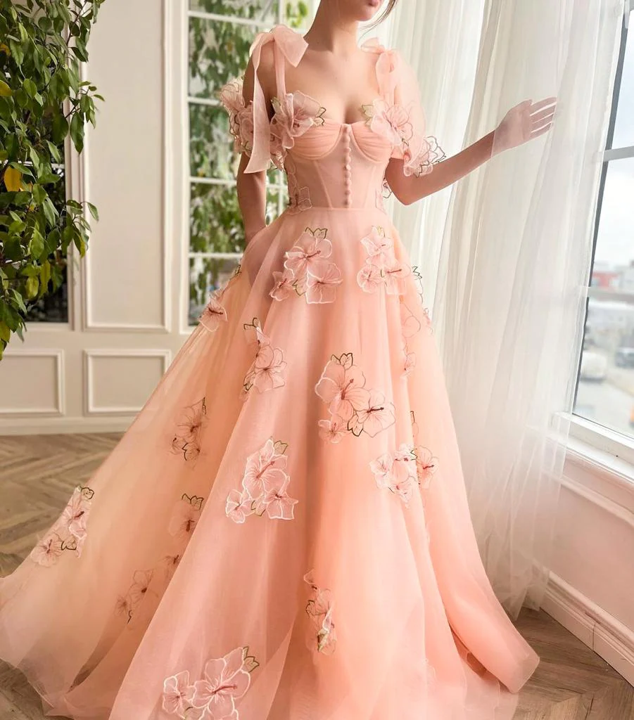 Introducing the "Juliet Peach Garden Gown" – a delightful and enchanting creation perfect for any spring or summer occasion. This exquisite dress features a peach hue, soft organza fabric, structured bustier top with boning, and a draped bust. The A-line silhouette and floor-sweeping skirt create an elegant look, while optional bow straps and 3D blossom appliques add a whimsical touch. Make a lasting impression at every event with this charming ensemble.