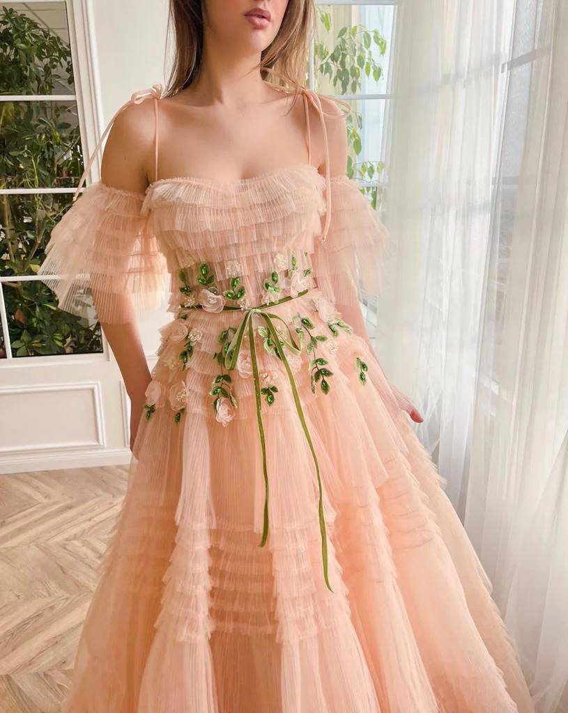 Introducing the "Peach Twilight Elegance Gown" – a stunning and dreamy creation perfect for captivating at any special occasion. This gorgeous peach tulle gown features off-shoulder flutter sleeves, delicate spaghetti straps, and a cinched waist for a flattering silhouette. The floor-length skirt is adorned with crystal embroidered leaves and blush flowers, while a decorative ribbon belt adds the perfect finishing touch. Embrace the enchanting magic of this gown for unforgettable moments.