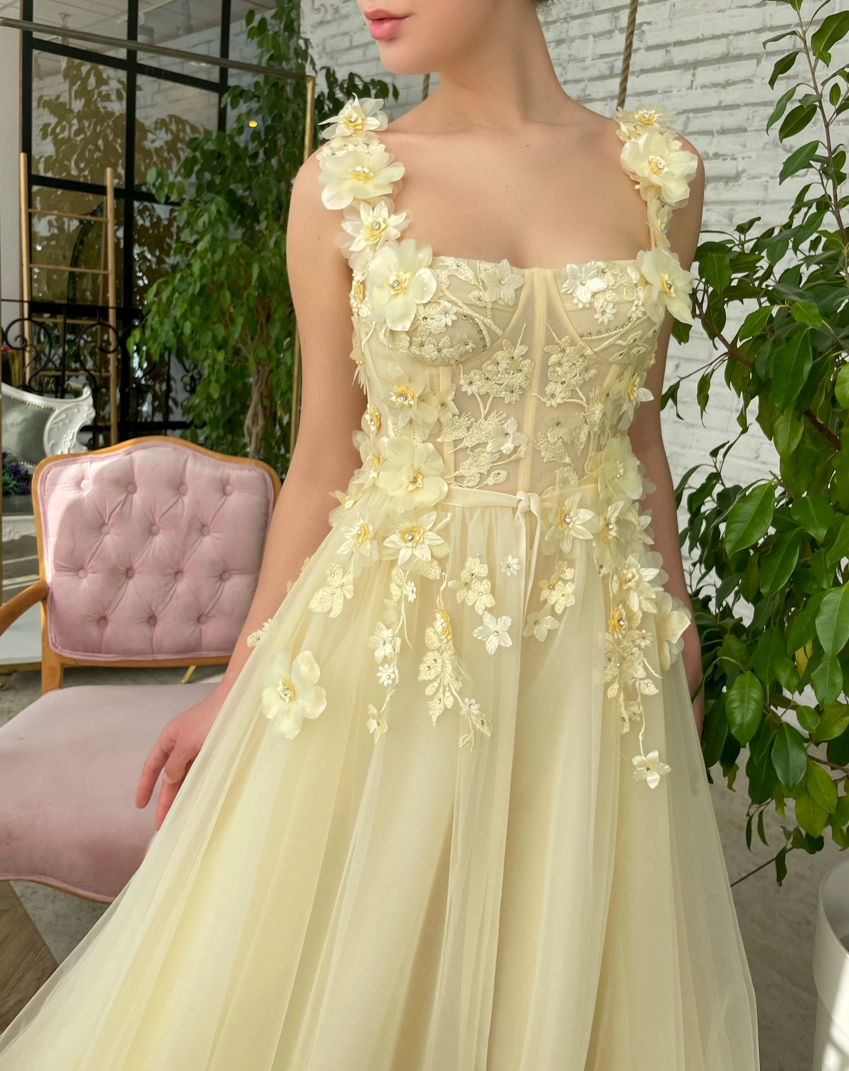Our Buttercup Sunset Gown is a dream for your next spring occasion, a floral event, or tea party with your friends. It features an embroidered floral bouquet that comes alive. What a stylish way to accent your look!