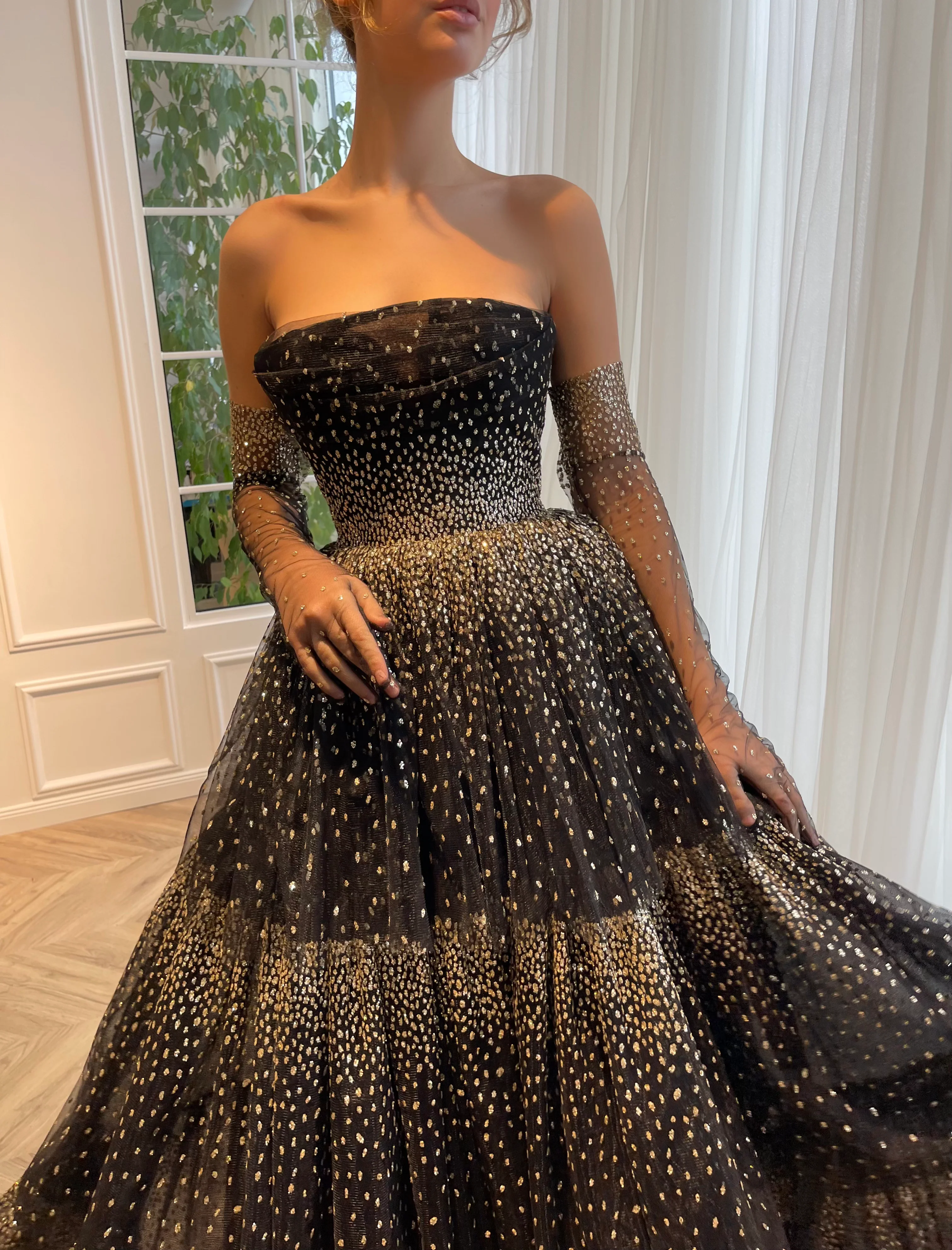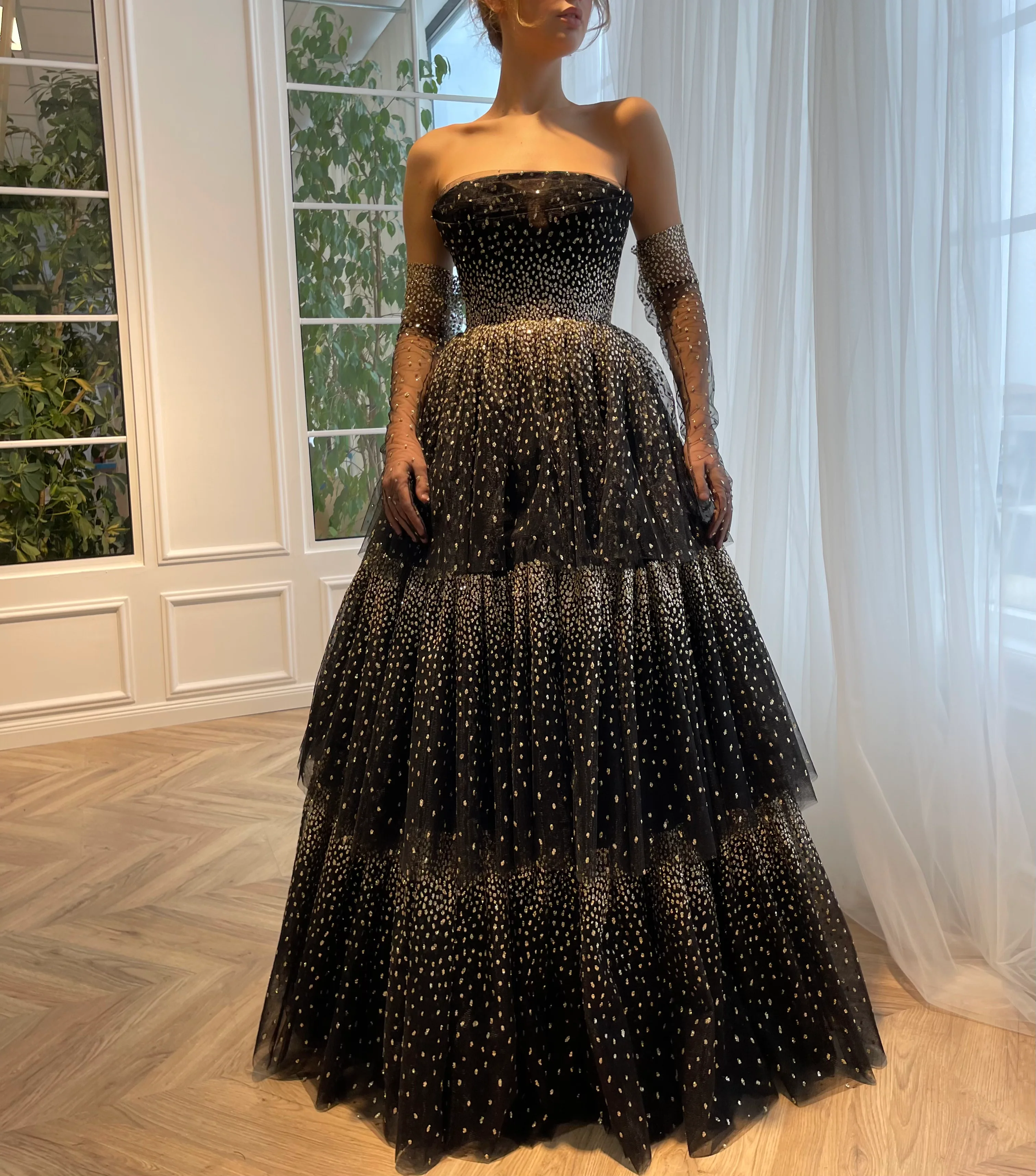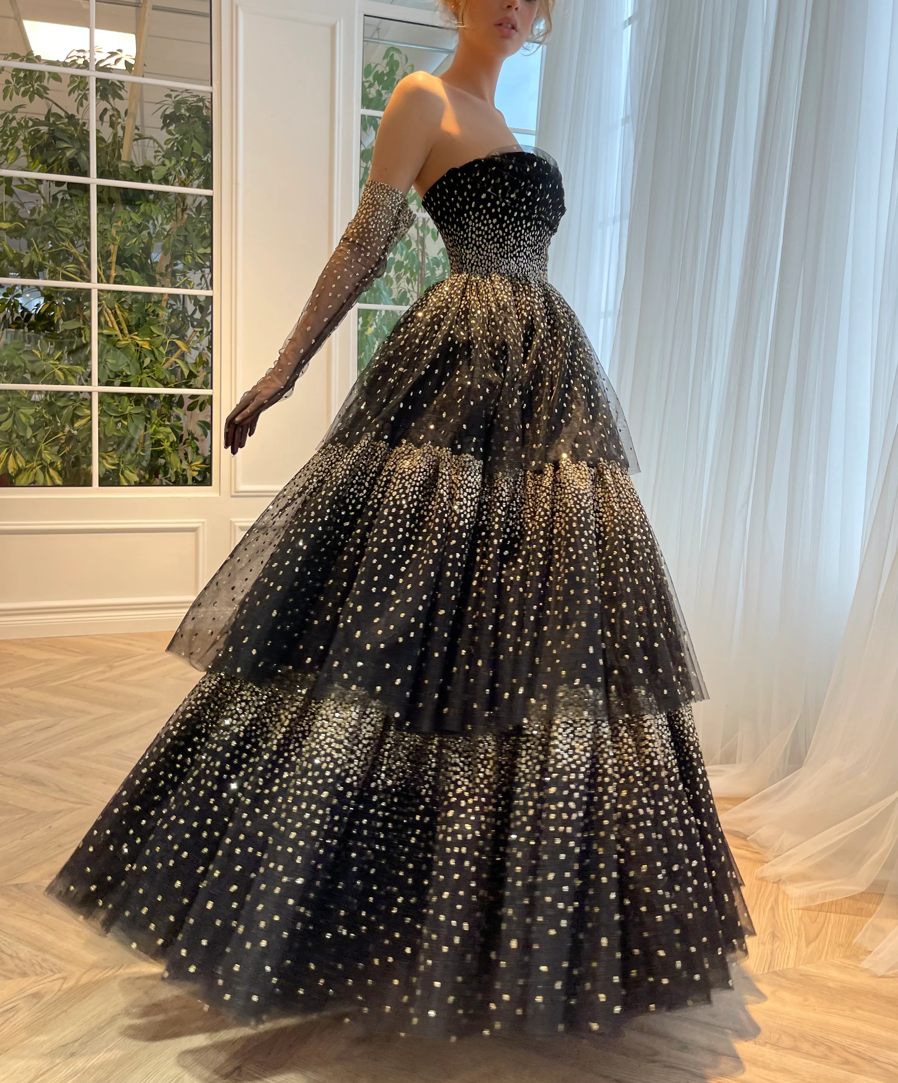 Stirring an enchanting moment of fantasies in a flirtatious glittering gown. Its tiered gathered skirt flirts in elegant movement around your body & optional opera gloves will add a splash of bright flare.