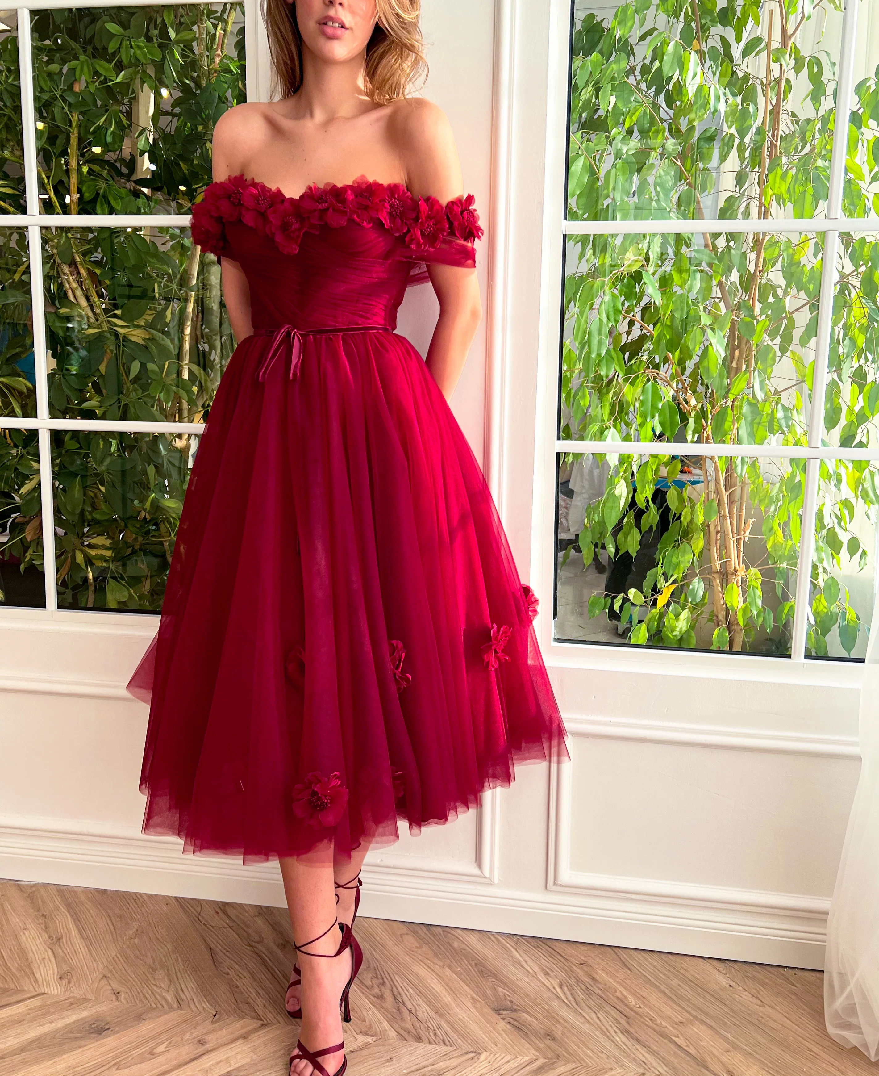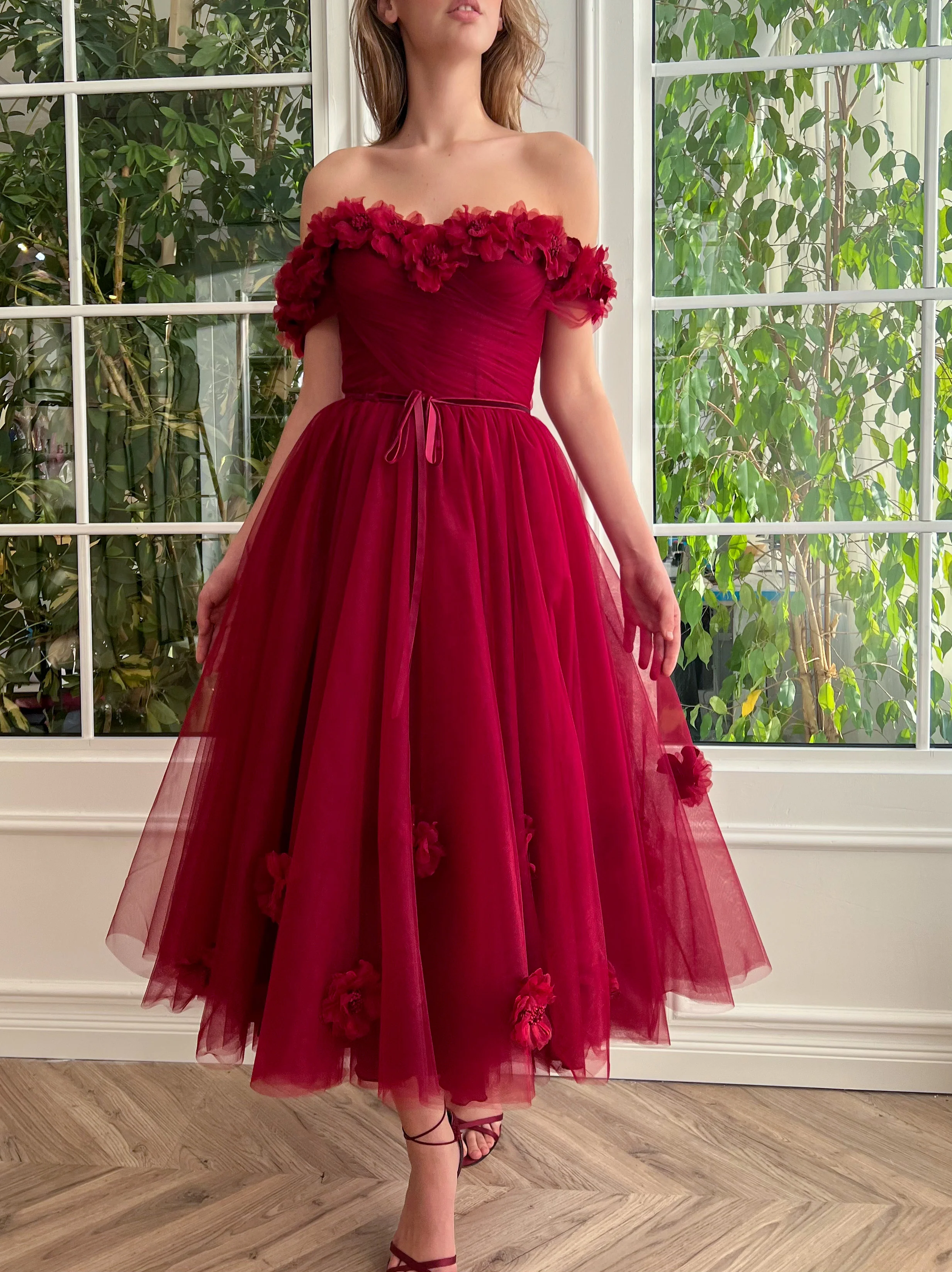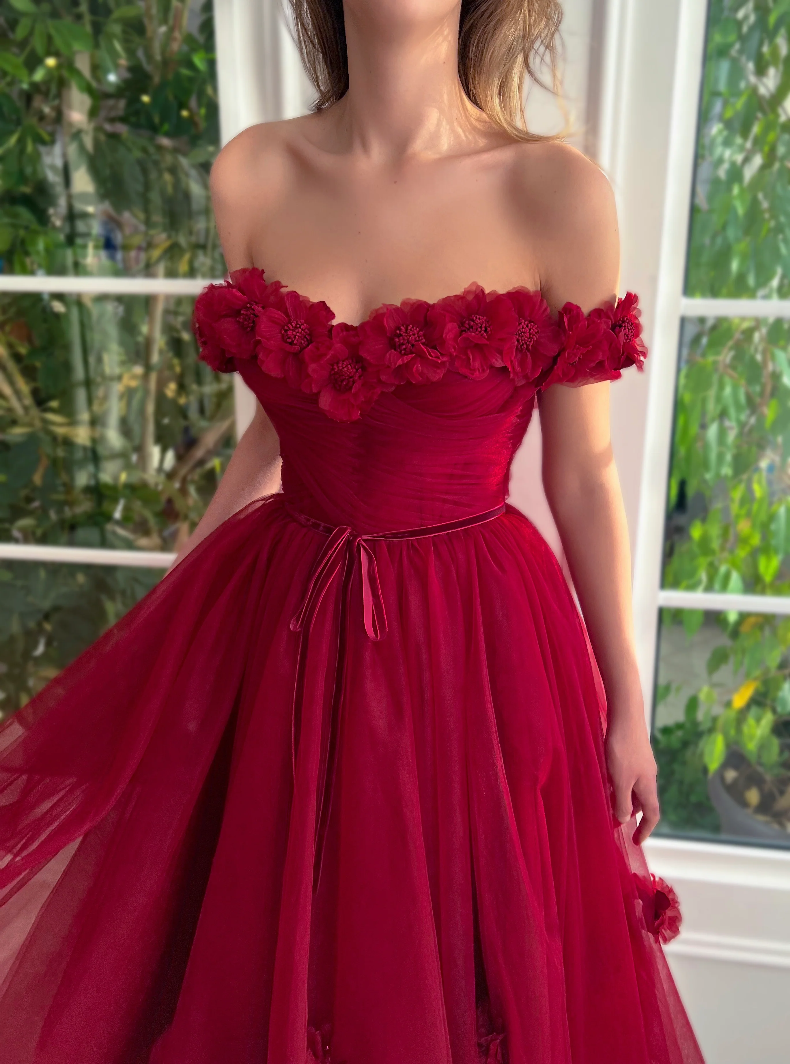 A strong color of crimson red stands out, enhancing the elegant off-shoulder midi dress. The flattering skirt is embellished with handmade flowers, while the decorative ribbon bow belt adds a final perfect touch.