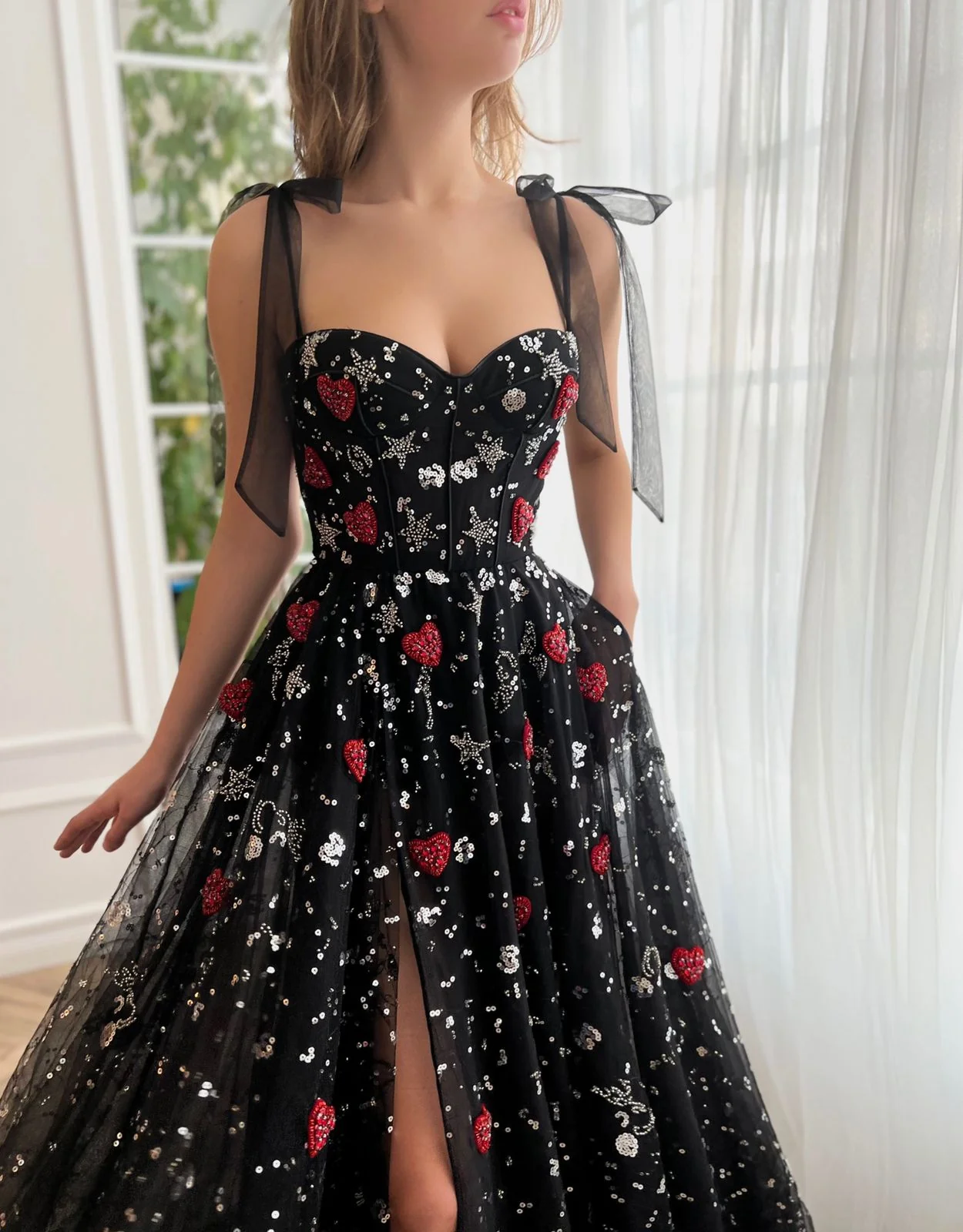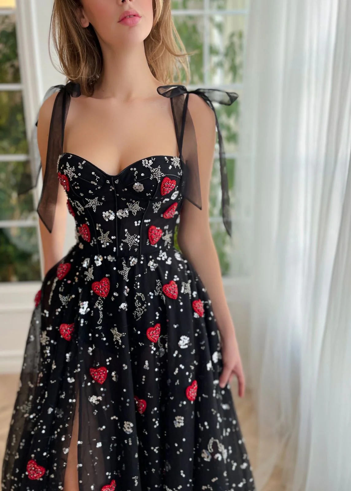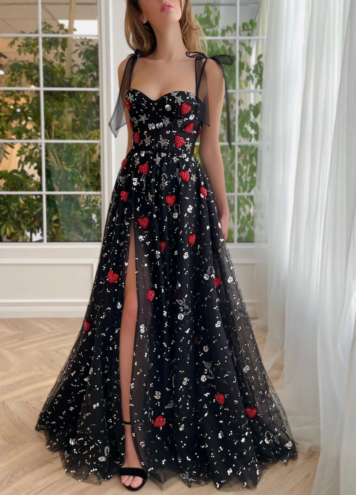 Stun in every step with this floor-sweeping length & flattering corset bodice gown. Sheer, layered fabric is adorned with a constellation of stars and scarlet hearts, while the A-line silhouette and leg slit add to your magic.