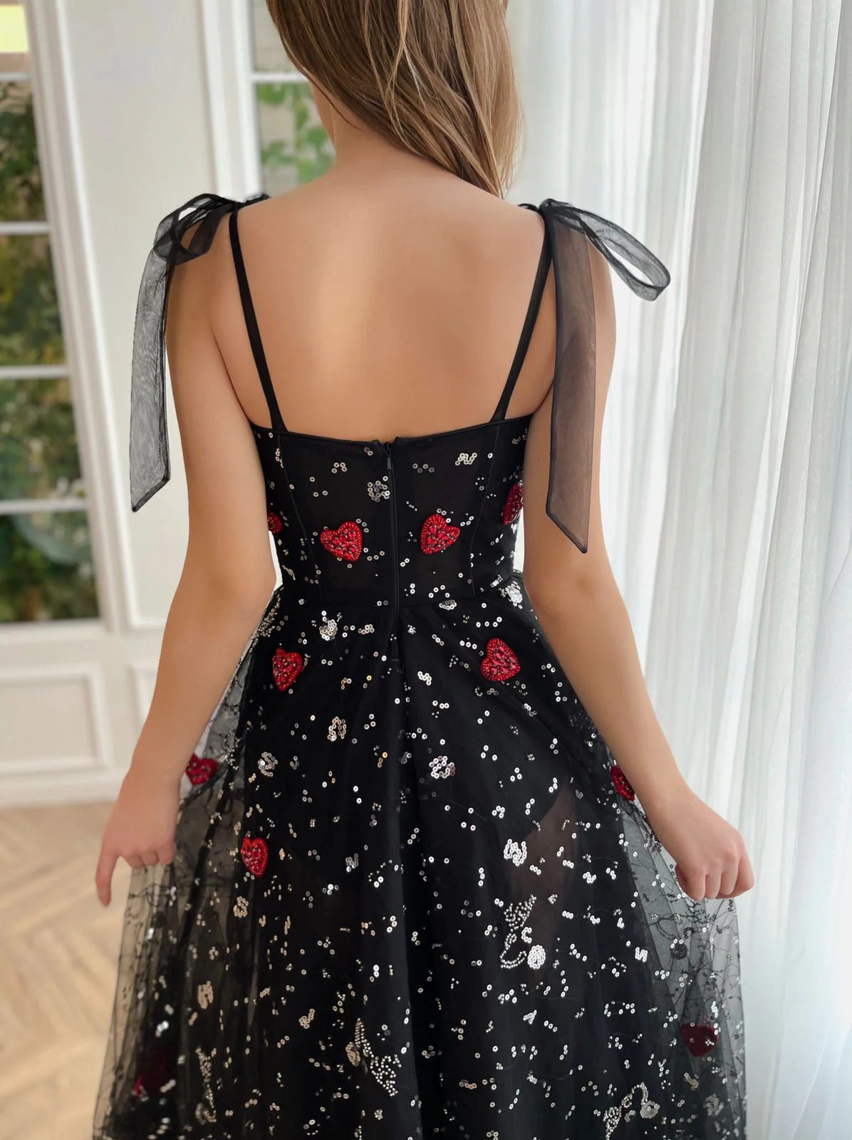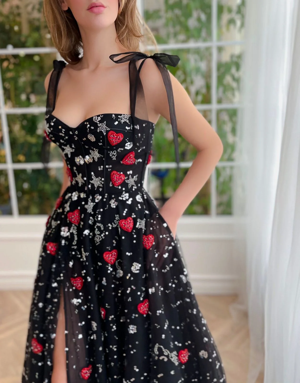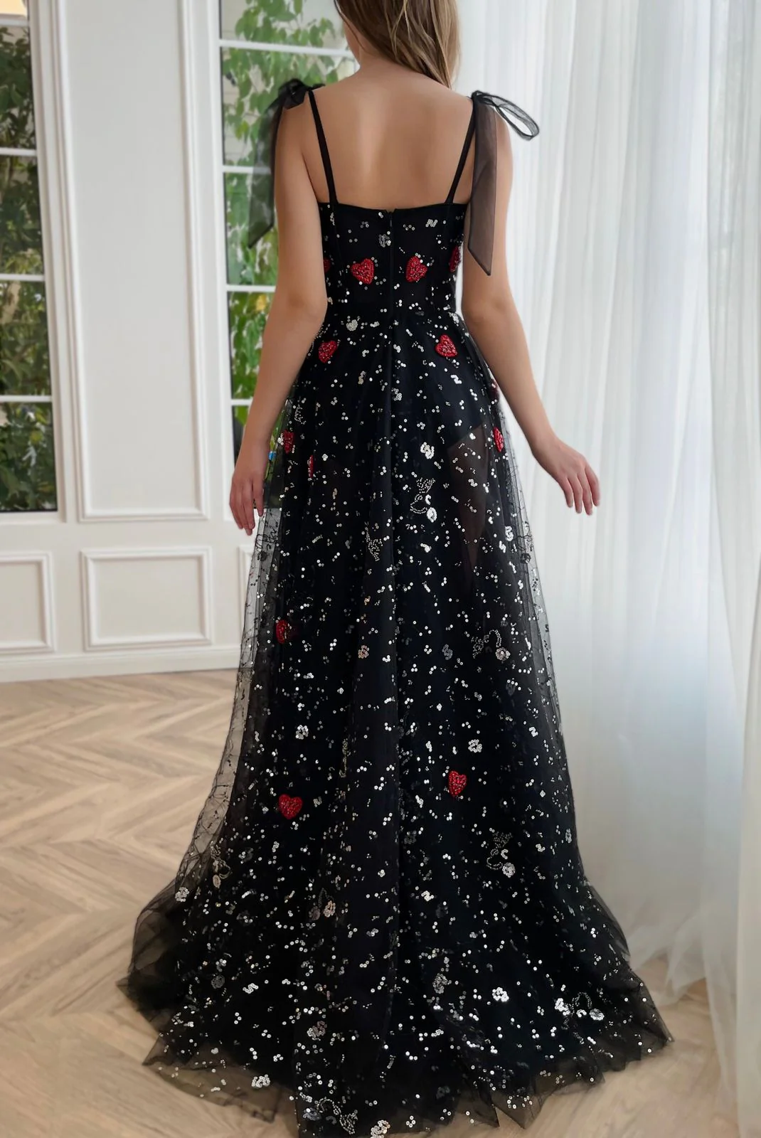 Stun in every step with this floor-sweeping length & flattering corset bodice gown. Sheer, layered fabric is adorned with a constellation of stars and scarlet hearts, while the A-line silhouette and leg slit add to your magic.