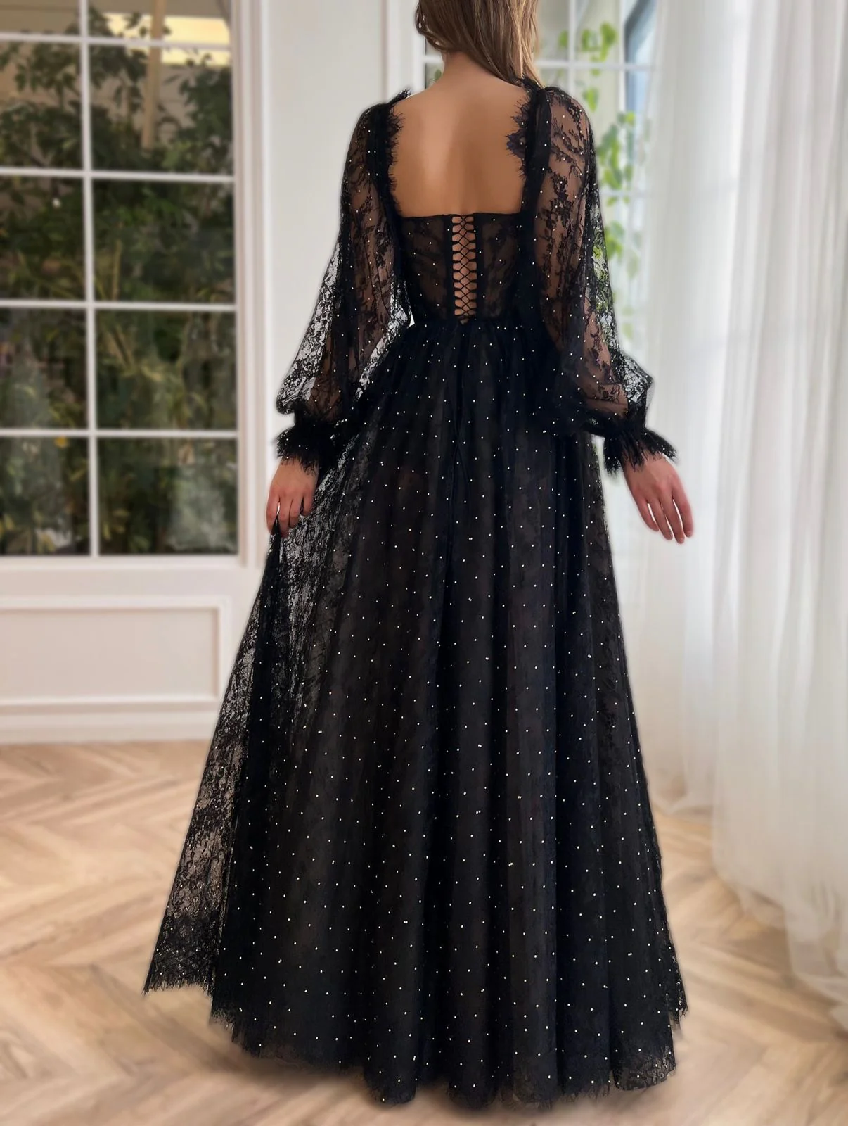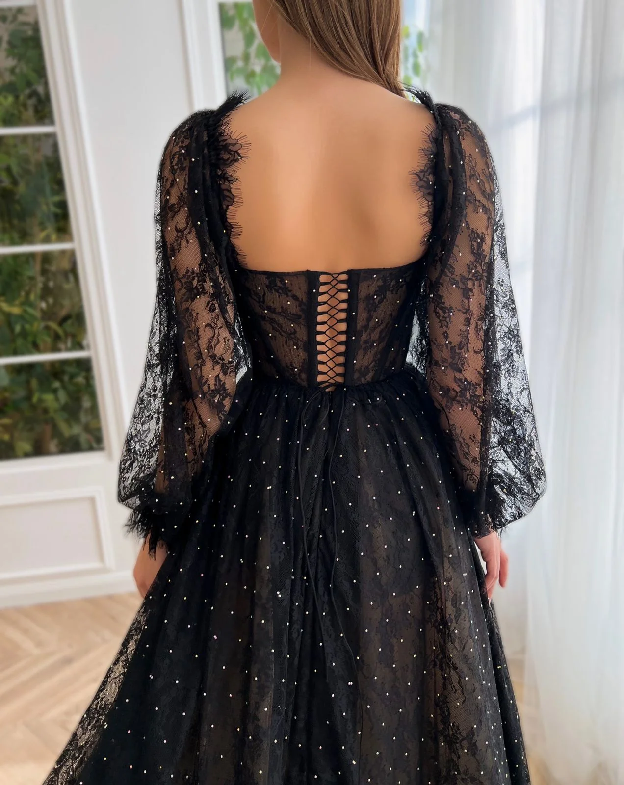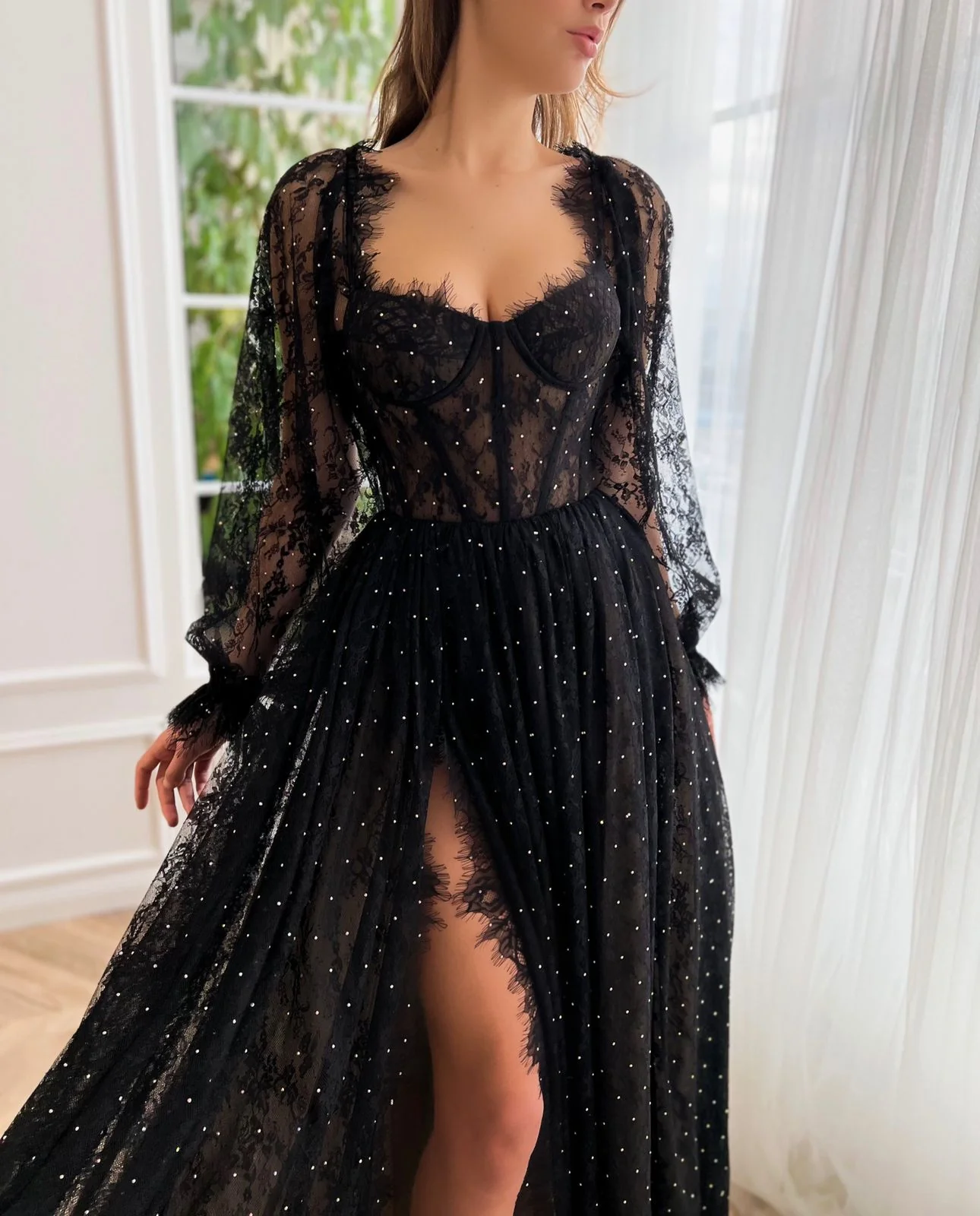 Immerse into the night with a captivating black gown. Sheer puffy sleeves dance down your arms, while a beautiful leg slit show off your leg elegantly. All together, this gown is easy to wear, but impossible to forget.