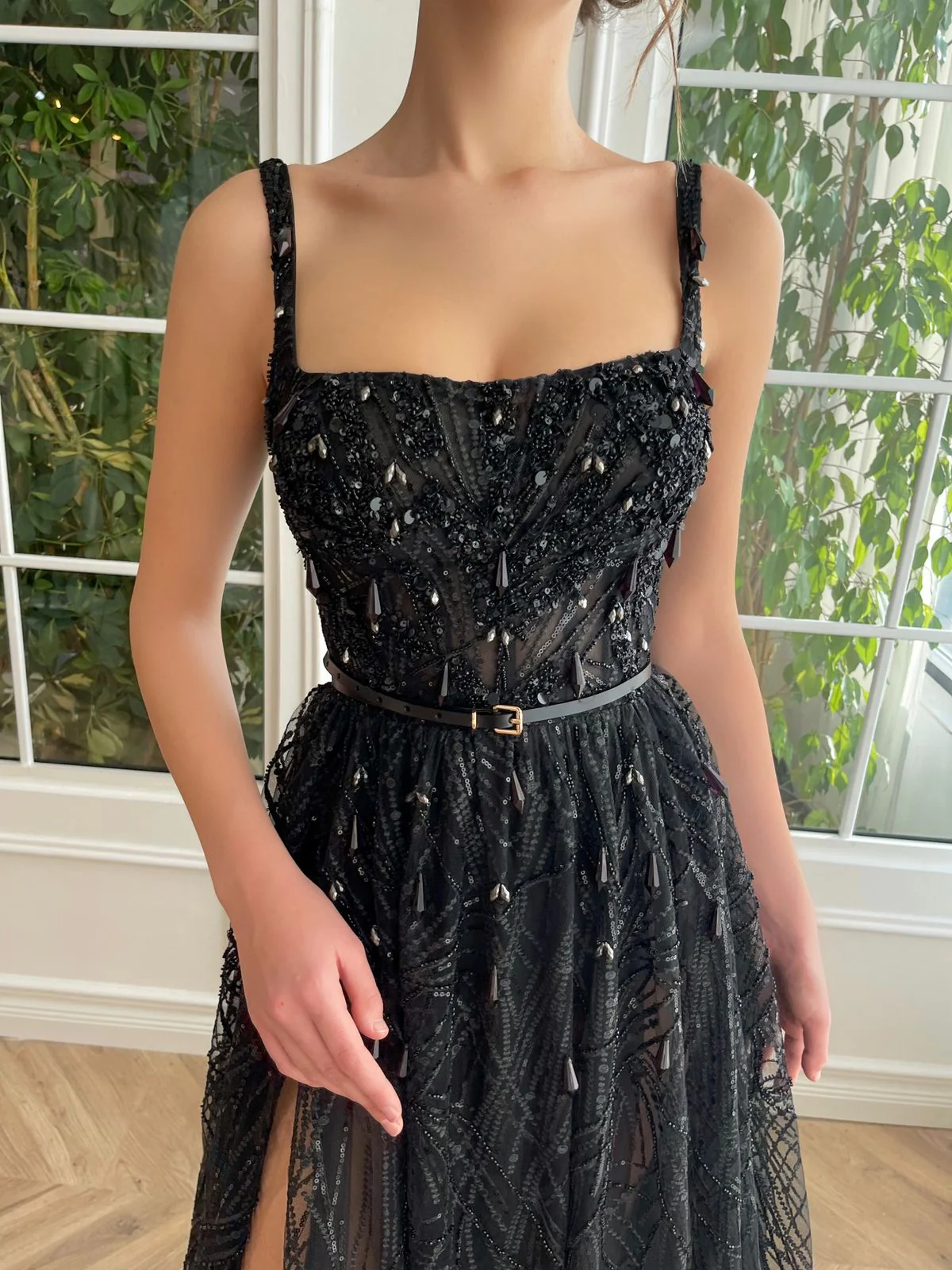 The strong royal black stands out in a statement gown with exaggerated embellishments. Its cinched waist embraces the body in figure-defining forms while the leg slit shows off your leg beautifully.