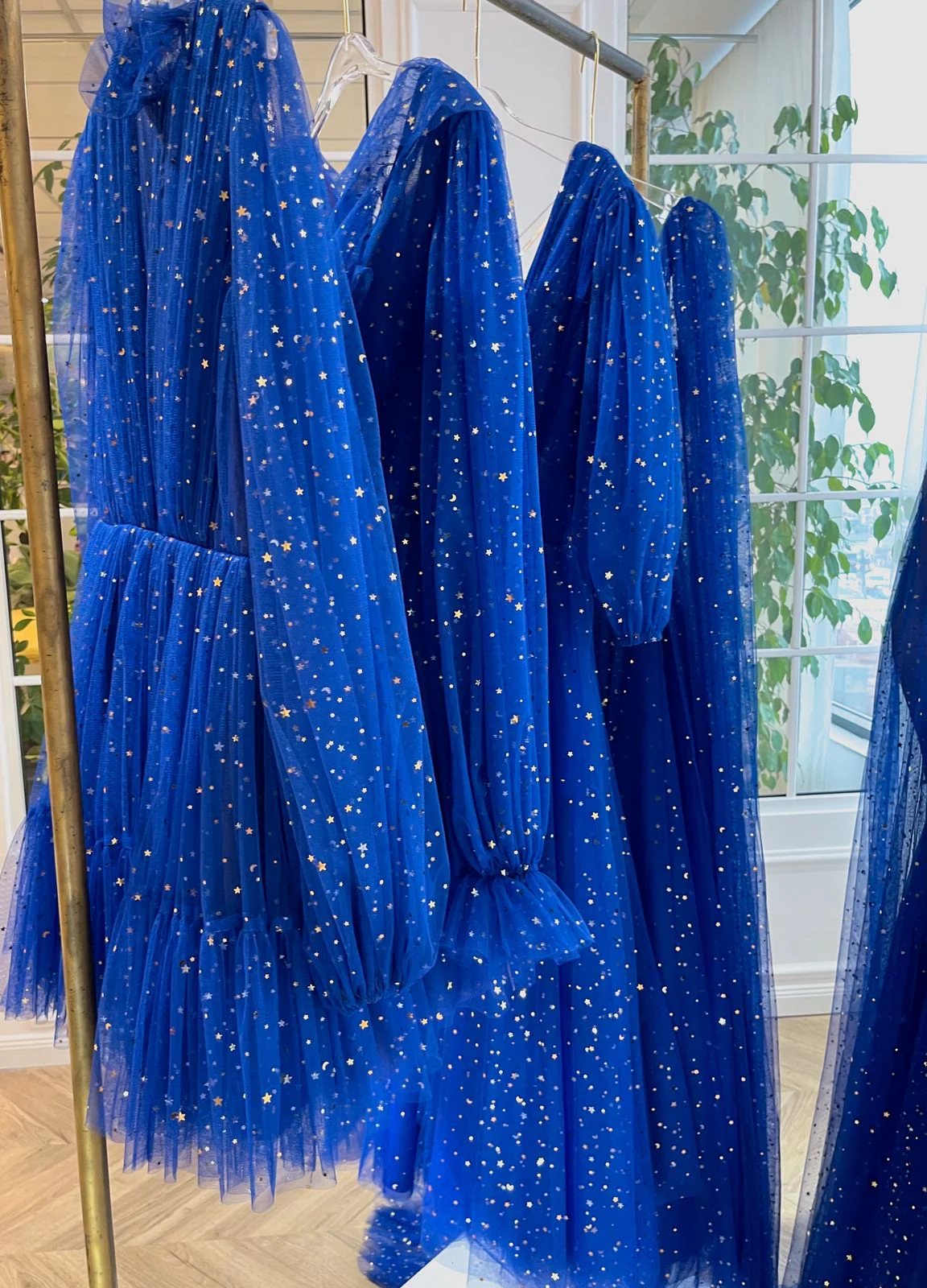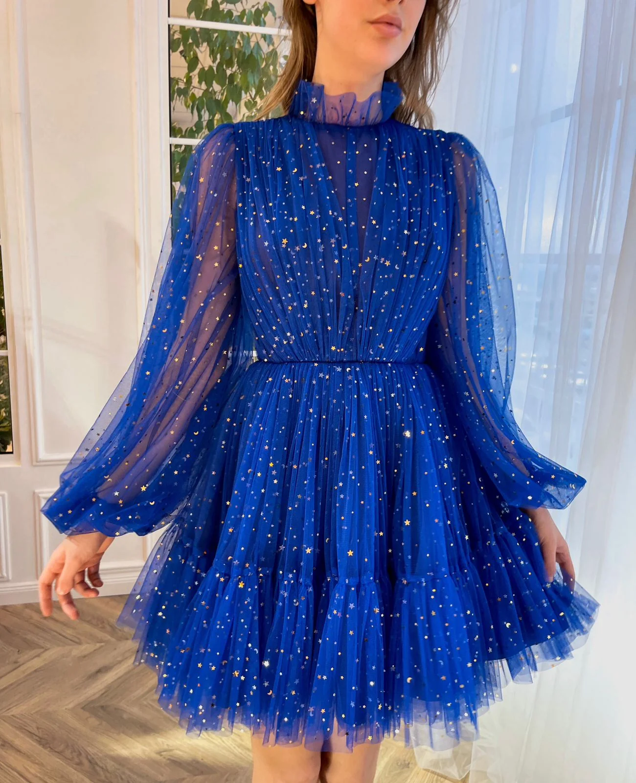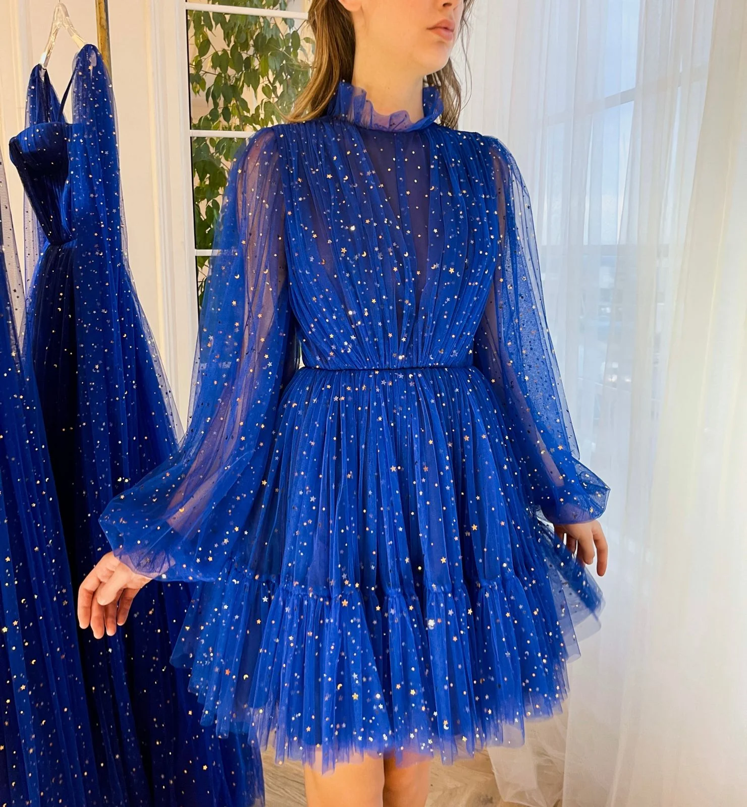 Swept away by a striking royal blue mini dress. Its starry tulle cobalt fabric looks stunning with the long bishop sleeves and ruffled collar. The perfect length of a mini dress that flows naturally as you move.