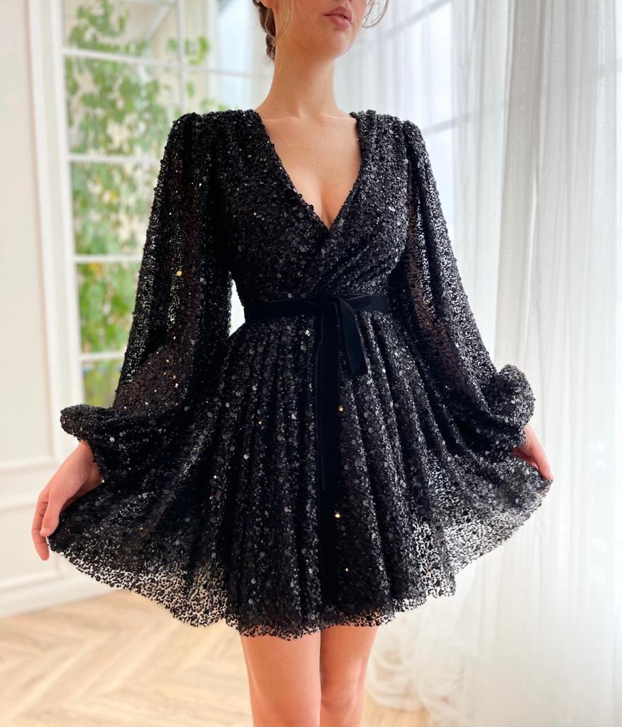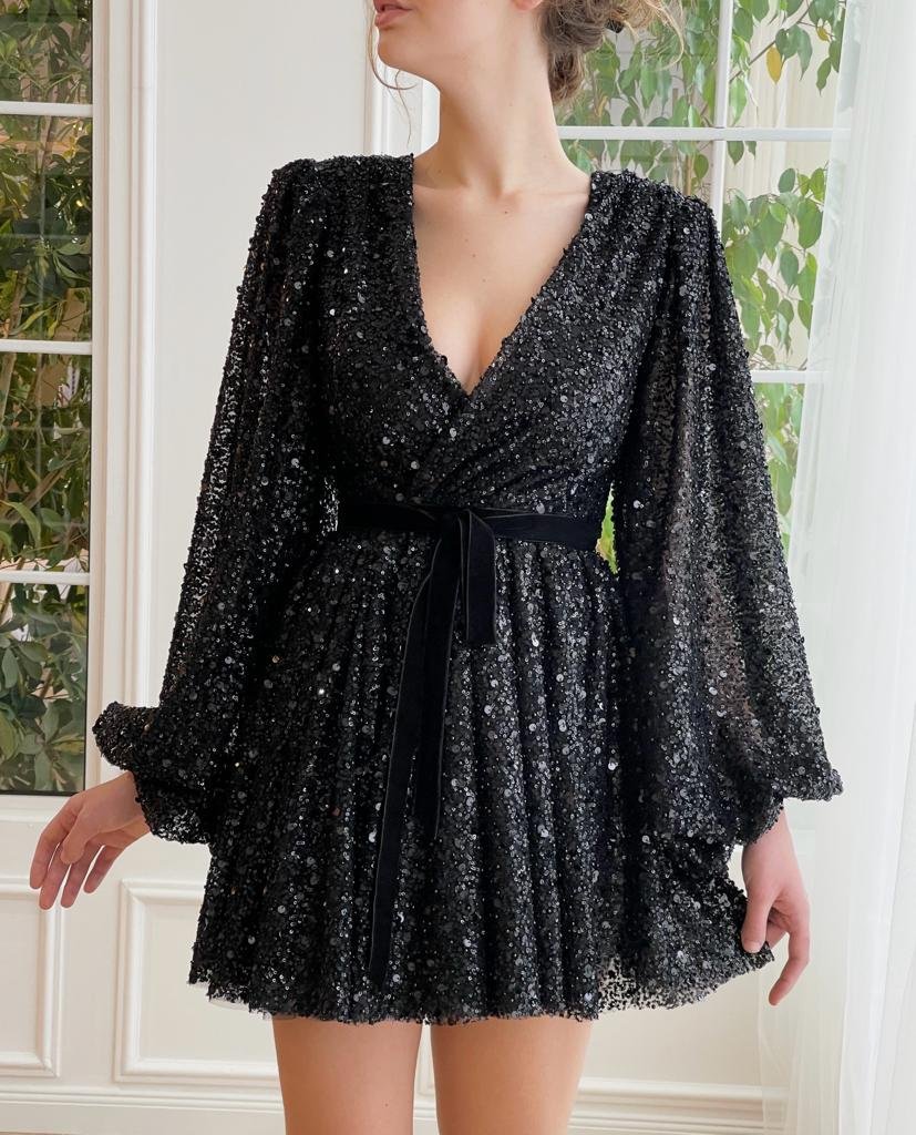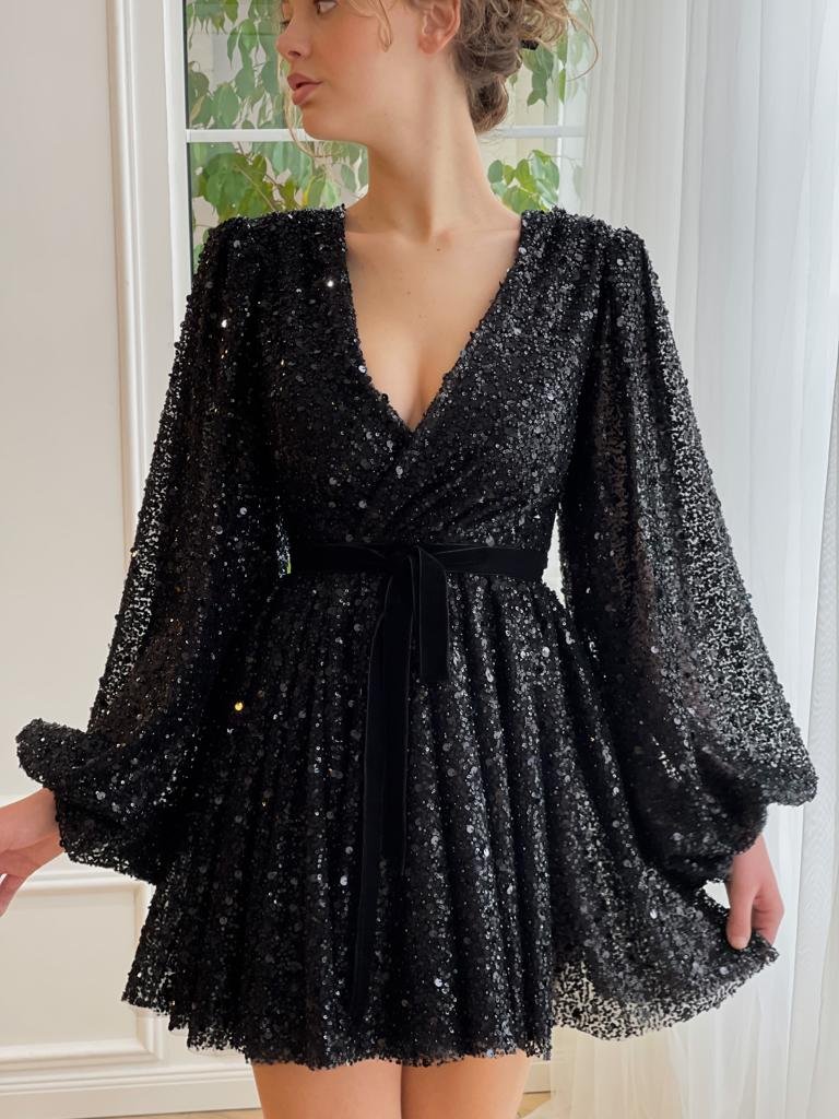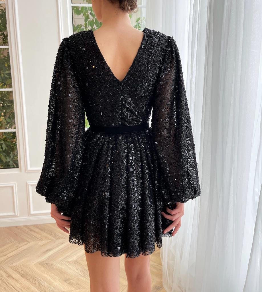 Statement mini dress made of black shimmering lace fabric wraps into an elegant V-neckline. Long puffy sleeves and its cinched waist give the most magical silhouette.