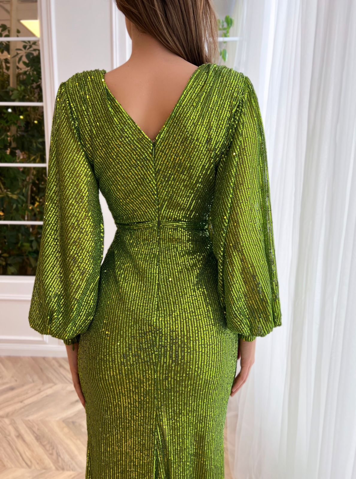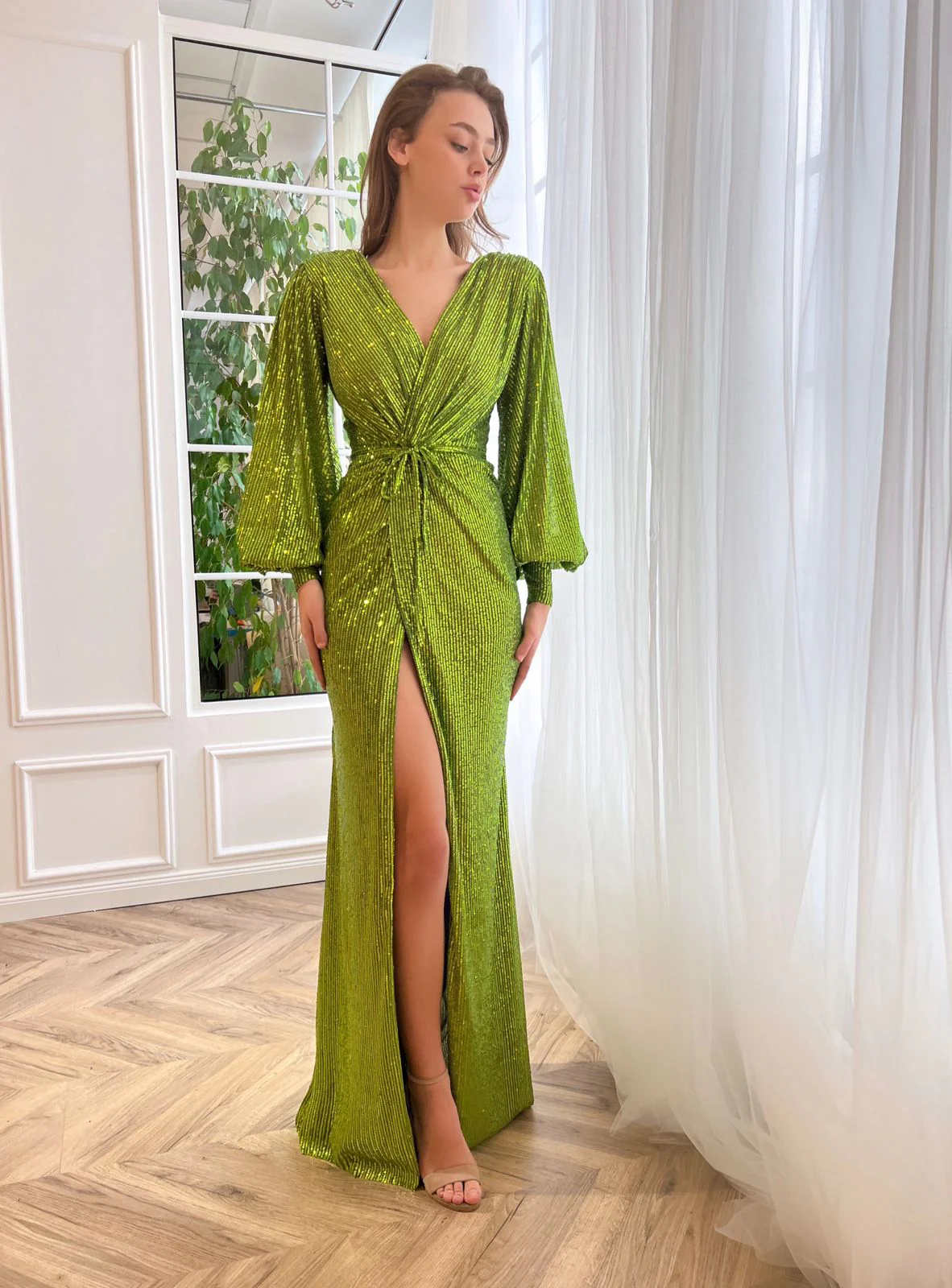Forever shimmering fabric in contemporary cuts and shapes evoke sensual femininity. Long puffy sleeves complement the draped wrap dress, while its floor-sweeping length adds to the magic.