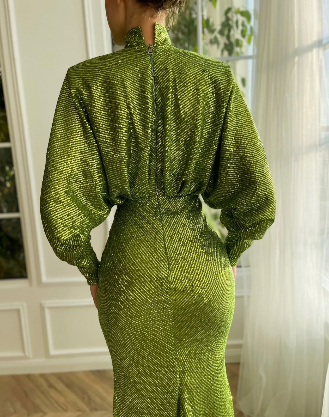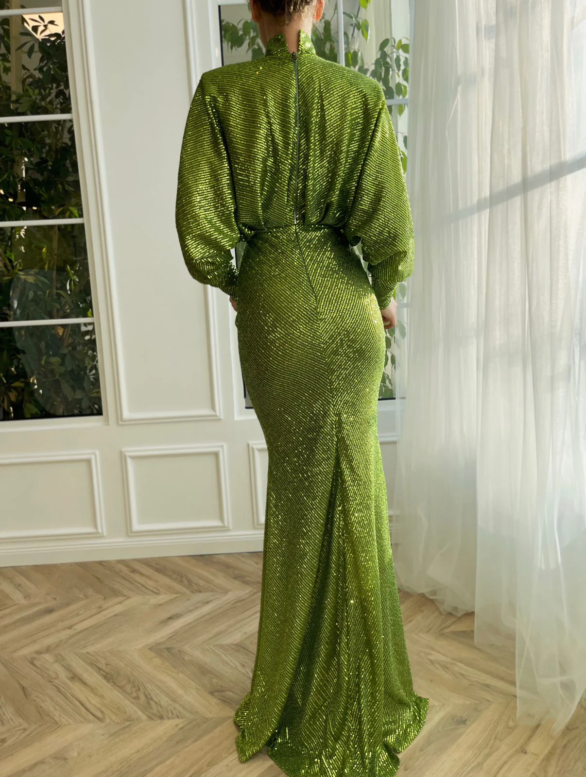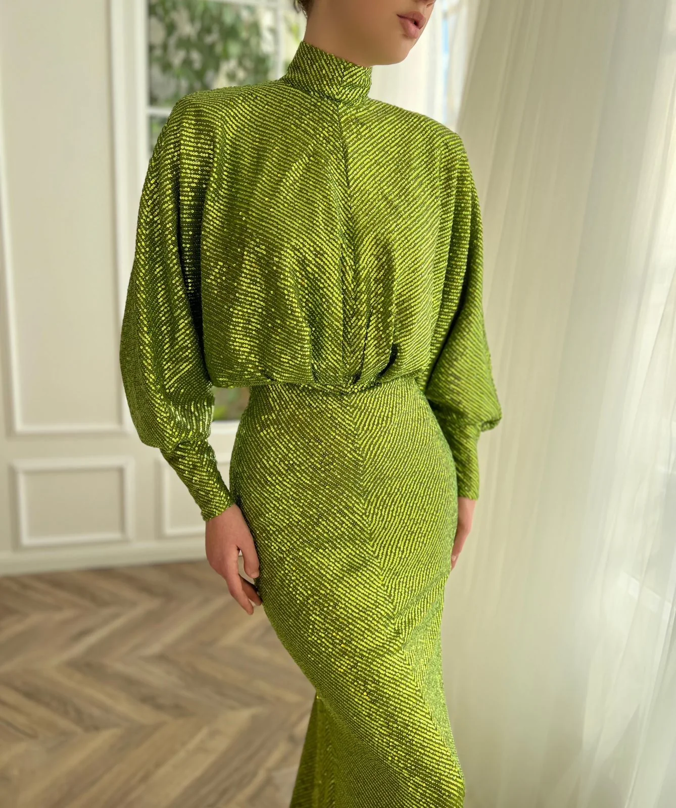 Let yourself be carried away by the breathtaking vivid green dress. Its sparkling lace fabric gives an unparalleled charm to your appearance. Carefully crafted, the loose turtleneck and mermaid silhouette complement each other beautifully.