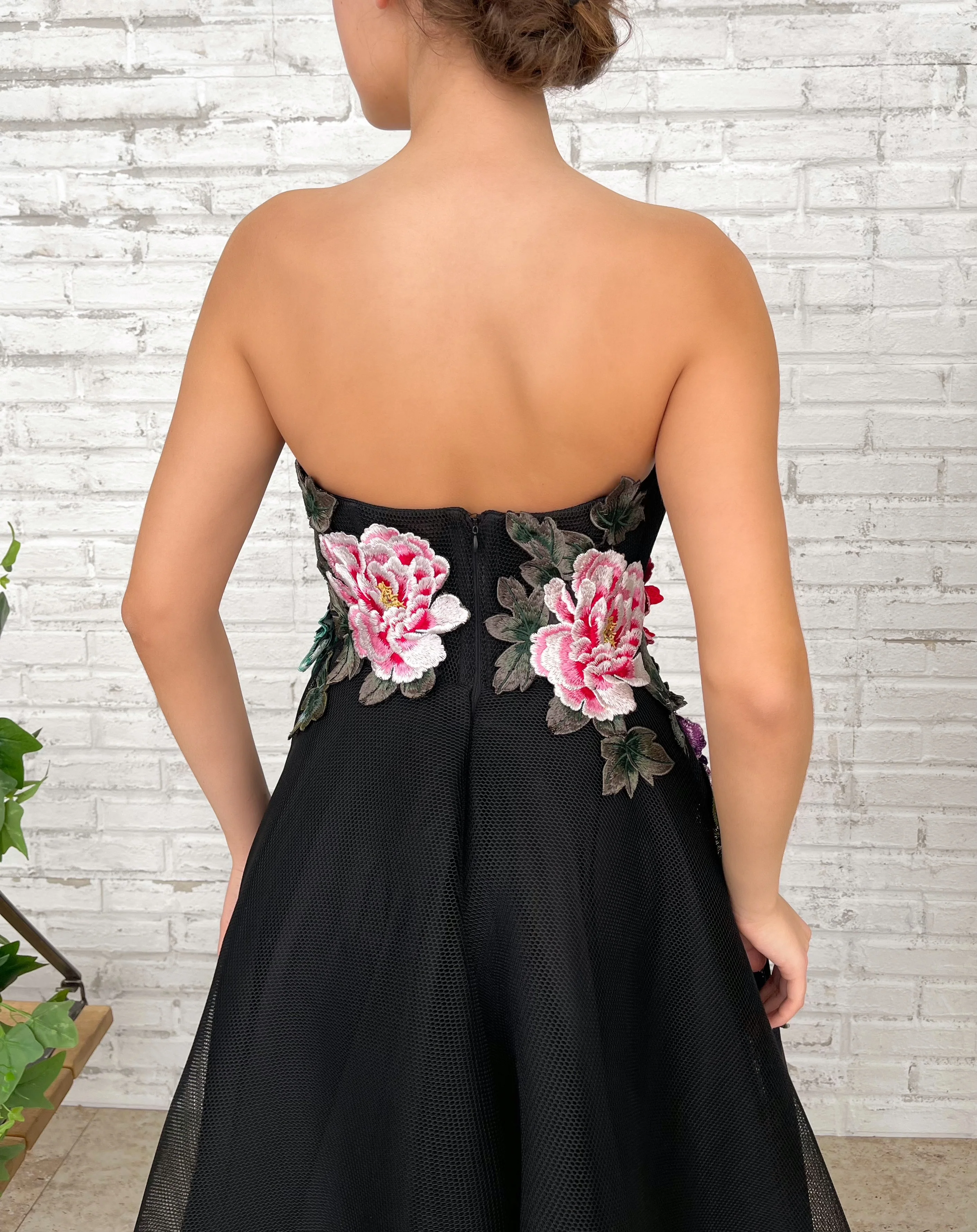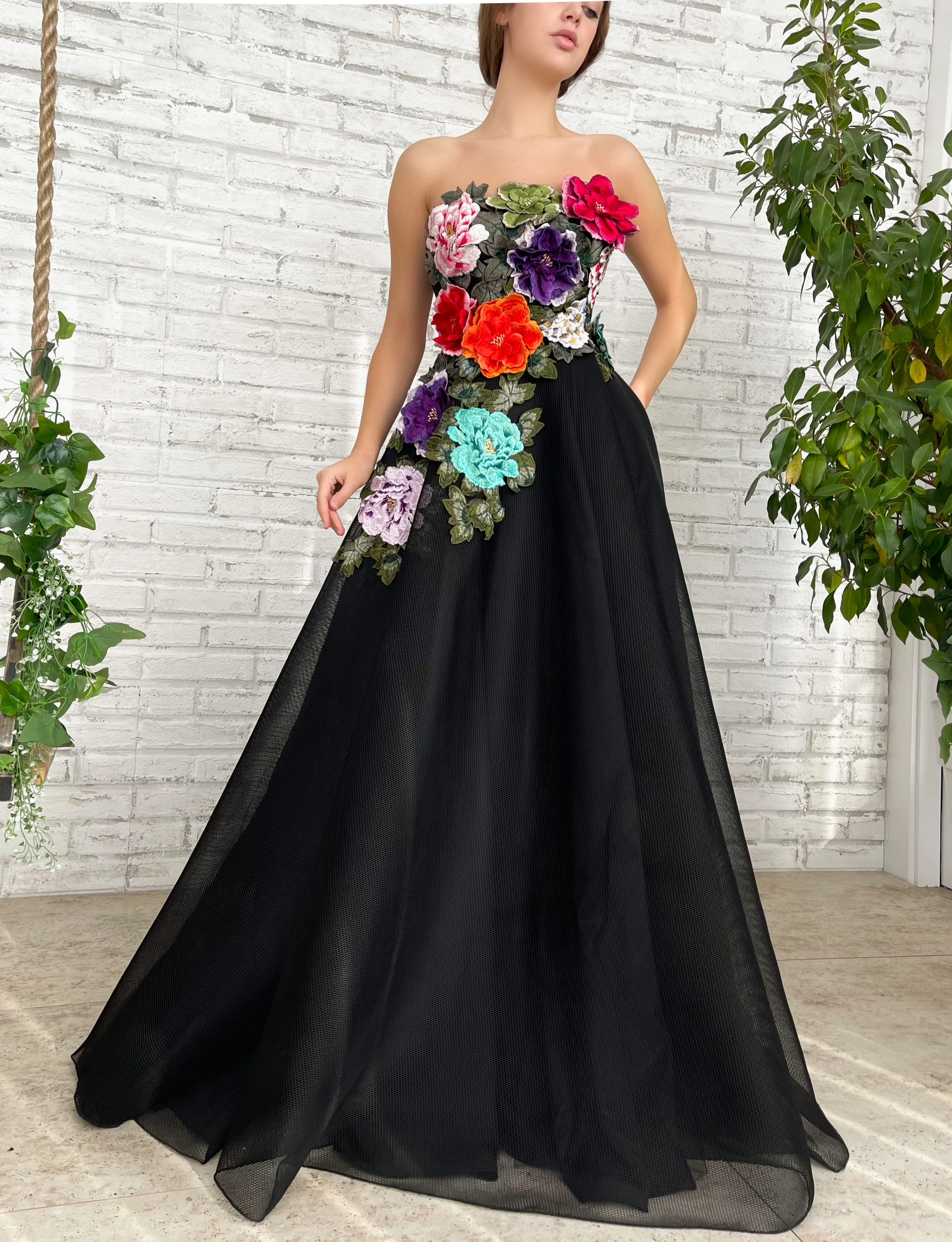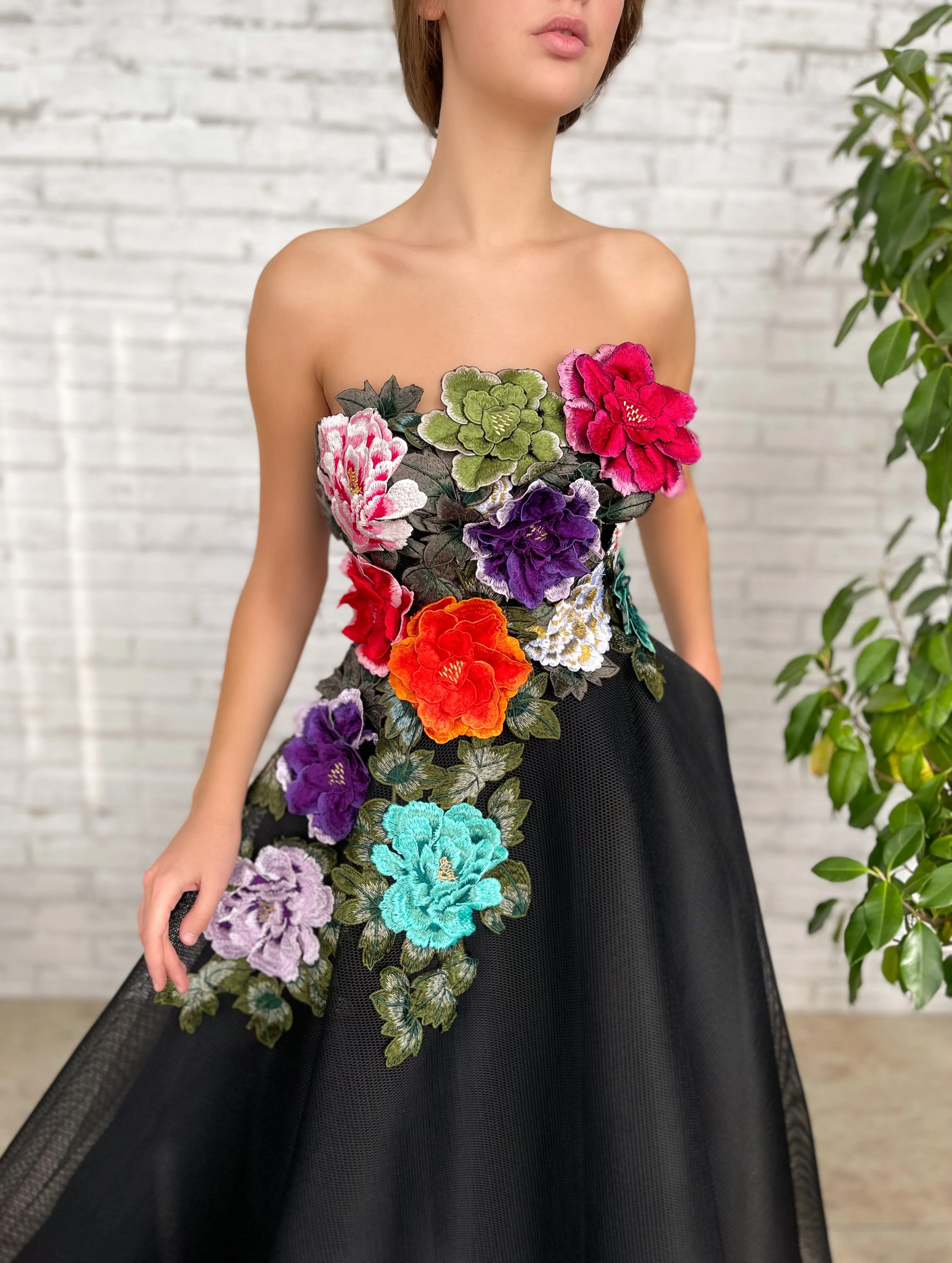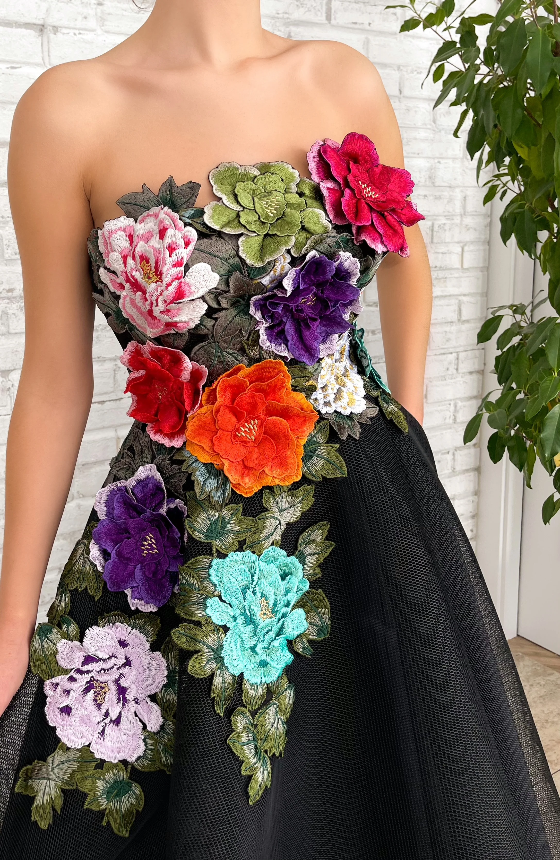 -Embellished with embroidered flowers and green leaves