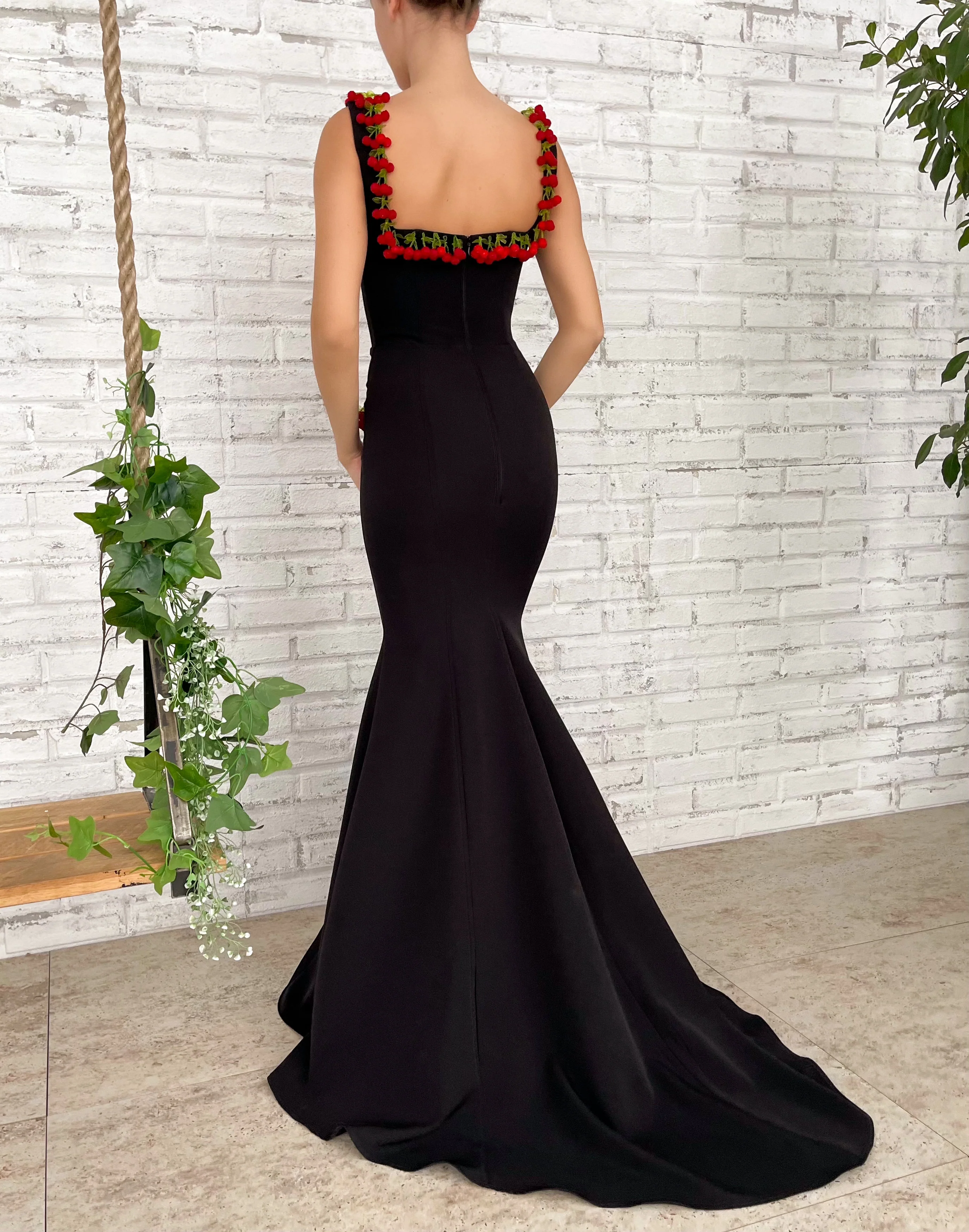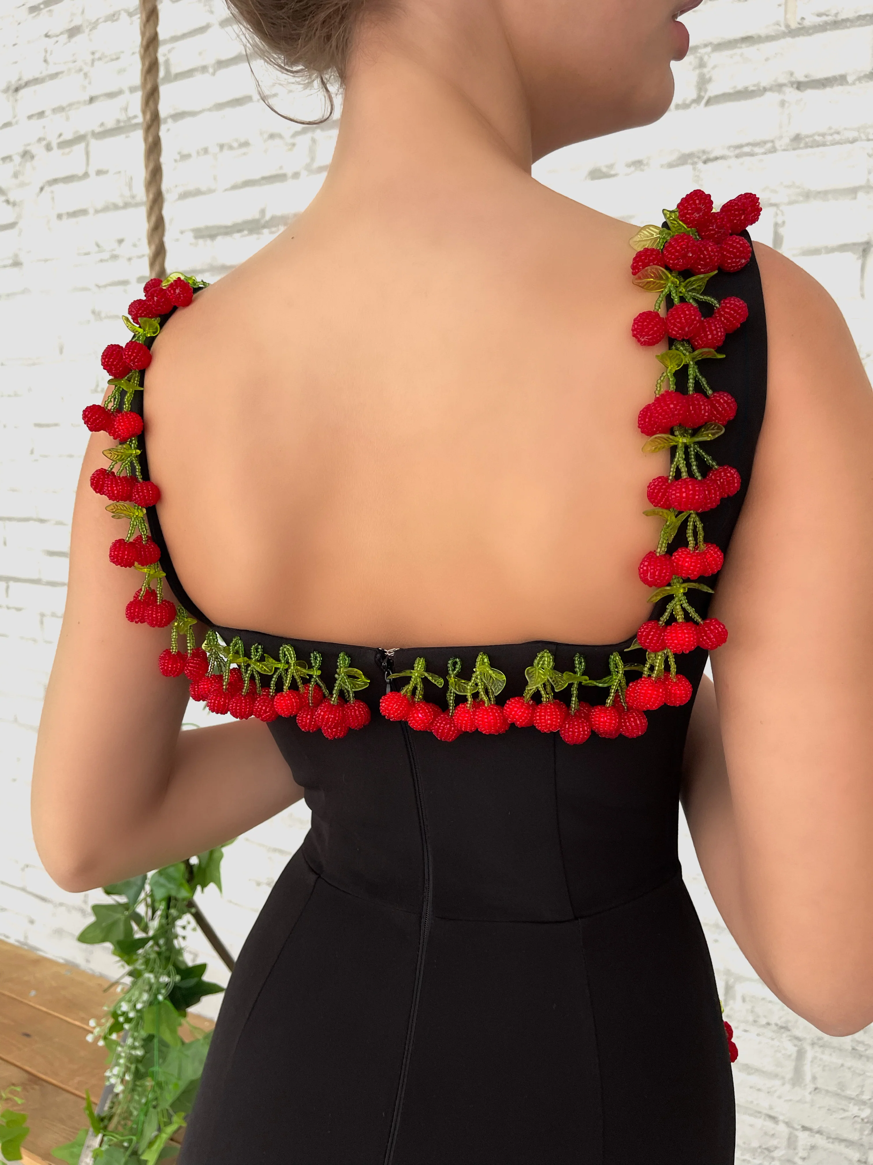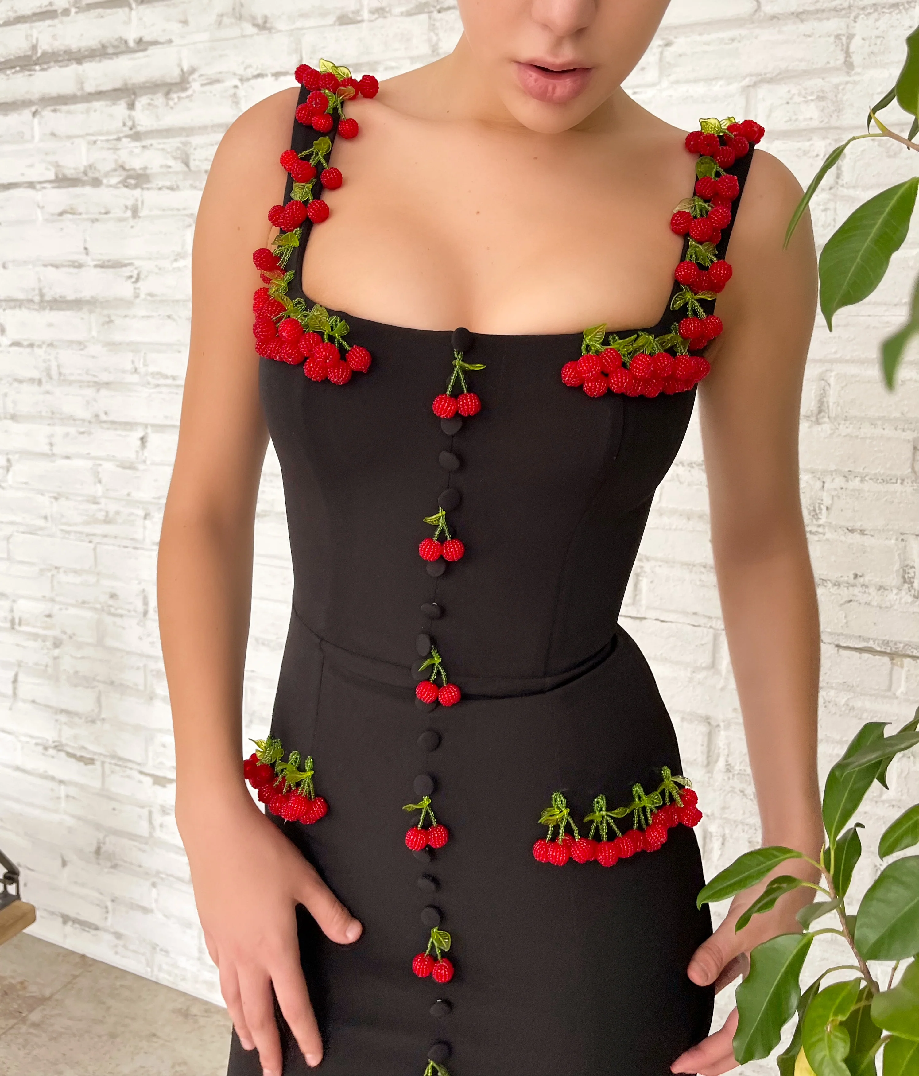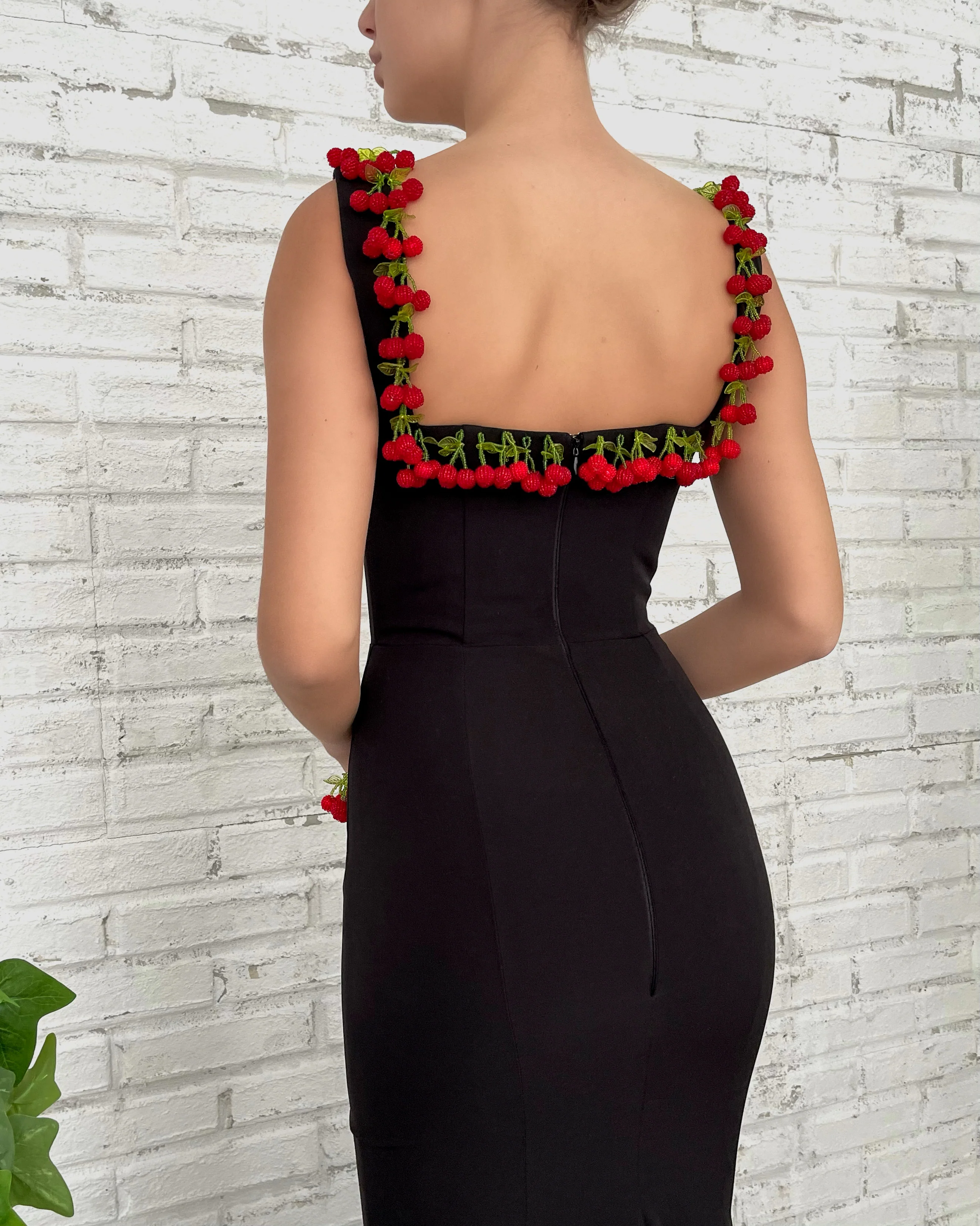 Sweet cherries taste better with a hint of darkness. Our unique black fabric blends with delicious fruits on our Cherry Cocktail Gown. Live your most elegant life with a shot of sweetness.