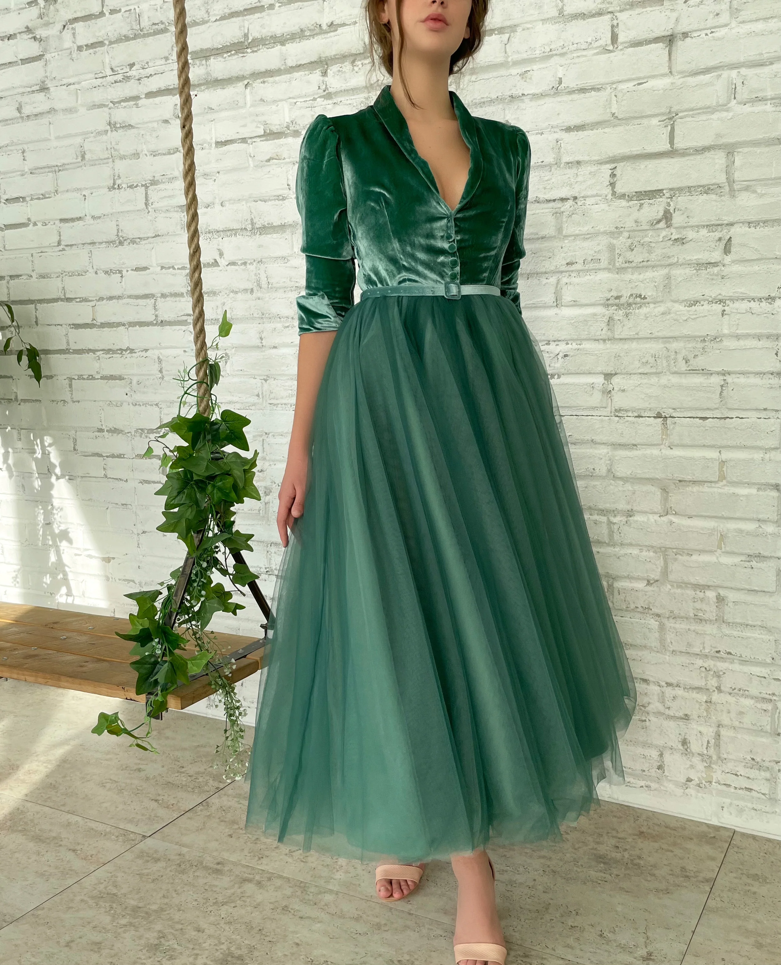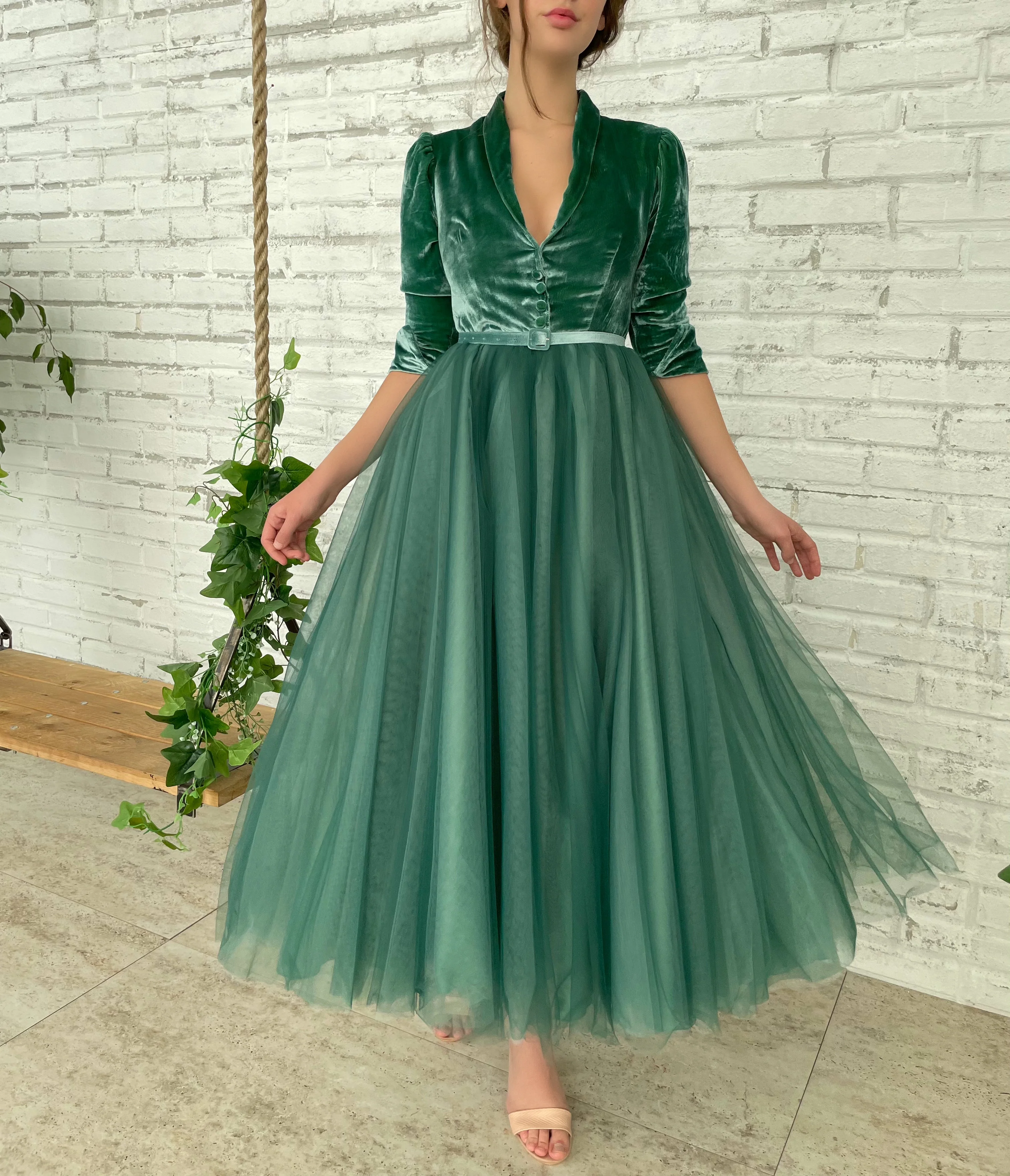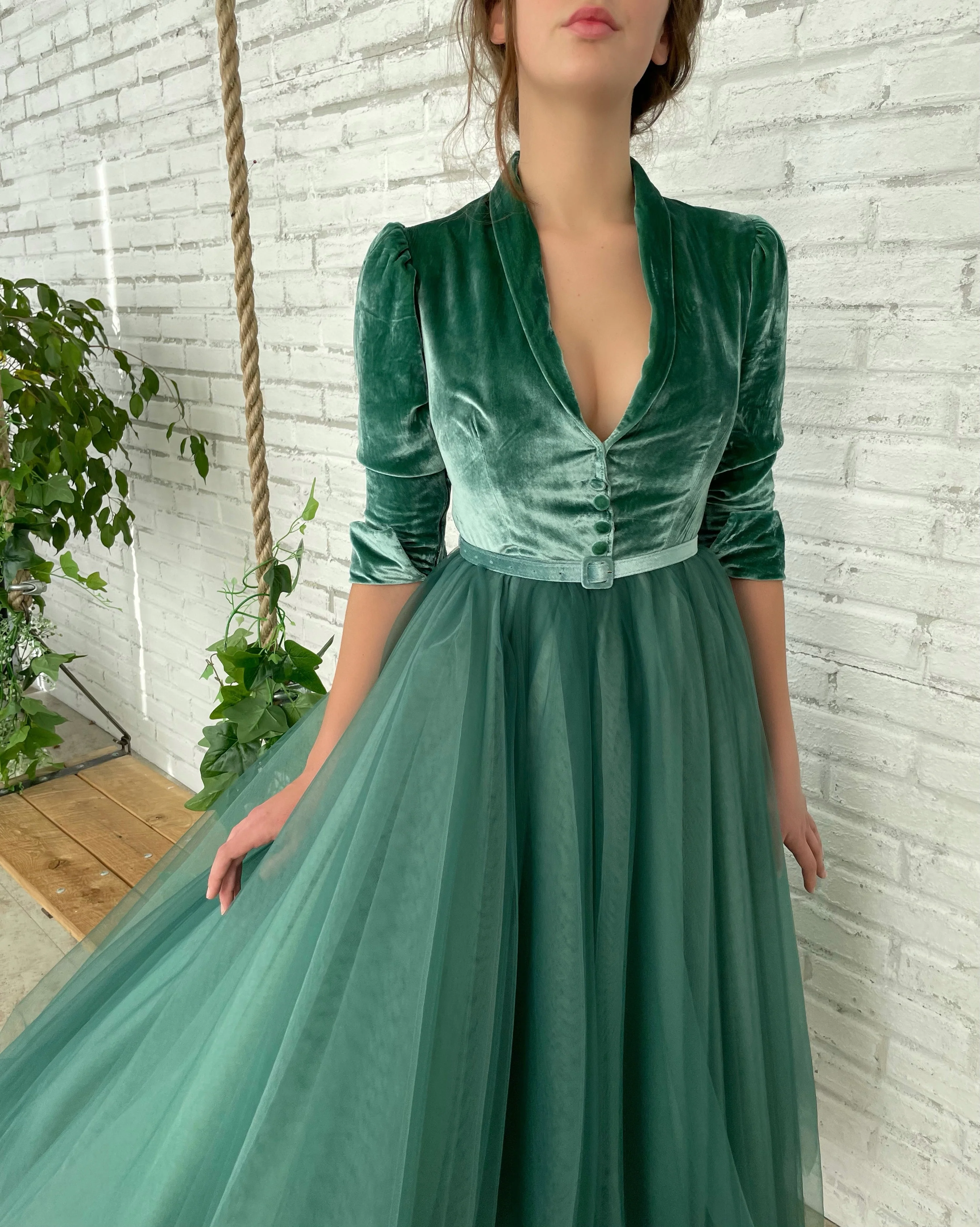 -Decorative buttons and green velvet belt