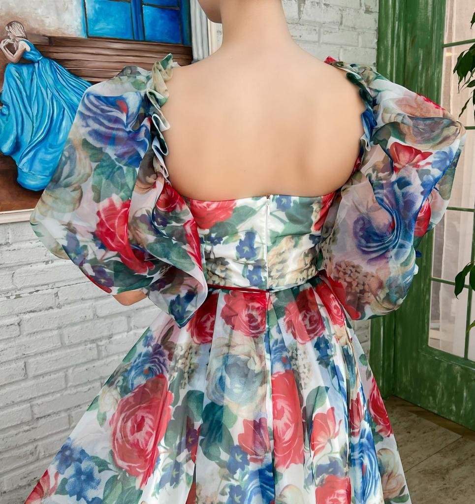- Organza fabric in a painted multi-colored print